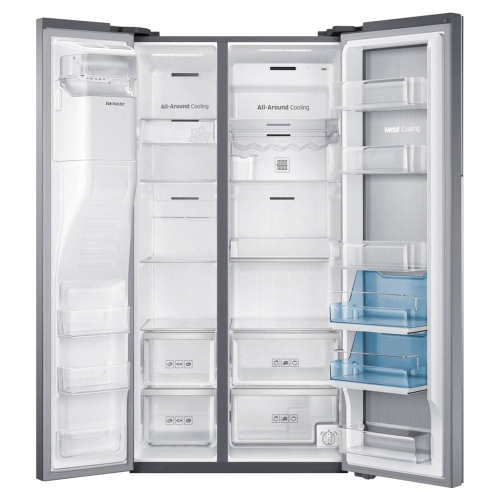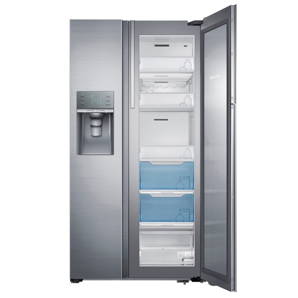 یخچال ساید بای ساید سامسونگ RH77 جزو بهترین و خوش طرح ترین مدل های موجود در بازار می باشد که سامسونگ با در نظر گرفتن یک سری امکانات و ویژگی ها برای آن خواست تا نیاز کاربران را تا حد زیادی برطرف سازد. ظرفیت کلی این ساید بای ساید سامسونگ 768 لیتر یا همان 34 فوت است که بخش زیادی از آن برای قسمت یخچال و بخشی نیز برای فریزر می باشد. اگر هر کدام از درب های ساید بای ساید سامسونگ را باز کنید با تعداد زیادی از قفسه ها و طبقه ها مواجه میشوید که هر کدام یک به کاربر اجازه انباشته کردن حجم زیادی از مواد غذایی را می دهند. همچنین موتور اینورتر دیجیتال در این یخچال هم از نظر میزان مصرف انرژی، هم از نظر تولید صدا و هم از نظر طول عمر در حد بسیار عالی عمل می کند. به لطف تعریف کردن سیستم جریان هوای چندگانه Multi Flow در این مدل یخچال با انتقال خنک کنندگی به هر نقطه از یخچال مواد خوراکی تا مدت زمان طولانی سالم و با کیفیت باقی می مانند. حال دو قابلیت آب سرد کن و یخ ساز برای ساید بای ساید سامسونگ در نظر گرفته شده اند که در کوتاه ترین زمان آب و یخ سالمی را در اختیارتان می گذارد. یکی از بهترین نقطه قوت های قسمت فریزر این یخچال سامسونگ قابلیت CoolSelect Zone است که امکان تنظیم دمای مواد خوراکی را بسته به مواد نگه داری شده می دهد. طراحی محافظ خنک کننده ی فلزی (Metal Cooling) در این ساید بای ساید سامسونگ مانع از خروج هوای سرد و خنک به بیرون می شود. همچنین طراحی ساید بای ساید سامسونگ همراه با رنگ بسیار زیبای نقره ای اش جلوه ای شیک به آن بخشیده که به راحتی خود را در کنار دیگر وسایل آشپزخانه جای می دهد.