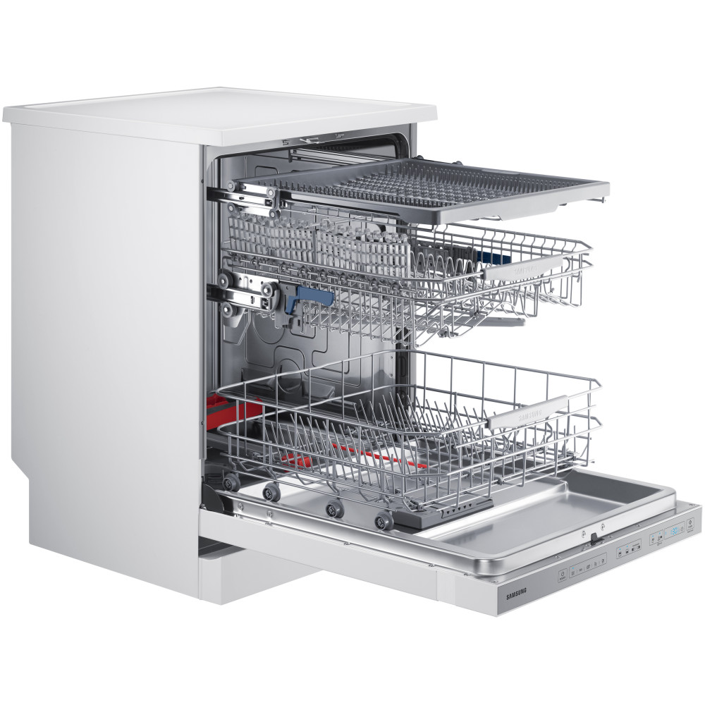 - قابلیت Energy Saver برای صرفه جویی در مصرف انرژی فناوری Sanitized برای شستشوی بهداشتی و ضدعفونی کردن ظروف دارای طبقه یا سبد بالا (Extra Space 3rd Basket) مخصوص قرارگیری قاشق، چنگال و ظروف کوچک دارای نشانگر پر کردن مجدد جلادهنده (Rinse Aid Refill Indicator) قابلیت شروع شستشو با تاخیر از 1 تا 24 ساعت مجهز به قابلیت Delay Start برای شروع شستشو با تاخیر قابلیت Half Load برای شستشوی ظروف با نصف ظرفیت قابلیت Auto Door Open برای باز شدن خودکار درب بعد از اتمام شستشو دارای قیف (Funnel) برای پر کردن مخزن نمک ماشین ظرفشویی دارای مخزن مواد شوینده و جلادهنده (Detergent and Rinse-Aid Dispenser) تضمین عملکرد و کارایی موتور Digital inverter تا 10 سال توسط سامسونگ شستشوی اقتصادی (Eco) در 235 دقیقه قابلیت تنظیم ارتفاع طبقات یا سبد ها در 3 سطح مختلف تکنولوژی WaterWall برای اسپری آب با فشار زیاد به صورت رفت و برگشتی روی ریل خطی و شستشوی موثرتر ظروف دارای چرخه Intensive برای شستشوی ظروف بسیار کثیف دارای 2 بازوی آبپاش چرخشی (Upper Spray Arm و Lower Spray Arm) قابلیت Extra Dry برای خشک کردن بهتر ظروف قابلیت Zone Booster برای یک شستشوی سریع و دقیق و از بین بردن لکه های سرسخت دارای سیستم تمیز کردن خودکار با فیلتر 3 مرحله ای (Self-cleaning Filter System) برنامه Delicate برای شستشوی ظروف ظریف و شیشهای قابلیت Control Lock برای قفل کردن پنل کنترلی ماشین ظرفشویی دارای نشانگر پر کردن مجدد جلادهنده (Rinse Aid Refill Icon) دارای نشانگر پر کردن مجدد نمک (Salt Refill Icon) سیستم Aqua-Stop برای جلوگیری از نشت آب موتور Digital Inverter با طول عمر بالا و صرفه جویی در مصرف آب و انرژی و کاهش سطح صدا محفظه داخلی ماشین ظرفشویی از جنس فولاد ضد زنگ (Stainless Steel)