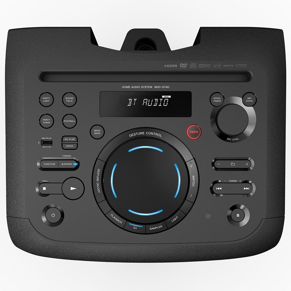 سیستم صوتی سونی MHC-GT4D یا GT4 یکی از سیستم صوتی های سری MHC برند سونی است که در سال 2017 تولید و به بازار عرضه شده است. این محصول یکی از بهترین سیستم صوتی های سونی در سال 2017 است و اگر به مهمانی های خانگی و جشن ها بیشتر علاقه دارید این دستگاهی است که ممکن است به آن نیاز داشته باشید. این سیستم صوتی ادعا می کند که بهترین خروجی موسیقی را در هر زمان و در هر مکان در اختیار شما قرار می دهد. این سیستم صوتی خانگی سونی دارای گزینه های پخش و اتصال متعددی است و به شما این امکان را می دهد تا بتوانید موسیقی خود را از طریق منابع مختلف از جمله CD، DVD، رادیو FM و حتی درایوهای فلش USB پخش کنید. این محصول ممکن است در بازار به اشتباه با مدل سیستم صوتی شیک سونی GT4 نیز شناخته و معرفی شود. متاسفانه سونی در رابطه با تعداد کانال صدا و توان خروجی این سیستم صوتی اطلاعاتی را منتشر نکرده است اما بنا به بررسی هایی که انجام شده است این سیستم صوتی دارای تعداد 2 کانال صدا است و 3 بلندگو دارد که شامل 2 بلندگوی (Mid Unit) 80 میلیمتری در بالای بدنه ی دستگاه و یک عدد توییتر 40 میلیمتری که در بدنه ی اصلی دستگاه قرار گرفته است. بلندگوهای این سیستم صوتی به طور تقریبی می توانند قدرت خروجی صدای 1600 وات را در اختیار شما قرار دهند. سیستم صوتی 2 کاناله ی سونی MHC-GT4D دارای پخش صدای همه جانبه و خوبی است و می تواند صداها را با کیفیت بالایی پخش کند به همین دلیل برای استفاده در مهمانی ها و جشن ها بسیار مناسب است. این سیستم صوتی به تعدادی پورت اتصال و ویژگی های هوشمند مجهز شده است که به شما امکان پخش موسیقی به صورت بی سیم از طریق بلوتوث را می دهد. ضمن اینکه دارای چراغ های مهمانی، جلوه های صوتی DJ و همچنین حالت کارائوکه است که در ادامه در مورد هر کدام از ویژگی های مذکور اطلاعاتی را در اختیار شما قرار می دهیم.