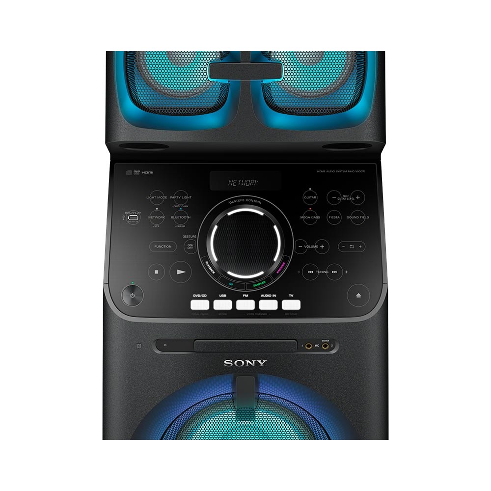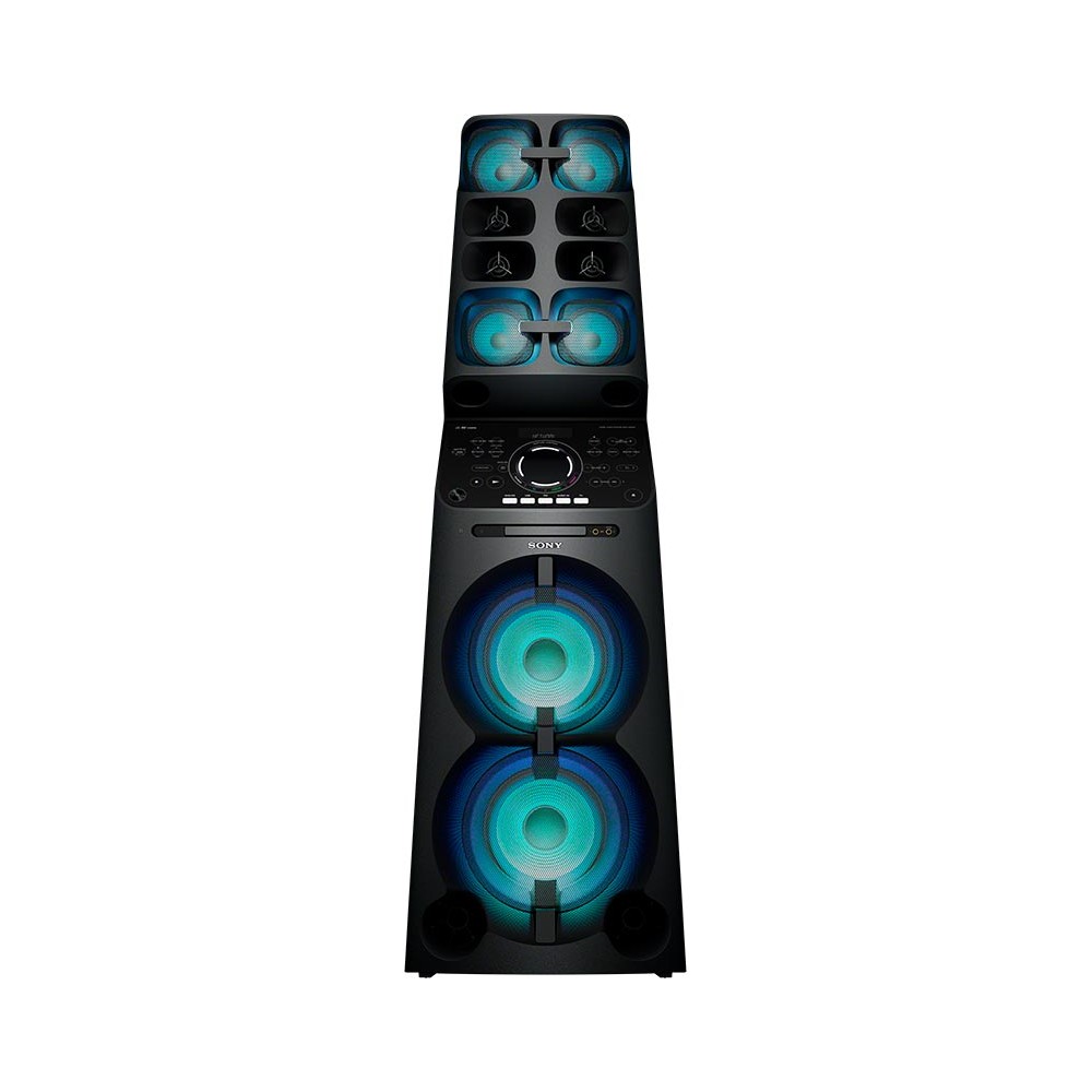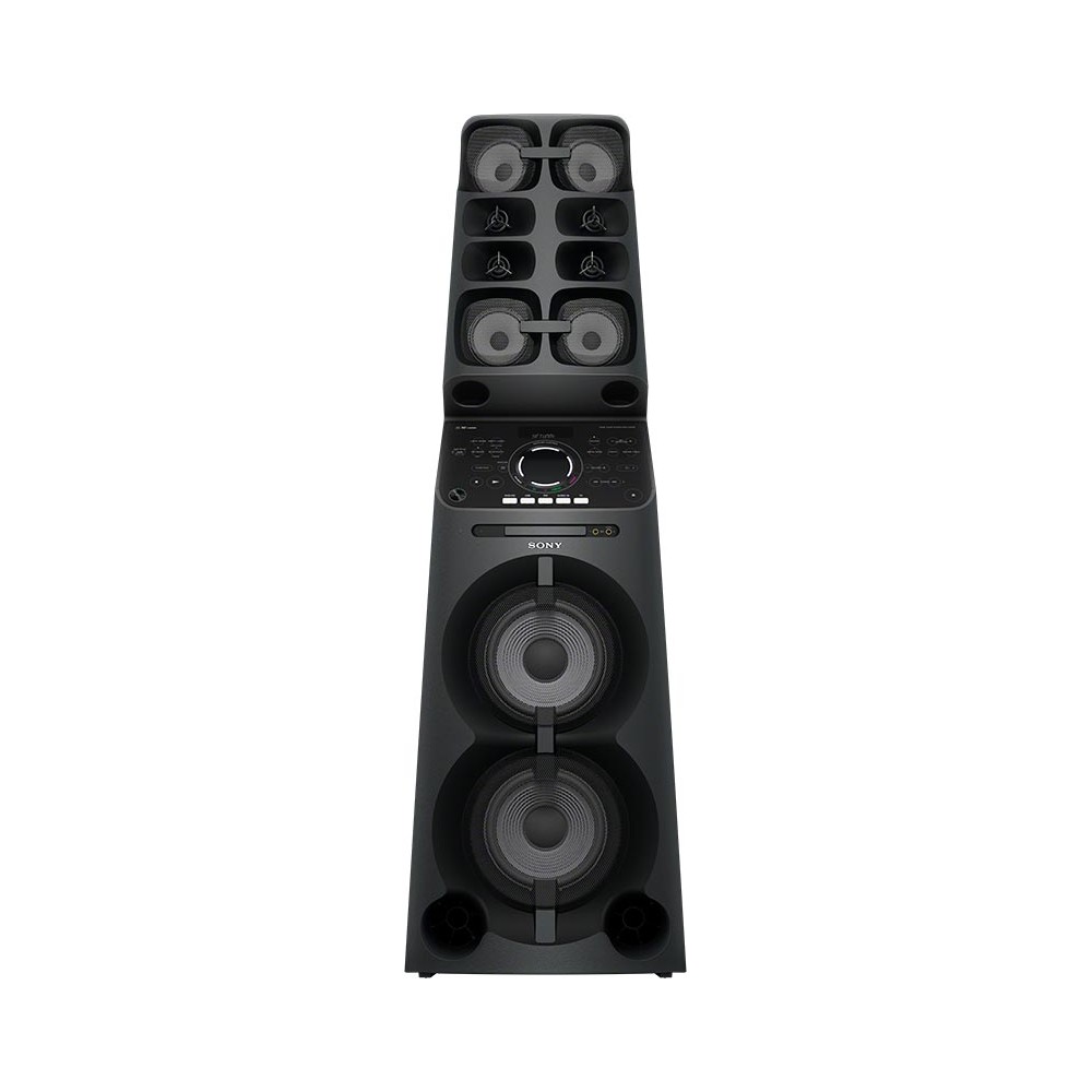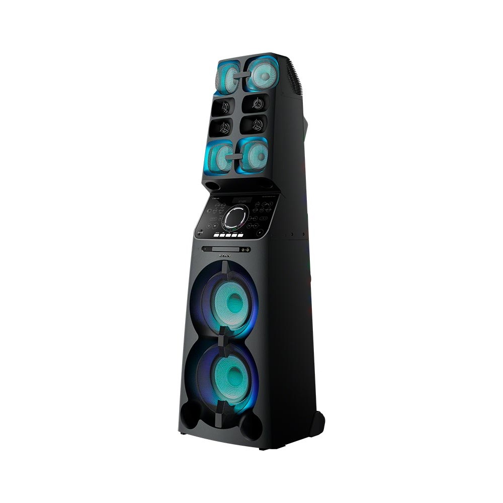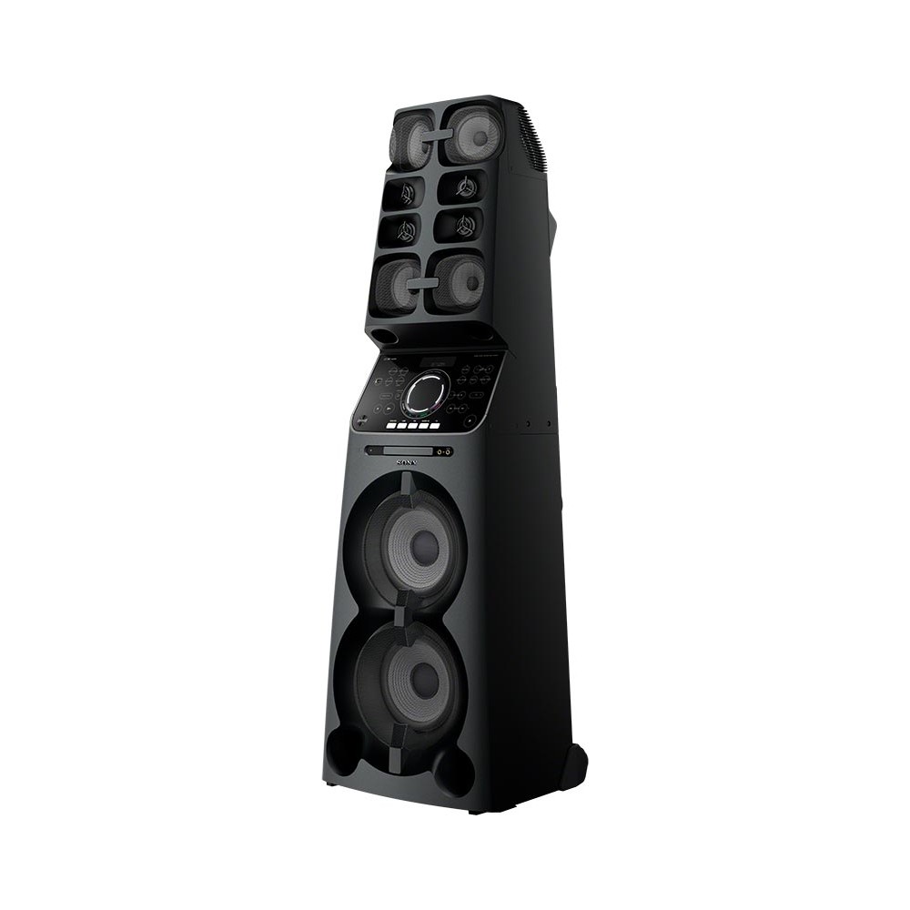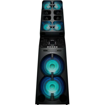 سیستم صوتی سونی MHC-V90DW یا V90 جزو سیستم های صوتی 2018 سونی به حساب می آید. سیستم صوتی موتکی (MUTEKI) سونی V90DW در واقع بهترین و قدرتمند ترین سیستم صوتی سونی سری MHC در سال 2018 می باشد. این محصول که با مدل MHC-V90DW E12 نیز ممکن است شناخته شود، در بازار کشور ما اشتباهی به مدل سیستم صوتی شیک سونی V90 معروف شده است. Muteki یا MU.TE.KI در واقع کلمه ژاپنی می باشد. سونی این کلمه را به صورت بسیار محدود در برخی از محصولات خاص خود استفاده کرده است. منظور سونی از Muteki در واقع محصولی با ابعاد بزرگ و کیفیت ساخت بالا می باشد که صدای شفاف و بسیار قدرتمندی دارد به طوری که قدرت صدای آن، شما را هیجان زده کرده و محیط اطراف را به لرزه می اندازد. متاسفانه سونی درباره تعداد کانال صدای سیستم صوتی موتاکی سونی V90DW اطلاعات رسمی را اعلام نکرده است. اما طبق بررسی هایی که ما انجام داده ایم، این مدل دارای سیستم صوتی 2.1 کاناله می باشد و صدای استریو دارد. سیستم صوتی 2.1 کاناله سونی MHC-V90 مجهز به 10 بلندگو شامل 4 بلندگوی میدرنج 130 میلیمتری، 4 بلندگوی توییتر 50 میلیمتری و 2 بلندگوی ساب ووفر 250 میلیمتری می باشد. سونی درباره توان خروجی سیستم صوتی مذکور اطلاعاتی را اعلام نکرده است اما به طور تقریبی توان خروجی 2400 وات را در اختیار کاربر قرار می دهد. 2 بلندگوی میدرنج بالایی این محصول از نوع پشت باز و زاویه دار هستند و قابلیت Spread Sound Generator دارند تا صدا را از زوایای مختلف با وضوح بیشتری به گوش شنونده برسانند. 2 بلندگوی ساب ووفر آن به لطف 2 حفره Bass Reflex که در قسمت پایین این سیستم صوتی قرار دارند صدای باس بسیار قدرتمندی را تولید می کنند تا از فواصل بیشتری بتوانید صدای بیس را احساس نمایید. علاوه بر آن سونی برای تقویت صدای باس در این مدل قابلیت Mega Bass را نیز قرار داده است تا با فعال کردن آن صدای باس قدرتمند تری را تجربه نمایید. تا اینجا با توجه به موارد گفته شده، این دستگاه گزینه عالی و ایده آل برای استفاده در مهمانی ها می باشد و اشخاص حاضر در جشن را به وجد می آورد. سیستم صوتی 2400 وات سونی MHC-V90DW صدای پر قدرتی دارد اما اگر به دنبال صدایی با قدرت بیشتر هستید تنها کافی است تا از قابلیت Wireless Party Chain در سیستم صوتی مذکور استفاده کنید. شما می توانید به کمک این قابلیت حداکثر 10 سیستم صوتی مختلف که از این قابلیت پشتیبانی می کنند را به صورت بی سیم و از طریق وای فای به هم متصل نمایید تا از شنیدن قدرت صدای چند برابر حیرت زده شوید. همچنین به کمک قابلیت Party Chain (Wired) نیز می توانید چند سیستم صوتی سازگار را با سیم به هم متصل نمایید و قدرت صدای بیشتری را تجربه نمایید. سیستم صوتی های فای (Hi-Fi) سونی V90DW مجهز به تکنولوژی DSEE یا Digital Sound Enhancement Engine می باشد. به لطف تکنولوژی مذکور در این محصول صداهای در حال پخش پردازش شده و با بهبود فرکانس صدا، جزئیات از دست رفته در آنها ترمیم و بازسازی می می شوند تا حتی صدای محتواهایی که فشرده و کم حجم شده اند را نیز با جزئیات و کیفیت بهتری بشنوید. این سیستم صوتی از تکنولوژی های Dolby Digital و Dolby Audio نیز پشتیبانی می کند تا بتوانید صدا ها را با کیفیت بالا در آن بشنوید. این مدل دارای تکنولوژی ClearAudio+ می باشد که با استفاده از آن تنظیمات صدا طبق صوت یا آهنگ در حال پخش به صورت خودکار تنظیم می شود تا شنونده صداها را با وضوح و شفافیت بیشتری بشنود. باند سونی MHC-V90DW چند حالت صدای پیش فرض دارد تا کاربر بسته به نیاز خود حالت صدای مورد نظر را انتخاب نماید. علاوه بر آن سیستم صوتی مذکور دارای قابلیت Custom EQ نیز می باشد و کاربر می تواند به دلخواه خود اکولایزر صدا را تنظیم کند. سونی در این محصول قابلیت FIESTA Mode را نیز قرار داده است تا با انتخاب آن قدرت صدای در حال پخش بیشتر شده و افراد حاضر در مهمانی به وجد بیایند. این سیستم صوتی دارای قابلیت Gesture Control نیز می باشد و از ژست های حرکتی پشتیبانی می کند تا تنها با حرکت دست خود به صورت افقی و عمودی در بالای پنل کنترلی، دستگاه را کنترل کنید. سیستم صوتی حرفه ای سونی V90DW طراحی بسیار