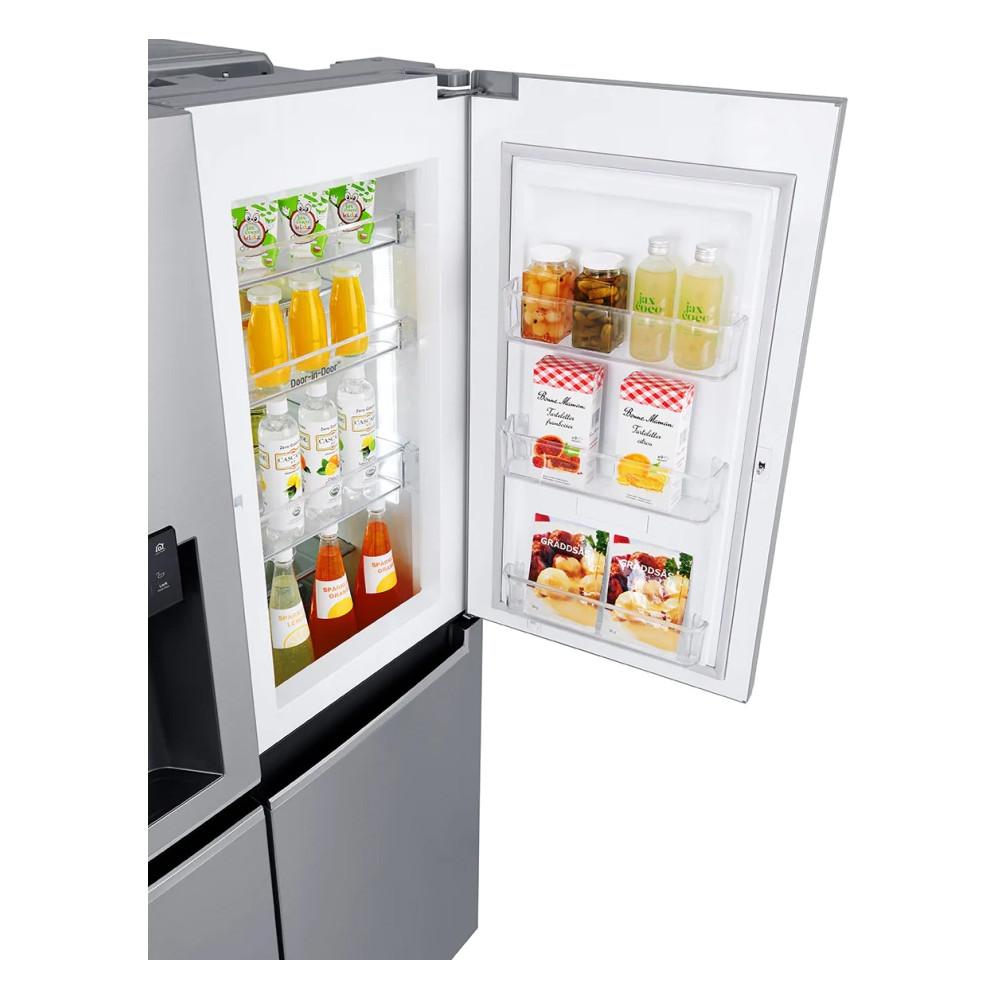 ال جی برای مدیریت و دسترسی سریع به مواد خوراکی و غذایی داخل یخچال از طراحی دور این دور برای یخچال ساید ال جی J247 کمک گرفته است. این نوع طراحی علاوه بر شیک جلوه دادن دیزاین کلی ساید بای ساید؛ در عین حال نیز سبب میشود تا به راحتی مواد خوراکی مورد نیاز در اختیار قرار بگیرد. در واقع قابلیت درب تو درب به کاربر این امکان را می دهد تا ضروری ترین مواد خوراکی خود را همچون میان وعده ها، خوراکی و نوشیدنی های بچه هایتان را دم دست در داخل یخچال قرار دهید و هر زمان که بخواهید در کوتاه ترین زمان ممکن به آنها دسترسی داشته باشد. طراحی دور این دور شامل یک درب مجزا از یخچال می باشد که با باز شدن آن تعداد زیادی از طبقه ها و قفسه ها را بر روی درب یخچال مشاهده می کنید. همچنین از مزیت های دور این دور ساید j247 ال جی 28 فوت این است که دیگر لازم نیست هر بار درب اصلی یخچال را باز و بسته کنید. در نتیجه با این قابلیت از هدر رفتن هوای خنک داخل یخچال جلوگیری میشود.