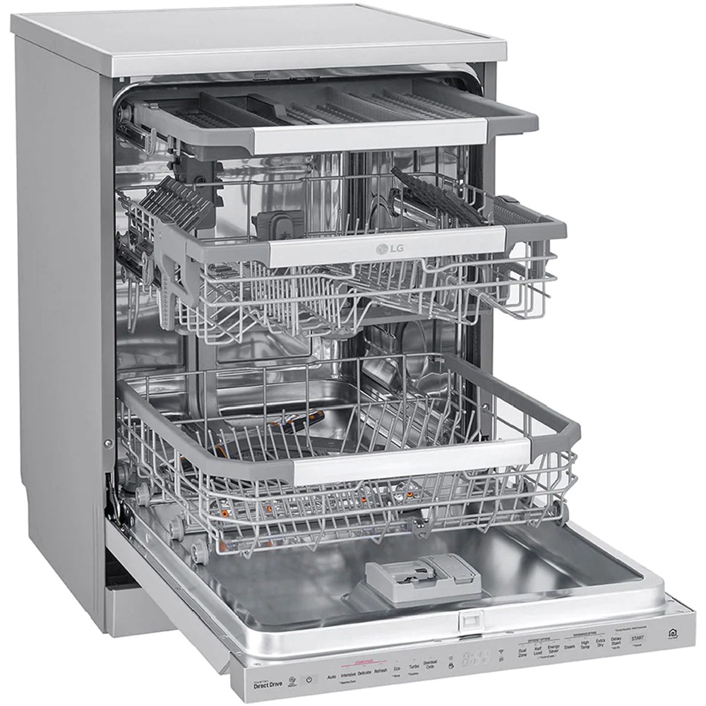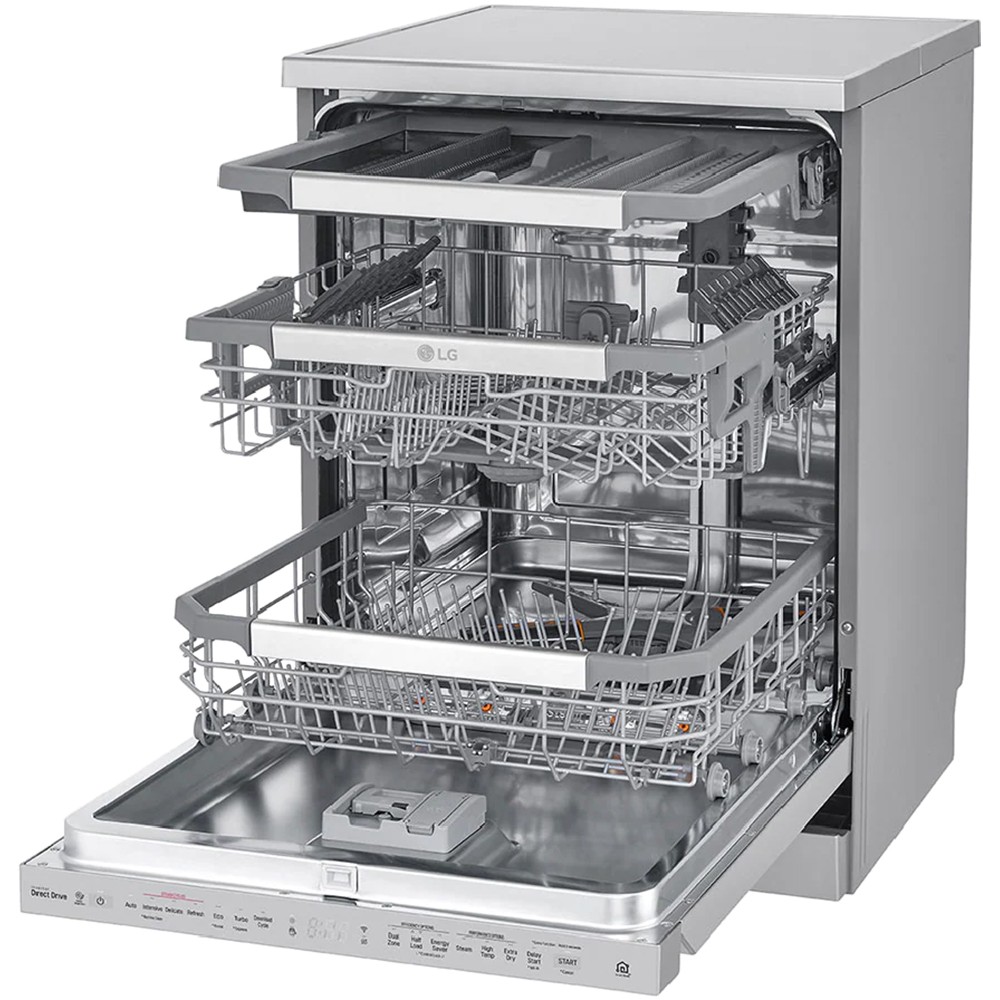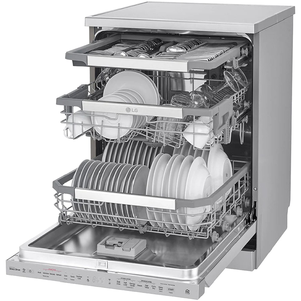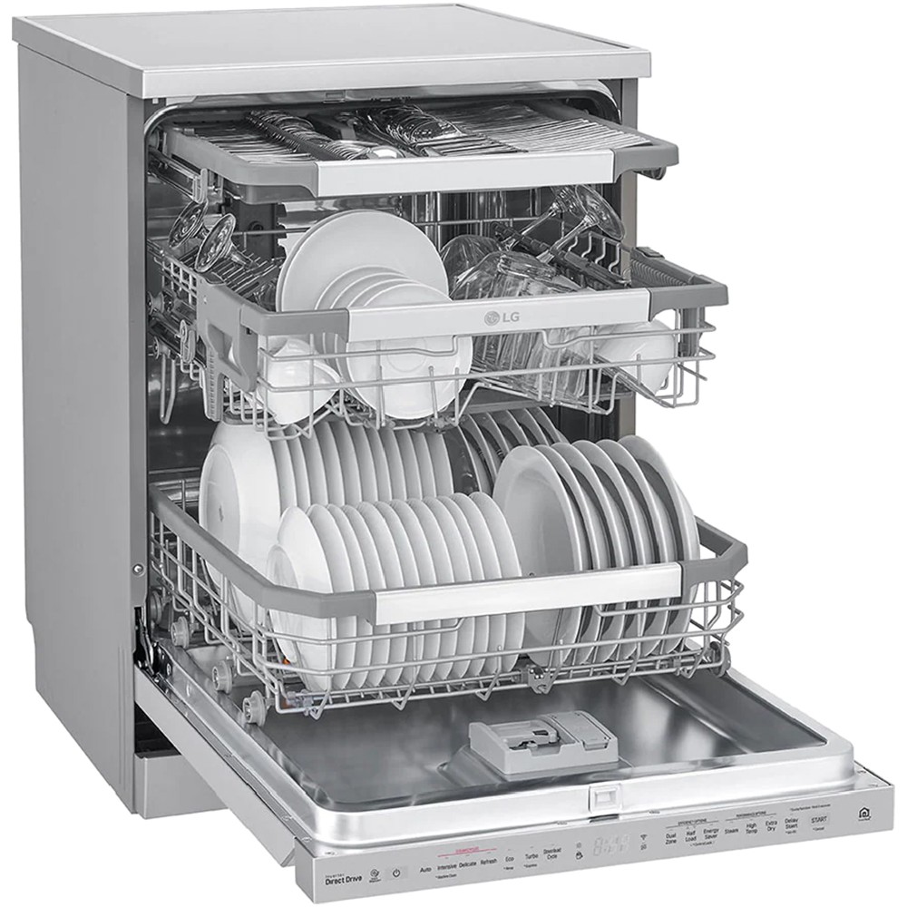 - دارای چرخه Refresh یا تازه سازی برای رفع گرد و غبار روی ظروف (شستشوی بدون مواد شوینده) تکنولوژی TrueSteam برای شستشو و خشک کردن کامل ظروف قابلیت Dual Zone برای شستشوی ظروف ظریف و ظروف بزرگ به طور هم زمان قابلیت تنظیم ارتفاع طبقات یا سبد ها در 3 سطح مختلف دارای پنل کنترلی مخفی (Hidden Panel Control) دارای 3 بازوی آبپاش (Top, Upper, Lower Spray Arms) سیستم Smart Diagnosis برای عیب یابی هوشمند قابلیت Auto Open Dry برای باز شدن خودکار درب بعد از اتمام شستشو و خشک کردن بهتر ظروف دارای صفحه نمایش سگمنتی از نوع میکرو ال ای دی (Micro LED) سیستم Vario Plus برای شستشوی بهتر ظروف به کمک بازوی وسط دارای نشانگر پر کردن مجدد نمک (Salt Refill Icon) دارای موتور Inverter Direct Drive با طول عمر بالا و صرفه جویی در مصرف انرژی و زمان هنگام شستشو قابلیت Extra Dry برای خشک کردن بهتر ظروف قابلیت Adjustable Leg برای تنظیم پایه ها تا 30 میلیمتر پشتیبانی از اینترنت اشیا (IoT) برای مدیریت و کنترل ماشین ظرفشویی از راه دور دارای 4 نوار نویزگیر (Noise Strip) با قابلیت نصب برای کاهش انتقال لرزش و صدای ماشین ظرفشویی قابلیت شروع شستشو با تاخیر از 1 تا 12 ساعت دارای مبدل حرارتی مخفی (Hidden Heater) قابلیت Control Lock برای قفل کردن پنل کنترلی ماشین ظرفشویی دارای سنسور تشخیص میزان کثیفی آب و ظروف (Soil Sensor (Turbidity Sensor)) دارای قابلیت تاشو (Foldable Tines) دندانه های سبد برای جایگیری ظروف بزرگ تر تکنولوژی QuadWash برای شستشوی بهتر ظروف با استفاده از بازوی آبپاش 4 پره دارای چرخه Intensive برای شستشوی ظروف بسیار کثیف پشتیبانی از برنامه LG ThinQ برای کنترل و مدیریت ماشین ظرفشویی از طریق موبایل (مخصوص موبایل های اندرویدی و iOS) سیستم Aqua-Stop برای جلوگیری از نشت آب مجهز به قابلیت Delay Start برای شروع شستشو با تاخیر محفظه داخلی ماشین ظرفشویی از جنس فولاد ضد زنگ با دوام (NeveRust Stainless Steel) سیستم EasyRack Plus برای تنظیم طبقات یا سبد های ماشین ظرفشویی قابلیت Energy Saver برای صرفه جویی در مصرف انرژی دارای نگهدارنده مخصوص لیوان های پایه دار (Stemware Holder) سیستم Water Softener برای تنظیم میزان سختی آب دارای 3 چراغ نشانگر برای نمایش وضعیت دستگاه (SignaLight) قابلیت Machine Clean Reminder جهت یادآوری تمیز کردن دستگاه از طریق برنامه LG ThinQ سیستم تنظیم شدت جریان آب بین سبدها و طبقات مختلف (Vario Washing System) استفاده از مواد ضد باکتری در ساخت برخی از اجزا ماشین ظرفشویی (Anti-Bacterial Treatment) کنترل کاملا الکترونیکی (Fully Electronic Control) برنامه شستشوی Machine Clean برای شستشو و تمیز کردن خودکار داخل ماشین ظرفشویی تکنولوژی Condensing برای خشک کردن ظروف به کمک هوای داغ حاصل از دور آخر آبکشی و فن تضمین عملکرد و کارایی موتور Inverter Direct Drive تا 10 سال توسط ال جی قابلیت High temp برای شستشو با آب داغ طراحی کاملا مینیمال برای هماهنگی هر چه بهتر با آشپزخانه شما جنس بدنه فولاد ضد زنگ (Stainless Steel) دارای قیف (Funnel) برای پر کردن مخزن نمک ماشین ظرفشویی