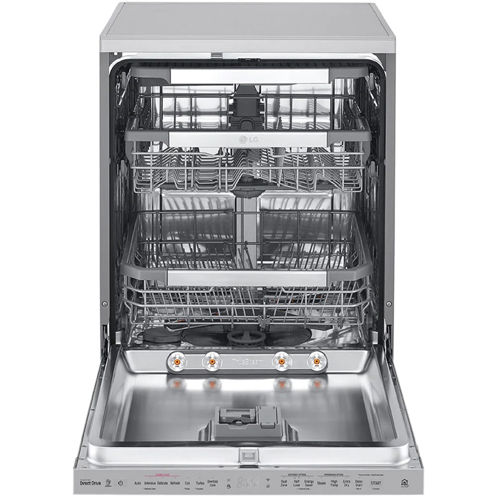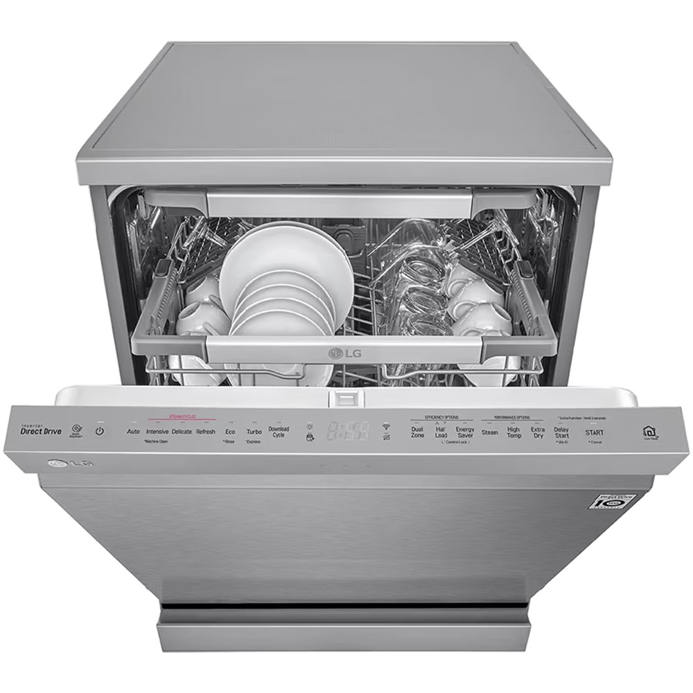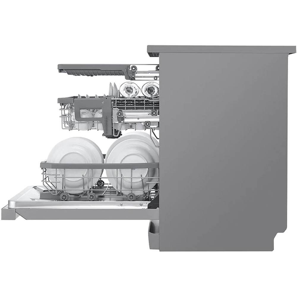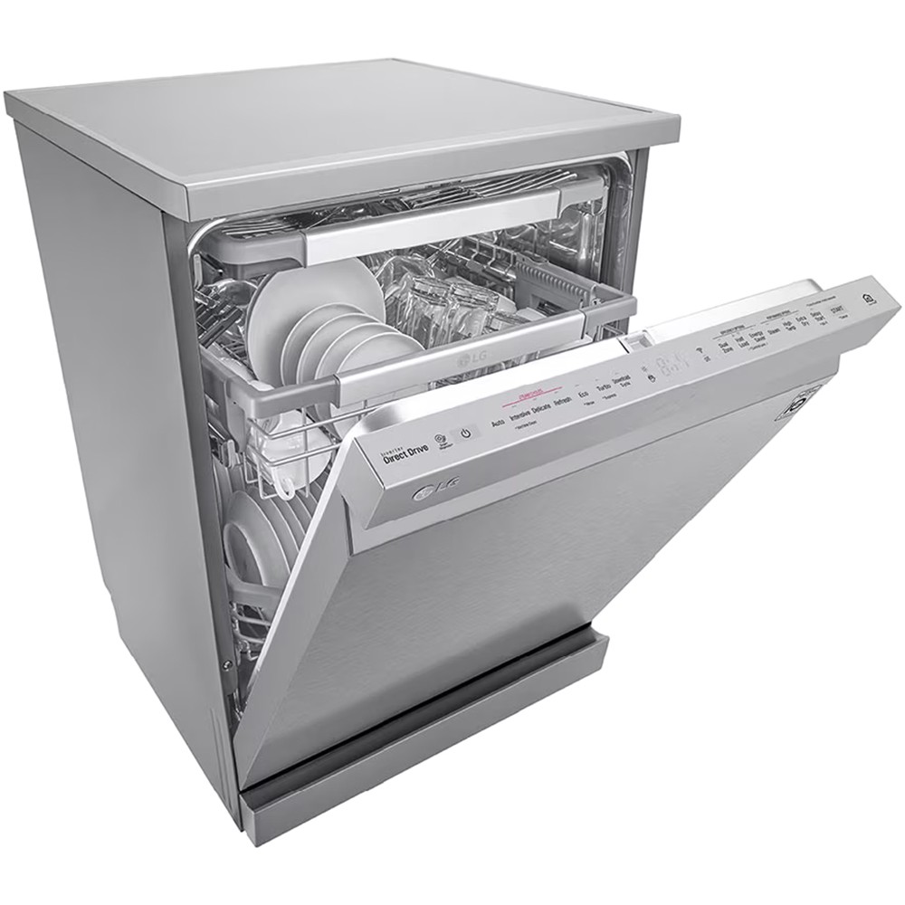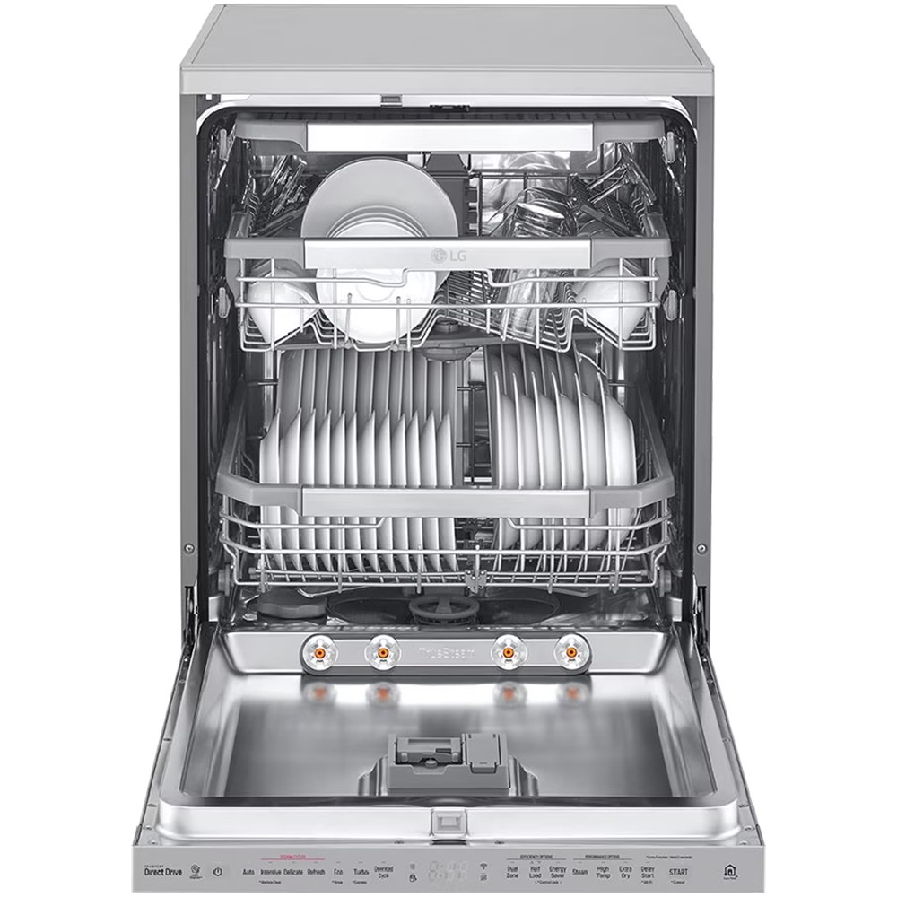 - دارای چرخه Refresh یا تازه سازی برای رفع گرد و غبار روی ظروف (شستشوی بدون مواد شوینده) تکنولوژی TrueSteam برای شستشو و خشک کردن کامل ظروف قابلیت Dual Zone برای شستشوی ظروف ظریف و ظروف بزرگ به طور هم زمان قابلیت تنظیم ارتفاع طبقات یا سبد ها در 3 سطح مختلف دارای پنل کنترلی مخفی (Hidden Panel Control) دارای 3 بازوی آبپاش (Top, Upper, Lower Spray Arms) سیستم Smart Diagnosis برای عیب یابی هوشمند قابلیت Auto Open Dry برای باز شدن خودکار درب بعد از اتمام شستشو و خشک کردن بهتر ظروف دارای صفحه نمایش سگمنتی از نوع میکرو ال ای دی (Micro LED) سیستم Vario Plus برای شستشوی بهتر ظروف به کمک بازوی وسط دارای نشانگر پر کردن مجدد نمک (Salt Refill Icon) دارای موتور Inverter Direct Drive با طول عمر بالا و صرفه جویی در مصرف انرژی و زمان هنگام شستشو قابلیت Extra Dry برای خشک کردن بهتر ظروف قابلیت Adjustable Leg برای تنظیم پایه ها تا 30 میلیمتر پشتیبانی از اینترنت اشیا (IoT) برای مدیریت و کنترل ماشین ظرفشویی از راه دور دارای 4 نوار نویزگیر (Noise Strip) با قابلیت نصب برای کاهش انتقال لرزش و صدای ماشین ظرفشویی قابلیت شروع شستشو با تاخیر از 1 تا 12 ساعت دارای مبدل حرارتی مخفی (Hidden Heater) قابلیت Control Lock برای قفل کردن پنل کنترلی ماشین ظرفشویی دارای سنسور تشخیص میزان کثیفی آب و ظروف (Soil Sensor (Turbidity Sensor)) دارای قابلیت تاشو (Foldable Tines) دندانه های سبد برای جایگیری ظروف بزرگ تر تکنولوژی QuadWash برای شستشوی بهتر ظروف با استفاده از بازوی آبپاش 4 پره دارای چرخه Intensive برای شستشوی ظروف بسیار کثیف پشتیبانی از برنامه LG ThinQ برای کنترل و مدیریت ماشین ظرفشویی از طریق موبایل (مخصوص موبایل های اندرویدی و iOS) سیستم Aqua-Stop برای جلوگیری از نشت آب مجهز به قابلیت Delay Start برای شروع شستشو با تاخیر محفظه داخلی ماشین ظرفشویی از جنس فولاد ضد زنگ با دوام (NeveRust Stainless Steel) سیستم EasyRack Plus برای تنظیم طبقات یا سبد های ماشین ظرفشویی قابلیت Energy Saver برای صرفه جویی در مصرف انرژی دارای نگهدارنده مخصوص لیوان های پایه دار (Stemware Holder) سیستم Water Softener برای تنظیم میزان سختی آب دارای 3 چراغ نشانگر برای نمایش وضعیت دستگاه (SignaLight) قابلیت Machine Clean Reminder جهت یادآوری تمیز کردن دستگاه از طریق برنامه LG ThinQ سیستم تنظیم شدت جریان آب بین سبدها و طبقات مختلف (Vario Washing System) استفاده از مواد ضد باکتری در ساخت برخی از اجزا ماشین ظرفشویی (Anti-Bacterial Treatment) کنترل کاملا الکترونیکی (Fully Electronic Control) برنامه شستشوی Machine Clean برای شستشو و تمیز کردن خودکار داخل ماشین ظرفشویی تکنولوژی Condensing برای خشک کردن ظروف به کمک هوای داغ حاصل از دور آخر آبکشی و فن تضمین عملکرد و کارایی موتور Inverter Direct Drive تا 10 سال توسط ال جی قابلیت High temp برای شستشو با آب داغ طراحی کاملا مینیمال برای هماهنگی هر چه بهتر با آشپزخانه شما جنس بدنه فولاد ضد زنگ (Stainless Steel) دارای قیف (Funnel) برای پر کردن مخزن نمک ماشین ظرفشویی