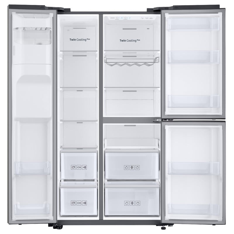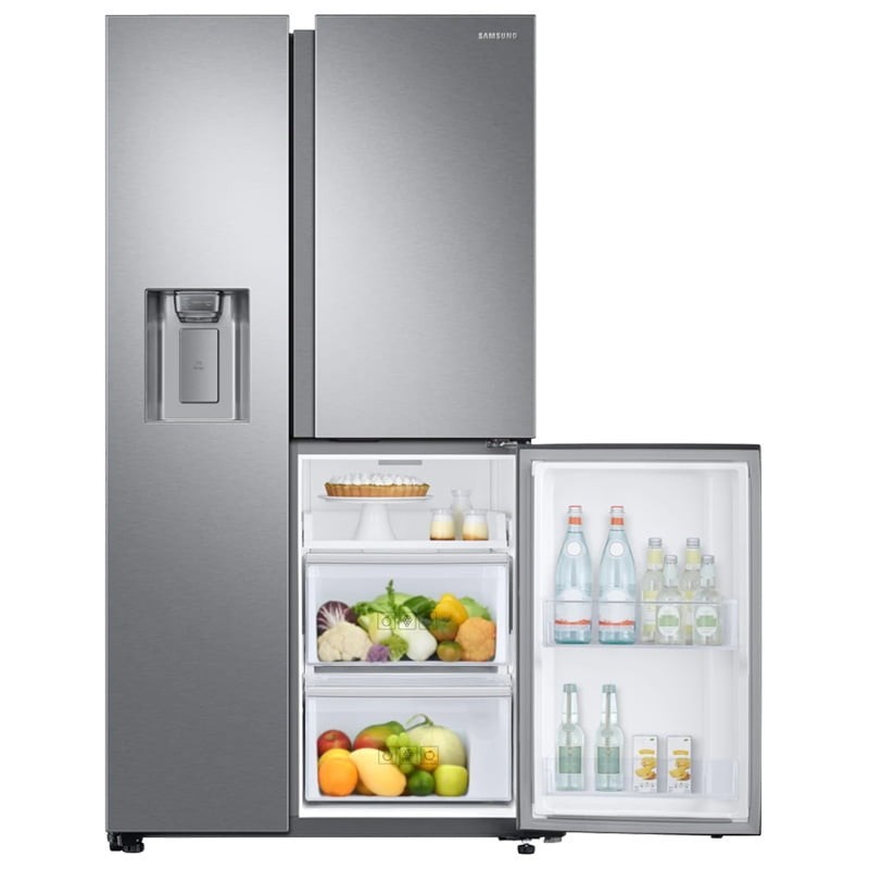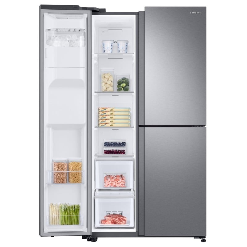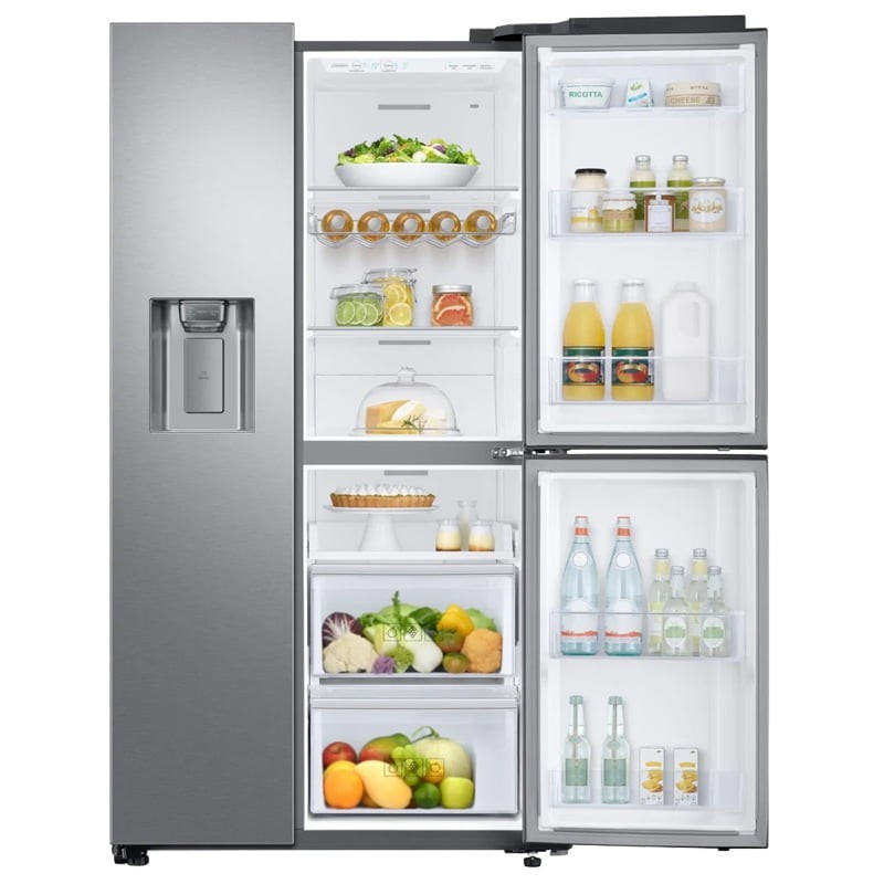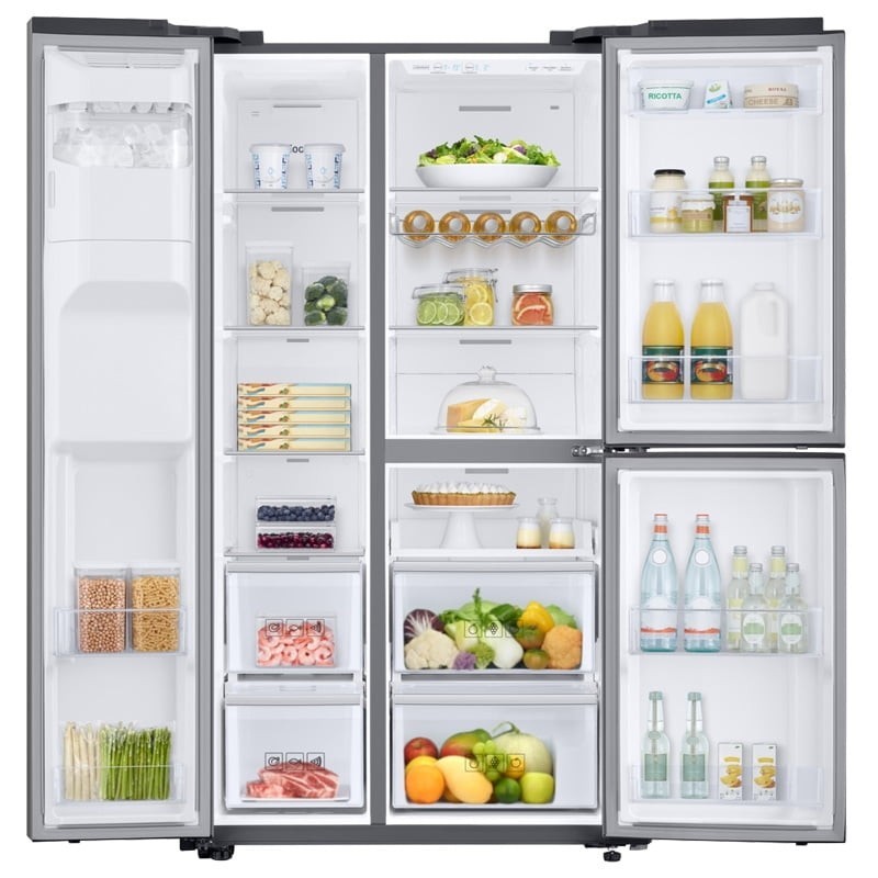 یخچال سامسونگ RS68N8650SL یکی از بهترین و به روز ترین محصولات این کمپانی کره ای می باشد که از ظرفیت بالای 608 لیتری بهره میبرد. بخشی از این ظرفیت مربوط به قسمت یخچال و بخش دیگر نیز برای فریزر آن طراحی شده که در بخش های بعدی بیشتر در مورد فضای داخلی آن توضیح می دهیم. طراحی سه درب که به یخچال سامسونگ افزوده شده علاوه بر اینکه به شیک بودن آن کمک بسیار زیادی کرده، در عین حال نیز با تعداد قفسه ها و طبقه های بیشتری این امکان را فراهم می آورد تا حجم بسیار زیادی از مواد غذایی را در داخل آن نگه داری کنید. سامسونگ جهت صرفه جویی از هزینه های گزاف ناشی از مصرف برق کمپرسور اینورتر دیجیتال را برای این مدل یخچالش به کار برده که هم از مصرف بی رویه انرژی جلوگیری به عمل آورد و هم اینکه به صورت کاملاً هوشمند میزان نویز پایین و طول عمر دستگاه را تضمین نماید. قسمت فریزر ساید بای ساید سامسونگ نیز با دو قابلیت بسیار خوب سیستم بدون برفک و انجماد سریع همراه شده است. عایق سیکلوپنتان و گاز مبرد R600a نیز در بین دیگر امکانات ساید بای ساید سامسونگ به چشم می خورند. سیستم جریان هوای چند گانه همراه با سیستم فن خنک کننده دو قلو نیز برای ساید بای ساید سامسونگ تعریف شده اند که نقش بسیار مهمی بر روی خنک نگه داشتن فضای داخلی ایفا می کنند.