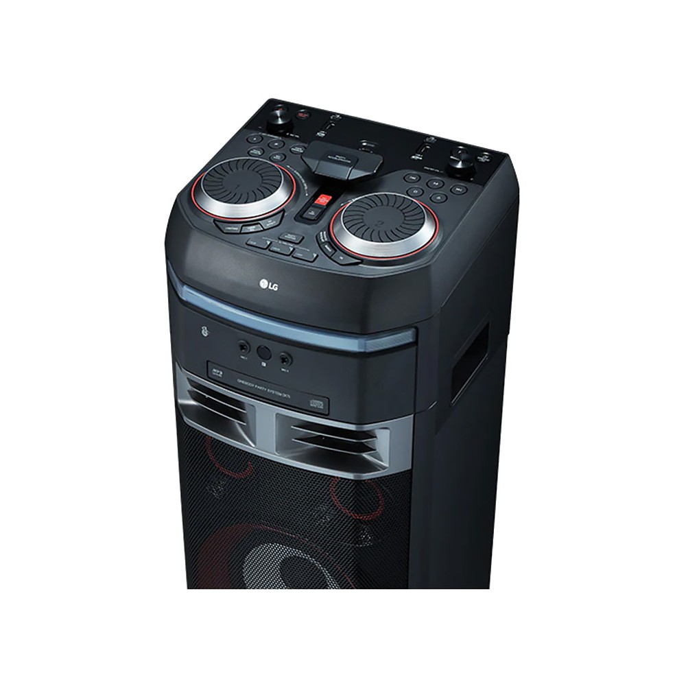 سیستم صوتی ال جی XBOOM OK75 یکی دیگر از سیستم های صوتی سری OK است که در سال 2018 معرفی گردید. سیستم صوتی OK75 یکی از بهترین سیستم های صوتی ارزان قیمت ال جی با 2.1 کانال صوتی در سال 2018 می باشد. این محصول برای مهمانی ها و دورهمی های کوچک و متوسط بسیار مناسب است. محصول پیش روی شما از خانواده بزرگ XBOOM شرکت ال جی می باشد که ممکن است به اشتباه با عنوان سیستم صوتی شیک ال جی OK75 نیز شناخته شود. سیستم صوتی خانگی ال جی ایکس بوم OK75 دارای 2.1 کانال صوتی بوده و صدای استریو و با کیفیت تولید می کند. سیستم صوتی پیش روی شما دارای توان خروجی صدای 1000 وات می باشد و صدای قدرتمندی دارد. ال جی این محصول را به 2 بلندگوی توییتر (Tweeter) و 2 بلندگوی میدرنج (Mid-Range) مجهز نموده و برای تولید صدای باس از 1 بلندگوی ساب ووفر (Subwoofer) قدرتمند با توان 410 وات در این سیستم صوتی استفاده کرده است. محصول فوق به تکنولوژی Bass Blast نیز مجهز می باشد که با فعال کردن آن، صدای باس قدرتمندتری تولید می کند. این محصول از جمله سیستم های صوتی Hi-Fi بوده و کیفیت صدای بسیار خوبی دارد. همچنین ال جی این سیستم صوتی را به تکنولوژی Dolby Audio مجهز نموده است تا بتواند صدایی با کیفیت و سینمایی تولید کند. کیفیت و قدرت صدای سیستم صوتی پیش روی شما بسیار خوب است، ولی با این حال ال جی قابلیت Wireless Party Link را برای این محصول در نظر گرفته است. شما به کمک این ویژگی می توانید چندین سیستم صوتی که دارای این قابلیت هستند را به صورت بی سیم به یکدیگر متصل کنید و صدای قدرتمندتری را تجربه کنید. سیستم صوتی 1000 وات ال جی XBOOM OK75 یک محصول حرفه ای برای علاقمندان به موسیقی و دی جی (DJ) به شمار می آید. این محصول دارای قابلیت Juke Box است و شما می توانید روی سیستم صوتی یک لیست از آهنگهایی که درون سی دی یا حافظه فلش دارید بسازید تا پخش شوند. همچنین این سیستم صوتی دارای قابلیت Auto DJ است که با فعال کردن آن، لیست آهنگ های شما به صورت پیوسته و بدون وقفه پخش خواهند شد. محصول فوق دارای قابلیت DJ Effect می باشد که 4 حالت پیشفرض را در اختیار شما قرار می دهد تا بتوانید افکت های صوتی مختلفی ایجاد کنید. قابلیت های DJ Scratch و DJ Loop نیز در اختیار شما قرار دارند و این امکان را فراهم می سازد تا جلوه های صوتی جذابی ایجاد کنید و به مهمانی های خود هیجان ببخشید. یکی دیگر از ویژگی های جذاب این سیستم صوتی، قابلیت Party Accelerator می باشد. شما با حرکت دادن اهرم مخصوص Party Accelerator می توانید افکت های جذابی را تولید کنید و به جشن های خود شور و نشاط خاصی اضافه کنید. این سیستم صوتی به DJ Pad و Party Kick Starter مجهز است و شما می توانید با استفاده از دکمه های فیزیکی مخصوصی که روی بدنه محصول تعبیه شده است، افکت های صوتی مختلفی را پخش کنید. البته قابلیت های Party Kick Starter Sampler Creator و Sampler Creator نیز در اختیار شما قرار دارند و می توانید صداهای DJ Pad و Party Kick Starter را به دلخواه خود تنظیم نمایید. این سیستم صوتی های فای (Hi-Fi) ال جی امکان تنظیم اکولایزر (Equalizer) را دارد و چندین حالت پیشفرض را در اختیار شما قرار می دهد تا با توجه به موزیک در حال پخش یکی را انتخاب نمایید. همچنین محصول فوق دارای قابلیت User EQ نیز می باشد و به شما این امکان را می دهد تا تنظیمات اکولایزر را به صورت دستی انجام دهید. سیستم صوتی 2.1 کاناله ال جی OK75 از قابلیت کارائوکه (Karaoke) نیز پشتیبانی می کند و دارای 2 ورودی میکروفون از نوع 6.3 میلیمتری می باشد. به این ترتیب می توانید به خوانندگی و رقابت با دوستان خود بپردازید و مهمانی های خود را جذاب تر کنید. با وجود قابلیت Mic Echo می توانید افکت اکو را به صدای ورودی از میکروفون اضافه کنید و یا با استفاده از قابلیت Vocal Effects صدای خود را تغییر دهید. از ویژگی های جذاب این محصول، وجود قابلیت Voice Canceller است که با کم کردن صدای خواننده اصلی از آهنگ در حال پخش، به شما این امکان را می دهد تا بجای او به خوانندگی بپردازید. ویژگی Key Changer در سیستم صوتی فوق وجود دارد و شما می توانید صدای آهنگ در حال پخش را تغییر دهید. سیستم صوتی حرفه ای ال جی 