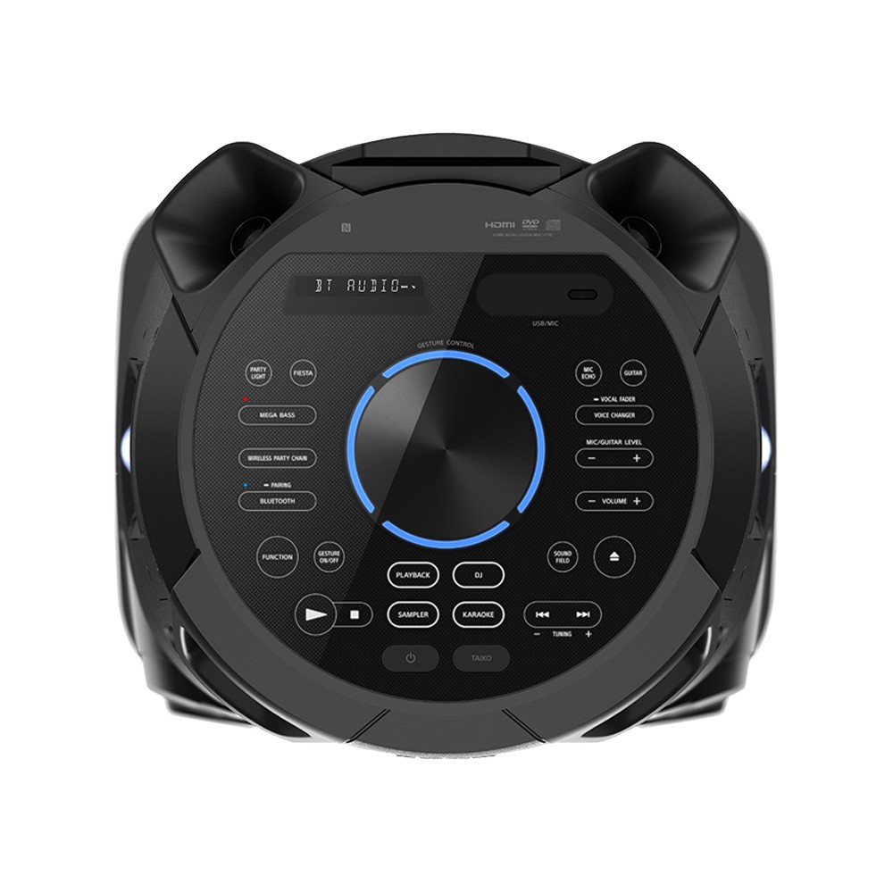 - قابلیت Child Lock برای غیر فعال کردن دکمه های کنترلی سیستم صوتی رقص نور 360 درجه مخصوص مهمانی ها و جشن های شبانه به کمک Omni-directional Party Light (Omnidirectional Party Light) با حالت های 360°Party light و Arc: DeepBlue / SkyBlue / Green و Stripe: Multicolour دارای 2 بلندگوی میدرنج (Mid-Range) 80 میلیمتری با کیفیت در قسمت جلو و پشت سیستم صوتی دارای چیپ NFC برای اتصال راحت تر موبایل و تبلت هوشمند به سیستم صوتی حالت صدای فوتبال (Football Mode) برای تماشای مسابقات ورزشی فوتبال و حس واقع گرایانه صدای استادیوم قابلیت Sleep Timer برای تنظیم زمان به خواب رفتن دستگاه پخش صدای 360 درجه به کمک بلندگو های توییتر و میدرنج پشتی (360 Sound) پشتیبانی از مدولاسیون بلوتوث FHSS (Freq Hopping Spread Spectrum) قابلیت System Power Off برای خاموش شدن سیستم صوتی هم زمان با تلویزیون، هنگام اتصال سیستم صوتی به تلویزیون از طریق کابل HDMI تکنولوژی Surround برای تولید صدای فراگیر و سه بعدی مجازی قابلیت Preset Channel از نوع FM20 برای ذخیره سازی 20 کانال رادیو FM پشتیبانی از پروفایل بلوتوث AVRCP نسخه 1.3 قابلیت Auto Standby برای رفتن سیستم صوتی به حالت استندبای (آماده به کار) در صورت عدم استفاده از سیستم صوتی تا 15 دقیقه قابلیت Voice Changer برای تغییر صدای خواننده در صورت وصل بودن میکروفون قابلیت One-touch listening برای اتصال سریع موبایل به سیستم صوتی از طریق بلوتوث به کمک چیپ NFC حتی در حالت استندبای پشتیبانی از برنامه Sony | Music Center برای کنترل سیستم صوتی از طریق موبایل های هوشمند اندروید و iOS قابلیت تایکو (Taiko Mode) جهت اضافه کردن صدای درام (Drum) به آهنگ ها و بازی با ریتم آهنگ ها به همراه دوستان خود دارای چرخ (Wheels) برای حمل و نقل آسان دارای چراغ نشانگر برای نمایش وضعیت Mega Bass در قسمت بالای سیستم صوتی (Mega Bass indicator) تکنولوژی Jet Bass Booster با سیستم Bass Reflex برای شلیک صدا و احساس صدای باس در هر جایی از مهمانی و جشن قابلیت Live Sound برای ایجاد فضای فستیوال و کنسرت و پخش صدای زنده به کمک تکنولوژی DSP یا Digital Signal Processing قابلیت Multi Device Connection برای اتصال هم زمان 3 موبایل هوشمند به سیستم صوتی از طریق بلوتوث تکنولوژی (+Clear Audio) +ClearAudio برای تولید صدای واضح و شفاف قابلیت USB Port Charging Output برای شارژ دستگاه ها از طریق پورت USB با توان 1 آمپر قابلیت Sampler برای ایجاد افکت های صوتی مختلف تکنولوژی Hi-Fi برای ارائه صدا با کیفیت بالا قابلیت Bluetooth Standby Mode برای روشن شدن خودکار سیستم صوتی هنگام اتصال دستگاهی مانند موبایل به سیستم صوتی از طریق بلوتوث دارای دکمه های لمسی (Touch Keys) دارای دستگیره (Carrying Handle) در کناره ها و پشت سیستم صوتی برای حمل و نقل آسان پشتیبانی از فرمت PCM با 2 کانال صوتی هنگام اتصال سیستم صوتی به تلویزیون از طریق کابل HDMI قابلیت Bravia Sync (HDMI-CEC) برای کنترل سیستم صوتی از طریق ریموت کنترل تلویزیون (در صورت اتصال سیستم صوتی به تلویزیون سونی از طریق کابل HDMI) قابلیت Mic Echo جهت تنظیم افکت اکو میکروفون در سطوح مختلف قابلیت اتصال گیتار (Guitar) به سیستم صوتی دارای 2 بلندگوی توییتر (Tweeter) 40 میلیمتری با کیفیت در قسمت پشت سیستم صوتی دارای 1 پخش کننده دیسک نوری با قابلیت پخش CD و DVD قابلیت Emotion EQ برای تنظیم اکولایزر صدا قابلیت Mic Volume برای تنظیم سطح صدای میکروفون پشتیبانی از برنامه Fiestable برای مدیریت و کنترل جشن ها و مهمانی ها از طریق موبایل های هوشمند اندروید و iOS قابلیت کنترل از طریق ژست های حرکتی (Gesture Control) به صورت افقی و عمودی قابلیت Party Lock برای قفل کردن پنل کنترلی به مدت 30 ثانیه و تمیز کردن آن تکنولوژی Dolby Digital برای تولید صدای با کیفیت تر سیستم RDS (Radio Data System) برای نمایش اطلاعات رادیو دارای 1 پورت ورودی صدای آنالوگ یا AUX از نوع 3.5 میلیمتری قابلیت پخش محتواهای ویدئویی با حداکثر رزولوشن 720x576 پیکسل از طریق USB و دیسک نوری قابلیت Vocal Fader برای کاهش صدای خواننده از آهنگ در حال پخش قابلیت USB REC برای ضبط آهنگ روی حافظه USB قابلیت افکت دی جی (DJ Effects) با حالت های Flanger، Wah، Isolator و Pan پشتیبانی از فرکانس بلوتوث از 2.4000GHz تا 2.4835GHz تکنولوژی LDAC برای پخش محتواهای صوتی 