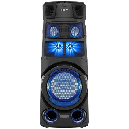 سیستم صوتی سونی MHC-V83D یا V83 یکی از سیستم های صوتی 2020 سونی می باشد. سیستم صوتی سونی V83D را می توان بهترین سیستم صوتی سری MHC سونی در سال 2020 در نظر گرفت. البته این سیستم صوتی که با مدل MHC-V83D//M SP6 نیز شناخته می شود در بازار کشور ما به اشتباه به سیستم صوتی شیک سونی V83 معروف شده است. این محصول مدل جایگزین و جدید تر سیستم صوتی سونی MHC-V82D می باشد که در سال گذشته معرفی شده بود. متاسفانه سونی در رابطه با تعداد کانال صوتی و قدرت خروجی این مدل اطلاعاتی را در اختیار عموم قرار نداده است. اما طبق بررسی هایی که ما انجام داده ایم این سیستم صوتی 2.1 کاناله می باشد و به طور تقریبی قدرت خروجی 1850 وات دارد. سیستم صوتی مذکور در مجموع مجهز به 9 بلندگو می باشد. این بلندگو ها شامل 2 بلندگوی میدرنج 80 میلیمتری، 2 بلندگوی میدرنج 100 میلیمتری زاویه دار، 2 بلندگوی توییتر 40 میلیمتری در پشت، 2 بلندگوی توییتر 40 میلیمتری در جلو و 1 بلندگوی ووفر 300 میلیمتری می باشد. بلندگو های توییتر سیستم صوتی 1850 وات سونی MHC-V83D به گونه ای طراحی شده اند که می توانند صدای 360 درجه (360 Sound) را در اختیار شما قرار دهند. این محصول به لطف بلندگو هایی که داشته صدا را به صورت همه جانبه (Omnidirectional Party Sound) پخش می کند و برای استفاده در مهمانی و جشن ها گزینه کاملا مناسبی می باشد. این سیستم صوتی دارای بلندگوی ووفر با تکنولوژی Jet Bass Booster و سیستم صوتی Double Bass Reflex است در نتیجه صدای باس قدرتمندی را به شما ارائه می دهد تا از فواصل دورتر نیز صدای باس را به خوبی بشنوید. علاوه بر آن سونی برای تقویت صدای بیس در سیستم صوتی مذکور قابلیت Mega Bass را نیز قرار داده است تا به دورهمی های خود هیجان بیشتری ببخشید. این مدل جزو سیستم های صوتی های فای (Hi-Fi) سونی محسوب می شود و از تکنولوژی های Dolby Digital و Dolby Audio پشتیبانی می کند تا بتوانید آهنگ ها را با کیفیت بالایی بشنوید. همچنین سونی در سیستم صوتی V83 از تکنولوژی DSEE استفاده کرده است تا حتی کیفیت محتواهایی که فشرده و کم حجم شده اند را بهبود ببخشد. تکنولوژی مذکور آهنگ های در حال پخش را پردازش می کند و با بهبود فرکانس صدا، جزئیات از دست رفته در آنها را ترمیم و بازسازی می کند تا از شنیدن جزئیات صدا در این سیستم صوتی بیش از پیش لذت ببرید. این محصول به لطف تکنولوژی Surround می تواند صدای فراگیر مجازی را به شما ارائه دهد تا تجربه ای لذت بخش را برایتان رقم بزند. سیستم صوتی مذکور مجهز به قابلیت Live Sound است و به کمک تکنولوژی DSP آهنگ ها را به نحوی پخش می نماید که حس کنید در یک اجرای زنده یا کنسرت حضور دارید. به کمک تکنولوژی ClearAudio+ در این مدل تنظیمات صدا با توجه به صوت یا آهنگ در حال پخش به صورت خودکار تنظیم خواهد شد تا صداها را با وضوح و شفافیت بیشتری بشنوید. علاوه بر آن در سیستم صوتی 2.1 کاناله سونی MHC-V83D حالت های صدای پیش فرضی وجود دارد تا به دلخواه خود حالت مورد نظر را انتخاب نمایید یا حتی با قابلیت Custom EQ، اکولایزر را به صورت دستی تنظیم کنید. برای تماشای برنامه های ورزشی و شنیدن صدا به گونه ای که گویی در استادیوم حضور دارید، می توانید از حالت Football Mode در این محصول استفاده نمایید. به کمک قابلیت FIESTA Mode در این دستگاه، صداها با قدرت بیشتری پخش می شوند تا حس حضور در یک مهمانی را به شما القا کند. این سیستم صوتی دارای قابلیت Gesture Control می باشد و از ژست های حرکتی پشتیبانی می کند تا تنها با حرکت دست خود به صورت افقی و عمودی در بالای پنل کنترلی، دستگاه را کنترل نمایید. علاوه بر آن قابلیت Taiko Mode نیز دارد و به شما این امکان را می دهد تا صدای طبل (Drum) را به آهنگ ها اضافه نمایید. سیستم صوتی مذکور دارای قابلیت Taiko Game Mode می باشد تا به همراه دوستان خود با ریتم آهنگ ها بازی کنید، امتیاز بگیرید و سرگرم شوید. باند سونی V83 علاوه بر صدای 360 درجه دارای نور پردازی 360 درجه (Omnidirectional Party Light) نیز می باشد و با پخش رقص نور با رنگ های مختلف به مهمانی و جشن های شما انرژی بیشتری می دهد. همچنین سونی از رقص نور با رنگ آبی در بلندگوهای مید