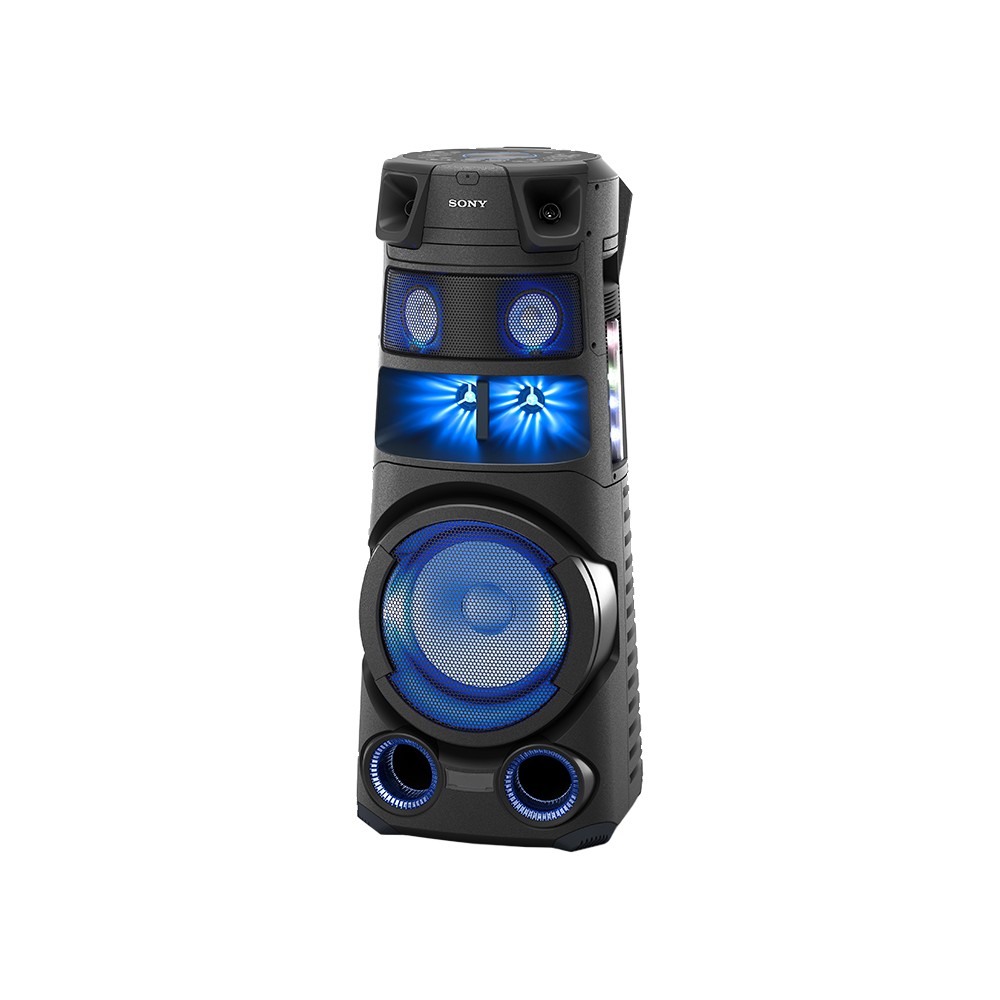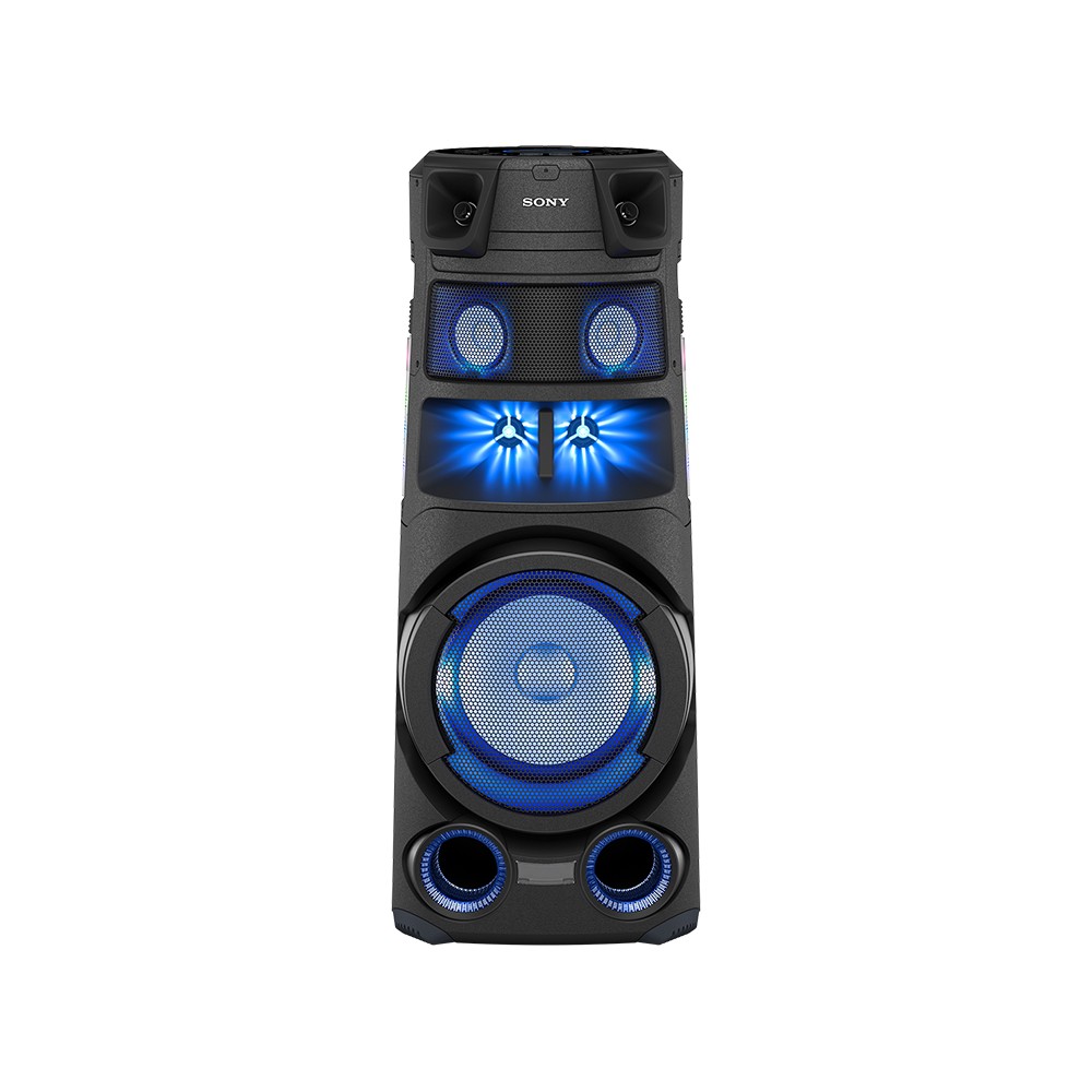 مهم ترین اجزای تشکیل دهنده هر سیستم صوتی بلندگوها می باشند که کیفیت دستگاه تا حد زیادی وابسته به آنهاست. به بیانی دیگر در سیستم های صوتی حرف اول و آخر را بلندگوها می زنند زیرا وظیفه اصلی آن ها رسایی صدا می باشد. شیک سونی V83 متشکل از 4 تویتر در اندازه 4 سانتی متر، دو درایو میدرنج به اندازه 8 سانتی متر، دو درایو میدرنج در اندازه 10 سانتی متر و ساب ووفر بوده که صدا را با نهایت کیفیت و رسایی به گوش شما می رساند. هر کدام از این اسپیکرها صدا را به صوت همه جانبه و زاویه دار پخش می کنند. طراحی شیپور مانند اسپیکرها نیز در برد امواج صدا بیتاثیر نیستند و باعث میشوند صدا به خوبی در محیط های بزرگ پخش شود.