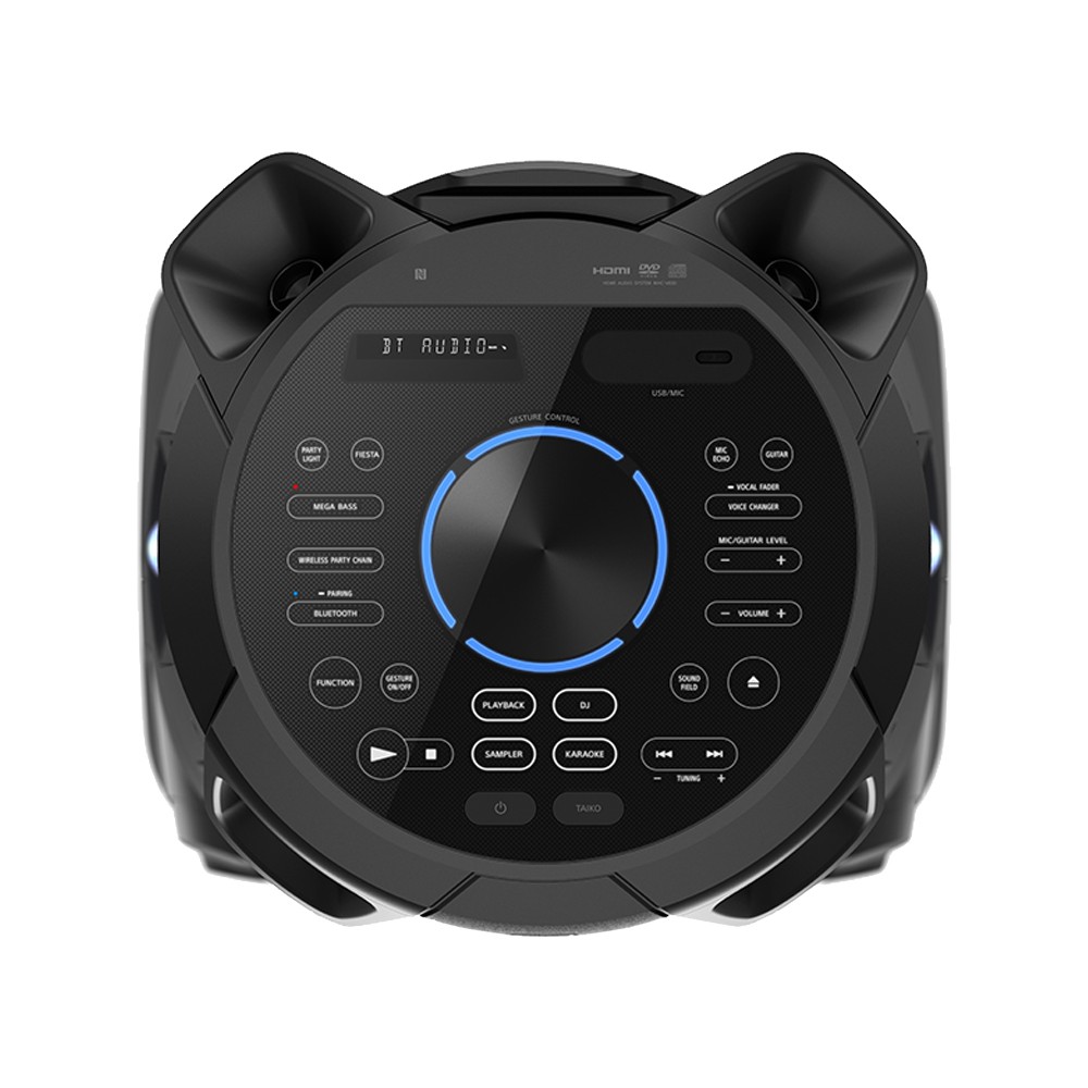 - قابلیت Bravia Sync (HDMI-CEC) برای کنترل سیستم صوتی از طریق ریموت کنترل تلویزیون (در صورت اتصال سیستم صوتی به تلویزیون سونی از طریق کابل HDMI) قابلیت Mic Echo جهت تنظیم افکت اکو میکروفون در سطوح مختلف رقص نور 360 درجه مخصوص مهمانی ها و جشن های شبانه به کمک Omni-directional Party Light (Omnidirectional Party Light) با حالت های 360°Party light و Arc: DeepBlue / SkyBlue / Green و Stripe: Multicolour دارای 2 بلندگوی میدرنج (Mid-Range) 100 میلیمتری زاویه دار با کیفیت در قسمت جلوی سیستم صوتی دارای 1 پخش کننده دیسک نوری با قابلیت پخش CD و DVD قابلیت Emotion EQ برای تنظیم اکولایزر صدا دارای دکمه های لمسی (Touch Keys) دارای دستگیره (Carrying Handle) در کناره ها و پشت سیستم صوتی برای حمل و نقل آسان پشتیبانی از فرمت PCM با 2 کانال صوتی هنگام اتصال سیستم صوتی به تلویزیون از طریق کابل HDMI قابلیت Party Lock برای قفل کردن پنل کنترلی به مدت 30 ثانیه و تمیز کردن آن تکنولوژی Dolby Digital برای تولید صدای با کیفیت تر سیستم RDS (Radio Data System) برای نمایش اطلاعات رادیو دارای 1 پورت ورودی صدای آنالوگ یا AUX از نوع 3.5 میلیمتری قابلیت پخش محتواهای ویدئویی با حداکثر رزولوشن 720x576 پیکسل از طریق USB و دیسک نوری قابلیت Vocal Fader برای کاهش صدای خواننده از آهنگ در حال پخش قابلیت Mic Volume برای تنظیم سطح صدای میکروفون پشتیبانی از برنامه Sony | Music Center برای کنترل سیستم صوتی از طریق موبایل های هوشمند اندروید و iOS قابلیت کنترل از طریق ژست های حرکتی (Gesture Control) به صورت افقی و عمودی تکنولوژی LDAC برای پخش محتواهای صوتی با کیفیت بالا (Hi-Res Audio content) از طریق بلوتوث دارای چراغ نشانگر برای نمایش وضعیت بلوتوث در قسمت بالای سیستم صوتی (Bluetooth indicator) تکنولوژی Jet Bass Booster با سیستم Bass Reflex برای شلیک صدا و احساس صدای باس در هر جایی از مهمانی و جشن دارای 1 بلندگوی ووفر (Woofer) 300 میلیمتری پر قدرت در قسمت جلوی سیستم صوتی قابلیت Wireless Party Chain برای اتصال بی سیم (بلوتوثی) به سیستم های صوتی سازگار (تا 50 سیستم صوتی) و ارائه صدای قدرتمند تر حالت صدای FIESTA MODE برای تقویت صدای باس و پخش بلند تر صدا ها قابلیت USB REC برای ضبط آهنگ روی حافظه USB قابلیت افکت دی جی (DJ Effects) با حالت های Flanger، Wah، Isolator و Pan پشتیبانی از فرکانس بلوتوث از 2.4000GHz تا 2.4835GHz قابلیت کارائوکه (Karaoke) برای تمرین خوانندگی و نوازندگی و مسابقه دادن با دوستان خود رقص نور بلندگو ها به کمک Speaker Light (رنگ آبی برای بلندگوهای ووفر و میدرنج) قابلیت Tray Lock برای قفل کردن دیسک نوری و جلوگیری از باز شدن آن دارای بلوتوث با برد یا شعاع عملکرد تا 10 متر (بدون وجود مانع) پشتیبانی از فرکانس صوتی 20Hz تا 20KHz هنگام پخش محتوای دیسک نوری قابلیت Score Mode یا Scoring برای محاسبه و تعیین امتیاز خواننده از 0 تا 99 با توجه به آهنگ در حال پخش در صورت وصل بودن میکروفون قابلیت اتصال گیتار (Guitar) به سیستم صوتی قابلیت Party Playlist برای اضافه کردن آهنگ های دلخواه به لیست پخش توسط موبایل های مختلف از طریق برنامه Fiestable دارای 2 بلندگوی توییتر (Tweeter) 40 میلیمتری با کیفیت در قسمت پشت سیستم صوتی قابلیت کانال برگشتی صدا (ARC) روی پورت HDMI برای پخش صدا از طریق سیستم صوتی هنگام اتصال به تلویزیون قابلیت Stereo Pair برای تفکیک کانال صوتی چپ و راست و پخش مجزای آنها از دو سیستم صوتی با مدل یکسان به صورت بی سیم قابلیت One-Touch Play برای روشن شدن خودکار تلویزیون هنگام اتصال سیستم صوتی به تلویزیون از طریق کابل HDMI و پخش محتوا از حافظه فلش یا دیسک نوری پشتیبانی از برنامه Fiestable برای مدیریت و کنترل جشن ها و مهمانی ها از طریق موبایل های هوشمند اندروید و iOS تکنولوژی DSEE (Digital Sound Enhancement Engine) جهت بهبود خودکار فرکانس و کیفیت صدای آهنگ ها دارای پنل کنترلی ضد آب (Splashproof) در قسمت بالای سیستم صوتی قابلیت Mega Bass برای تقویت صدای باس و تولید بیس های قدرتمند پشتیبانی از پروفایل iAP برای پخش آهنگ از دستگاه های اپل بر روی سیستم صوتی از طریق بلوتوث پشتیبانی از حافظه جانبی USB و سیستم فایل FAT16 و FAT32 دارای شکاف نگهدارنده میکروفون (Mic Holder) حالت صدای فوتبال (Football Mode) ب