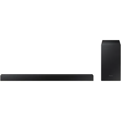 ساندبار سامسونگ HW-T450 از محصولات جدید 2020 می باشد که در کنار تلویزیون وظیفه ی ارتقاء صدا و بالا بردن کیفیت آن را برعهده گرفته است و با امکانات و ویژگی های خوبی مجهز شده است. بخش های تشکیل دهنده ی t450 بلندگوی خطی و ساب ووفر بی سیم هستند. به علاوه این سیستم صوتی از بلندگو های 2.1 کاناله بهره می برد. رنگ بدنه ی مشکی و طراحی زیبا و همه پسندی که دارد می توانند به راحتی نظر هر بیننده ی را به خود جلب کند. این سیستم صوتی از توان بالای 200 وات برخوردار است که قادر است صدای قدرتمندی را ایجاد کند. توسط 3 بلندگو تعبیه شده در آن صدای بیس پرقدرتی را تولید کرده و کاربر از شنیدن صدایی همه جانبه و قدرتمند تجربه ای جدید از شنیدن آهنگ ها و برنامه ها کسب خواهد کرد.