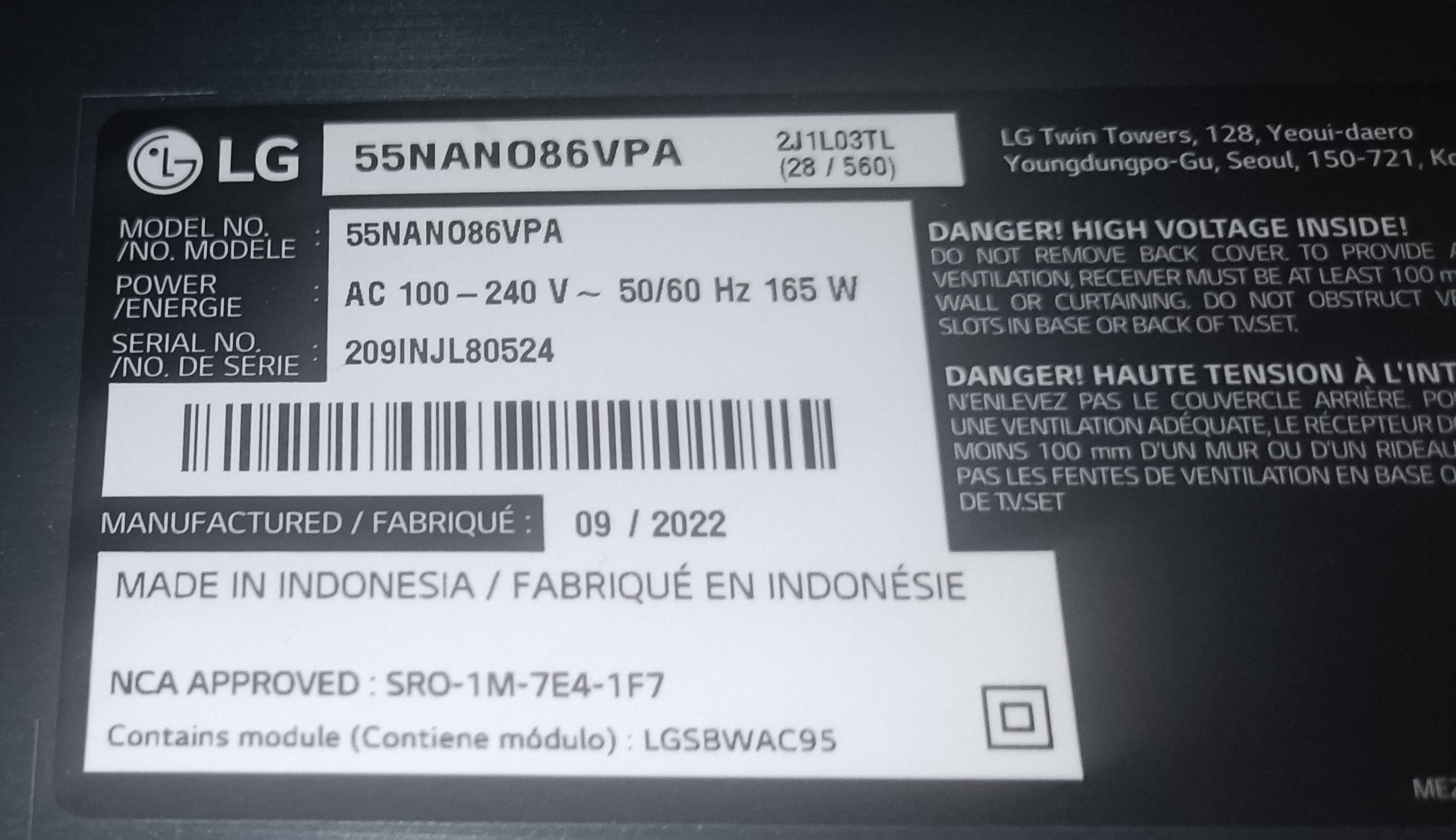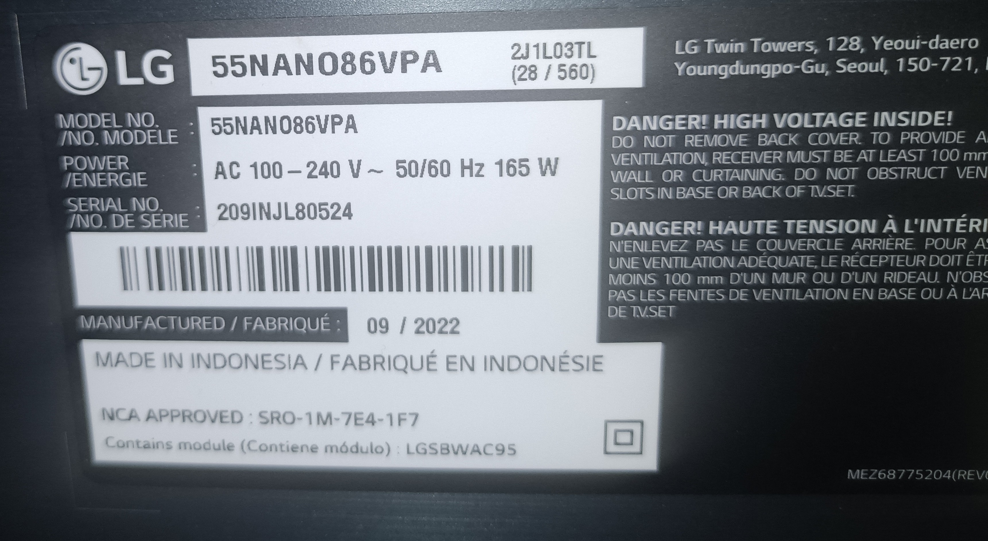- مونتاژ لهستان: 55NANO866PA مونتاژ اندونزی: 55NANO86VPA مونتاژ لهستان: 55NANO863PA مونتاژ اندونزی: 55NANO866PA