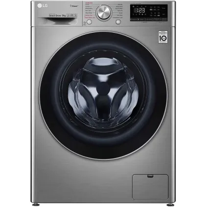 ماشین لباسشویی ال جی F4V5VYP2T یا V5 رنگ نقرهای یکی از ماشین لباسشوییهای 2020 ال جی به شمار میآید. این محصول در فروشگاهها با مدل ماشین لباسشویی ال جی F4V5 یا V5 نیز به مشتری معرفی میشود. محصول فوق در حال حاضر با مدل کامل F4V5VYP2T مونتاژ کشور چین در بازار ایران موجود است. ماشین لباسشویی مذکور دارای ظرفیت 9 کیلوگرم است و برای خانوادههای با جمعیت متوسط و پر جمعیت انتخابی کاملا مناسب است. ماشین لباسشویی 9 کیلویی ال جی F4V5VYP2T دارای موتور دایرکت درایو اینورتر بوده که نسبت به موتورهای قدیمی و معمولی دارای لرزش و سر و صدای کمتر، اما طول عمر بالاتری میباشد. ال جی طول عمر موتور Inverter Direct Drive این ماشین لباسشویی را تا 10 سال نیز تضمین نموده است. ماشین لباسشویی 1400 دور ال جی F4V5VYP2T دارای خشککن نیست، اما به لطف سرعت چرخش نسبتا بالایی که دارد میتواند لباسها را به خوبی آبگیری کرده و با اندکی رطوبت به شما تحویل دهد. سرعت چرخش در برنامههای مختلف شستشو متفاوت از یکدیگر است اما حداکثر سرعت چرخش در این ماشین لباسشویی 1400 دور در دقیقه میباشد.