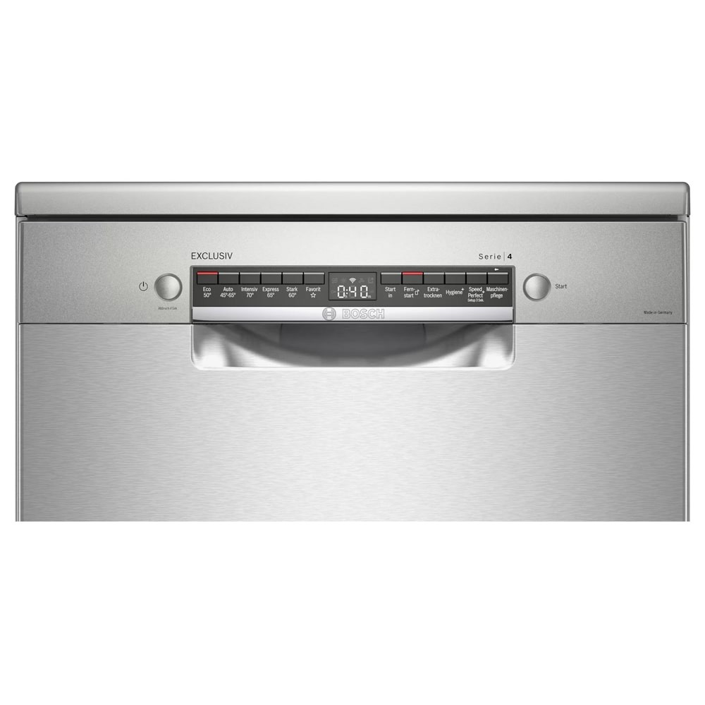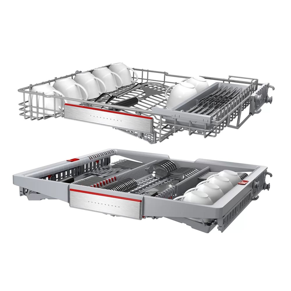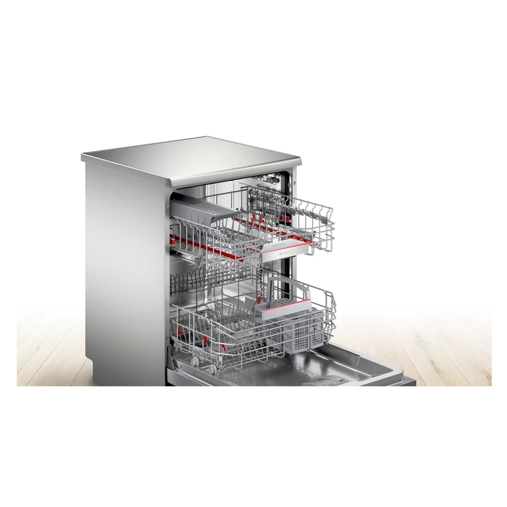 - دارای Wi-Fi برای اتصال به شبکه و اینترنت تمیزکاری کامل برای ظروف بسیار کثیف در طبقه یا سبد بالایی (Extra Clean Zone) شستشوی اقتصادی (Eco) در 235 دقیقه سیستم RackMatic 3-stage برای تنظیم ارتفاع طبقه یا سبد در 3 سطح محفظه داخلی ماشین ظرفشویی از جنس فولاد ضد زنگ (Stainless Steel) برنامه شستشوی Machine Care برای شستشو و تمیز کردن خودکار داخل ماشین ظرفشویی دارای موتور EcoSilence Drive با صدای کم، راندمان و طول عمر بالا و صرفه جویی در مصرف انرژی برنامه Hygiene Plus جهت شستشوی بهداشتی و ضدعفونی کردن ظروف شستشوی سریع (Express Cycle) در 38 دقیقه (Load Sensor) سنسور تشخیص میزان ظروف دارای مبدل حرارتی (Heat Exchanger) برای خشک کردن ظروف دارای نشانگر پر کردن مجدد نمک (Salt Refill Icon) دارای سبد کوچک Vario Basket یا Cutlery Basket مخصوص کارد، قاشق و چنگال Dosing assistant مخصوص انحلال کامل مواد شوینده و نفوذ پذیری بیشتر به داخل لکه ها و ذرات جنس بدنه فولاد ضد زنگ (Stainless Steel) با قابلیت Anti-Fingerprint برای جلوگیری از ماندگاری اثر انگشت روی بدنه قابلیت شروع شستشو با تاخیر از 1 تا 24 ساعت تکنولوژی ActiveWater برای شستشوی بهتر و صرفه جویی در مصرف آب و انرژی دارای سنسور تشخیص میزان کثیفی آب و ظروف (AquaSensor) دارای نشانگر پر کردن مجدد جلادهنده (Rinse Aid Refill Icon) قابلیت برداشتن قسمت بالایی ماشین ظرفشویی (Removable Top (Removable Top Cover)) قابلیت ExtraDry برای خشک کردن بهتر ظروف دارای چرخه Intensive برای شستشوی ظروف بسیار کثیف سیستم Aqua-Stop برای جلوگیری از نشت آب فناوری Speed Perfect Plus با توانایی شستشوی سریع ظروف دارای طبقه یا سبد Vario Drawer یا Cutlery Drawer برای شستوشوی ظروف کوچک آشپزخانه قابلیت Control Lock برای قفل کردن پنل کنترلی ماشین ظرفشویی قابلیت Remote Start برای شروع برنامه شستشو ماشین ظرفشویی از راه دور به کمک موبایل با برنامه Home Connect دارای طبقات یا سبد های قابل تنظیم با سیستم Max Flex Pro سیستم Anti-Slip Protection برای جلوگیری از سر خوردن ظروف در سبد طبقه دوم هنگام شستوشو طراحی کاملا مینیمال برای هماهنگی هر چه بهتر با آشپزخانه شما تکنولوژی Glass Protection برای محافظت از ظروف شیشه ای و ظریف هنگام شستشو