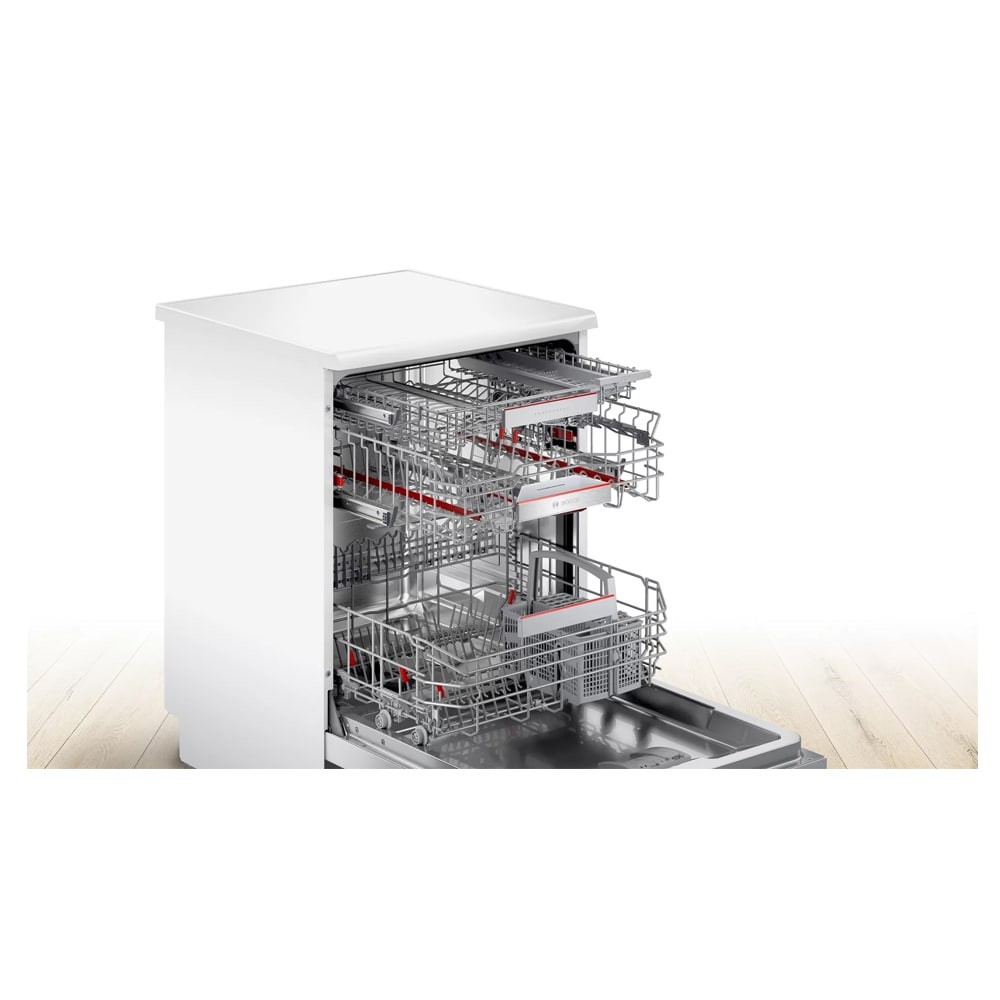 ماشین ظرفشویی بوش SMS4HDW52E از جمله محصولات کمپانی بوش در سال 2021 می باشد که در رنگ سفید تولید و عرضه شده است و با قابلیتهایی عالی که به آن آغشته میباشد میتواند ظروف آشپزخانهی شما را به نحو احسن شستوشو دهد و زیبایی و تمیزی را به آنها هدیه کند. این ماشین ظرفشویی با گنجایش 13 نفرهای که دارد میتواند حجم زیادی از ظروف خانهی شما را در خود جای دهد و روند شستن آنها را به نحوی عالی انجام دهد. ماشین ظرفشویی 13 نفرهی بوش مدل SMS4HDW52E با طراحی شیک و کاربرپسندی که دارد میتواند سبکی عالی از طراحی ایدهآل را مهمان خانههای شما کند. باز شدن درب این ظرفشویی تا زاویهی 90 درجه امکان بیرون آوردن سبدها را به صورت آسان و راحت فراهم میکند. نمای بیرونی زیبا و یکدست این محصول به علاوهی فضای داخلی وسیع و جا دار باعث شده تا این ظرفشویی در میان مردم از محبوبیت خاصی برخوردار باشد. در بالای درب این ظرفشویی میتوانید شاهد صفحه نمایش ال ای دی این دستگاه باشید بنابراین از طریق این پنل اطلاعاتی مربوط به برنامههای شستوشو، درجهی حرارت آب همچنین زمان باقی ماندهی شستوشو را مشاهده خواهید کرد. شایان ذکر است که این محصول از سه سبد مخصوص ظروف در اندازههای مختلف بهره میبرد بدین وسیله فضای زیادی برای قرار دادن ظروف را در اختیار خواهید داشت. این ظرفشویی با برخورداری از موتور قدرتمند و با دوام Eco Silence Drive میتواند بهترین عملکرد را در هنگام شستوشو از خود نشان دهد. این موتور با حضورش باعث بالا رفتن عمر طولانی ظرفشویی خواهد شد از این طریق میتوانید برای مدت زمان زیادی از آن استفاده نمایید. ناگفته نماند این موتور سطح نویز و سر و صدای ظرفشویی را در هنگام کار به حداقل میرساند بنابراین در هنگام شستن ظروف صدایی از آن را نخواهید شنید. طراحی داخلی و چیدمان طبقات بوش sms4hdw52e دقیقاً همان جایی است که کیفیت مهندسی بوش خودش را نشان میدهد. این مدل با بهرهگیری از سه سطح مجزا و سیستم سبدهای انعطافپذیر به کاربر این امکان را میدهد که انواع ظروف با اندازهها و کاربردیهای مختلف را به شکلی منظم، ایمن و بهینه داخل دستگاه قرار دهد. بدون اینکه نگران کمبود فضا یا شستوشوی ناقص باشید. در بالاترین قسمت دستگاه، سبد سوم قرار گرفته که مخصوص قاشق و چنگال، کفگیر، ملاقه و حتی فنجانهای کوچک و کم ارتفاع طراحی شده است. وجود این سبد باعث میشود فضای دو سبد اصلی آزادتر شود و قاشق و چنگالها به صورت جداگانه و کاملاً پخش شده شسته شوند؛ موضوعی که هم به تمیزی بهتر کمک میکند و هم از روی هم قرارگرفتن و باقی ماندن لکهها جلوگیری میکند. این سبد به شکلی طراحی شده که دسترسی به آن بسیار راحت است و هنگام بیرون کشیدن، کاملاً روان حرکت میکند. سبد بالایی ظرفشویی برای ظروف حساستر و سبکتر مثل لیوانها، استکانها، فنجانها، و کاسههای کوچک در نظر گرفته شده . یکی از مهمترین مزایای این سبد، قابلیت تنظیم ارتفاع آن است؛ به این معنا که حتی وقتی سبد پر از ظرف باشد. میتوان ارتفاعش را تغییر داد تا فضای بیشتری برای ظروف بلند در سبد پایین ایجاد شود. این ویژگی به خصوص زمانی کاربردی است که همزمان لیوانهای پایه بلند و قابلمه با بشقابهای بزرگ در یک شستوشو دارید. طراحی گیرهها و شیارهای این سبد به صورت انعطافپذیر انجام شده و به خوبی از لغزش یا برخورد ظروف شیشهای جلوگیری میکند. در پایینترین قسمت دستگاه سبد پایینی قرار دارد و مخصوص ظروف بزرگ و سنگینتر مانند بشقابهای غذاخوری، دیس، قابلمه، تابه و کاسههای بزرگ است. این سبد دارای میلههای نگهدارندهی تاشو است که به شما اجازه میدهد چیدمان داخلی را بر اساس نیاز خود تغییر دهید. مثلاً زمانی که قابلمه یا دیس بزرگ دارید، میتوانید میلهها را بخوابانید تا فضای بیشتری در اختیار داشته باشید. چرخهای روان این سبد باعث میشود بیرون کشیدن و جا زدن آن حتی در حالت پر هم بسیار راحت و بدون فشار انجام شود. در کنار این طراحی هوشمندانه، سبد قاشق و چنگال مجزا نیز در این مدل وجود دارد که در صورت نیاز میتوان از 