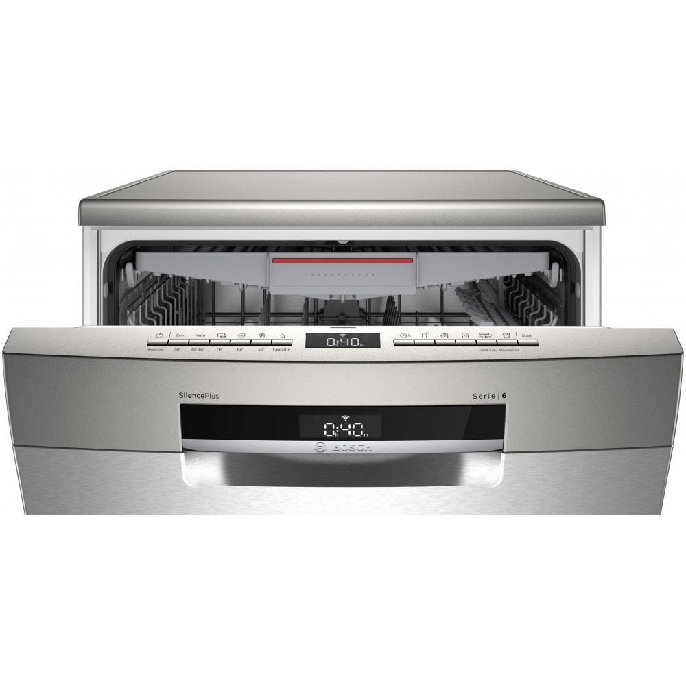 - جنس بدنه فولاد ضد زنگ (Stainless Steel) با قابلیت Anti-Fingerprint برای جلوگیری از ماندگاری اثر انگشت روی بدنه دارای سنسور تشخیص میزان کثیفی آب و ظروف (AquaSensor) دارای سیم برق به طول 175 سانتی متر دارای نشانگر پر کردن مجدد جلادهنده (Rinse Aid Refill Icon) پشتیبانی از برنامه Home Connect برای کنترل و مدیریت ماشین ظرفشویی از طریق موبایل دارای لوله ورودی آب به طول 165 سانتی متر دارای قیف (Funnel) برای پر کردن مخزن نمک ماشین ظرفشویی قابلیت شروع شستشو با تاخیر از 1 تا 24 ساعت قابلیت Half Load برای شستشوی ظروف با نصف ظرفیت قابلیت برداشتن قسمت بالایی ماشین ظرفشویی (Removable Top (Removable Top Cover)) قابلیت Remote Start برای شروع برنامه شستشو ماشین ظرفشویی از راه دور به کمک موبایل با برنامه Home Connect سیستم AquaMix یا Glass Protection System برای کنترل میزان سختی آب و محافظت از ظروف شیشه ای و ظریف سیستم DosageAssist برای ارائه شستشوی بهتر با پخش یکنواخت مواد شوینده در داخل ماشین ظرفشویی سیستم RackMatic 3-stage برای تنظیم ارتفاع طبقه یا سبد در 3 سطح دارای نشانگر پر کردن مجدد نمک (Salt Refill Icon) دارای موتور BLDC بدون برس با طول عمر بالا، صرفه جویی در مصرف انرژی و کاهش سطح سر و صدا شستشوی سریع (Express Cycle) در 38 دقیقه محفظه داخلی ماشین ظرفشویی از جنس فولاد ضد زنگ و تضمین کیفیت آن تا 10 سال توسط بوش دارای لوله تخلیه آب به طول 190 سانتی متر پشتیبانی از اینترنت اشیا (IoT) برای مدیریت و کنترل ماشین ظرفشویی از راه دور برنامه شستشوی Machine Care برای شستشو و تمیز کردن خودکار داخل ماشین ظرفشویی دارای طبقه یا سبد بالا VarioDrawer یا Cutlery Drawer از نوع 3rd Rack 1.1 دارای Wi-Fi برای اتصال به شبکه و اینترنت سیستم AquaStop برای جلوگیری از نشت آب با گارانتی مادام العمر توسط بوش دارای موتور EcoSilence Drive با صدای کم، راندمان و طول عمر بالا و صرفه جویی در مصرف انرژی برنامه شستشوی Silence برای کارکرد با صدای کم (در حدود 40 دسی بل) تکنولوژی Detergent Automation برای صرفه جویی و تنظیم خودکار میزان استفاده از مواد شوینده دارای چرخه Intensive برای شستشوی ظروف بسیار کثیف دارای سیستم تمیز کردن خودکار با فیلتر 3 مرحله ای (Self-cleaning Filter System) دارای طبقات یا سبد های قابل تنظیم با سیستم Flex دارای نگهدارنده مخصوص لیوان های پایه دار (Stemware Holder) دارای مبدل حرارتی (Heat Exchanger) برای خشک کردن ظروف
