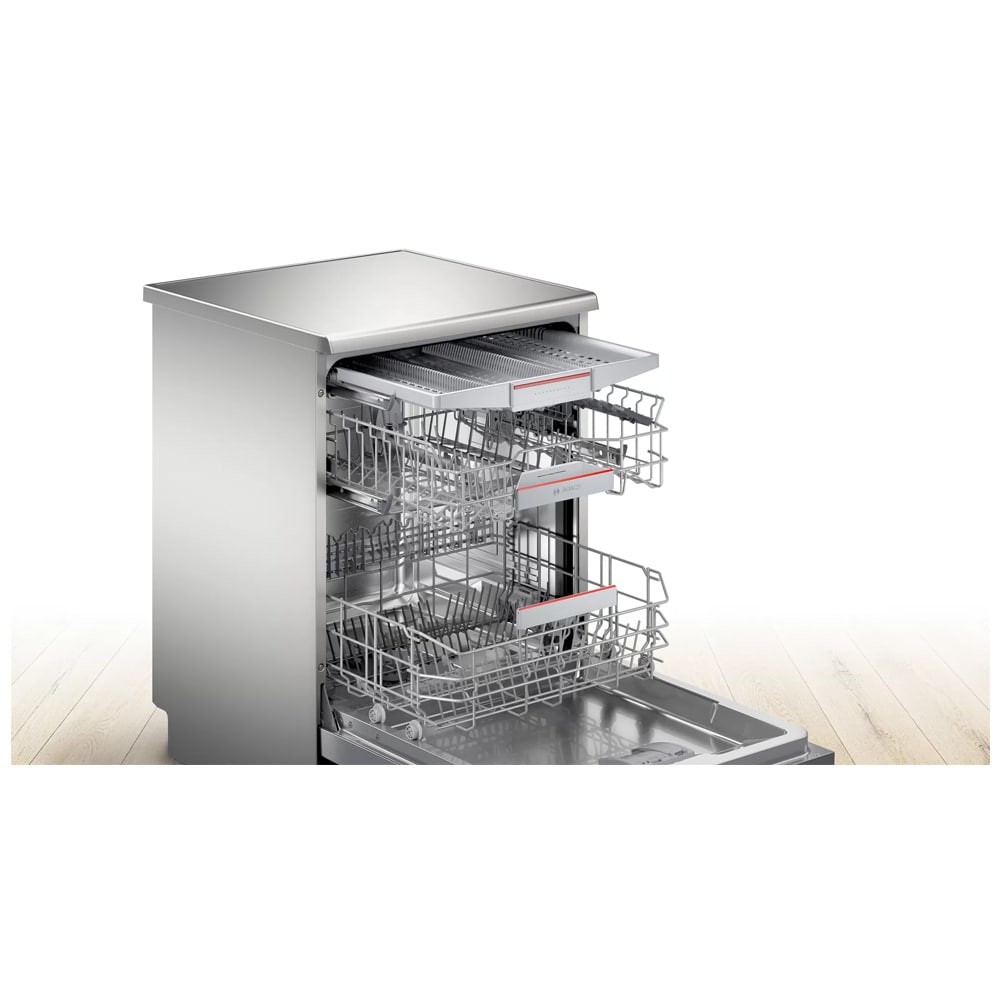 - دارای موتور EcoSilence Drive با صدای کم، راندمان و طول عمر بالا و صرفه جویی در مصرف انرژی محفظه داخلی ماشین ظرفشویی از جنس فولاد ضد زنگ و تضمین کیفیت آن تا 10 سال توسط بوش دارای نشانگر پر کردن مجدد نمک (Salt Refill Icon) دارای نگهدارنده مخصوص لیوان های پایه دار (Stemware Holder) (Load Sensor) سنسور تشخیص میزان ظروف قابلیت Half Load برای شستشوی ظروف با نصف ظرفیت Dosing assistant مخصوص انحلال کامل مواد شوینده و نفوذ پذیری بیشتر به داخل لکه ها و ذرات دارای طبقات یا سبد های قابل تنظیم با سیستم Flex دارای مخزن مواد شوینده و جلادهنده (Detergent and Rinse-Aid Dispenser) قابلیت شروع شستشو با تاخیر از 1 تا 24 ساعت شستشوی اقتصادی (Eco) در 235 دقیقه قابلیت تنظیم ارتفاع طبقات یا سبد ها در 3 سطح مختلف فناوری Speed Perfect Plus با توانایی شستشوی سریع ظروف دارای چرخه Intensive برای شستشوی ظروف بسیار کثیف قابلیت Remote Start برای شروع برنامه شستشو ماشین ظرفشویی از راه دور به کمک موبایل با برنامه Home Connect دارای Wi-Fi برای اتصال به شبکه و اینترنت دارای طبقه یا سبد Vario Drawer یا Cutlery Drawer برای شستوشوی ظروف کوچک آشپزخانه طراحی کاملا مینیمال برای هماهنگی هر چه بهتر با آشپزخانه شما قابلیت Child Lock برای قفل کردن پنل کنترلی ماشین ظرفشویی دارای نشانگر پر کردن مجدد جلادهنده (Rinse Aid Refill Icon) دارای قیف (Funnel) برای پر کردن مخزن نمک ماشین ظرفشویی سیستم Aqua-Stop برای جلوگیری از نشت آب مجهز به برنامه PreWash (پیش شستشو)