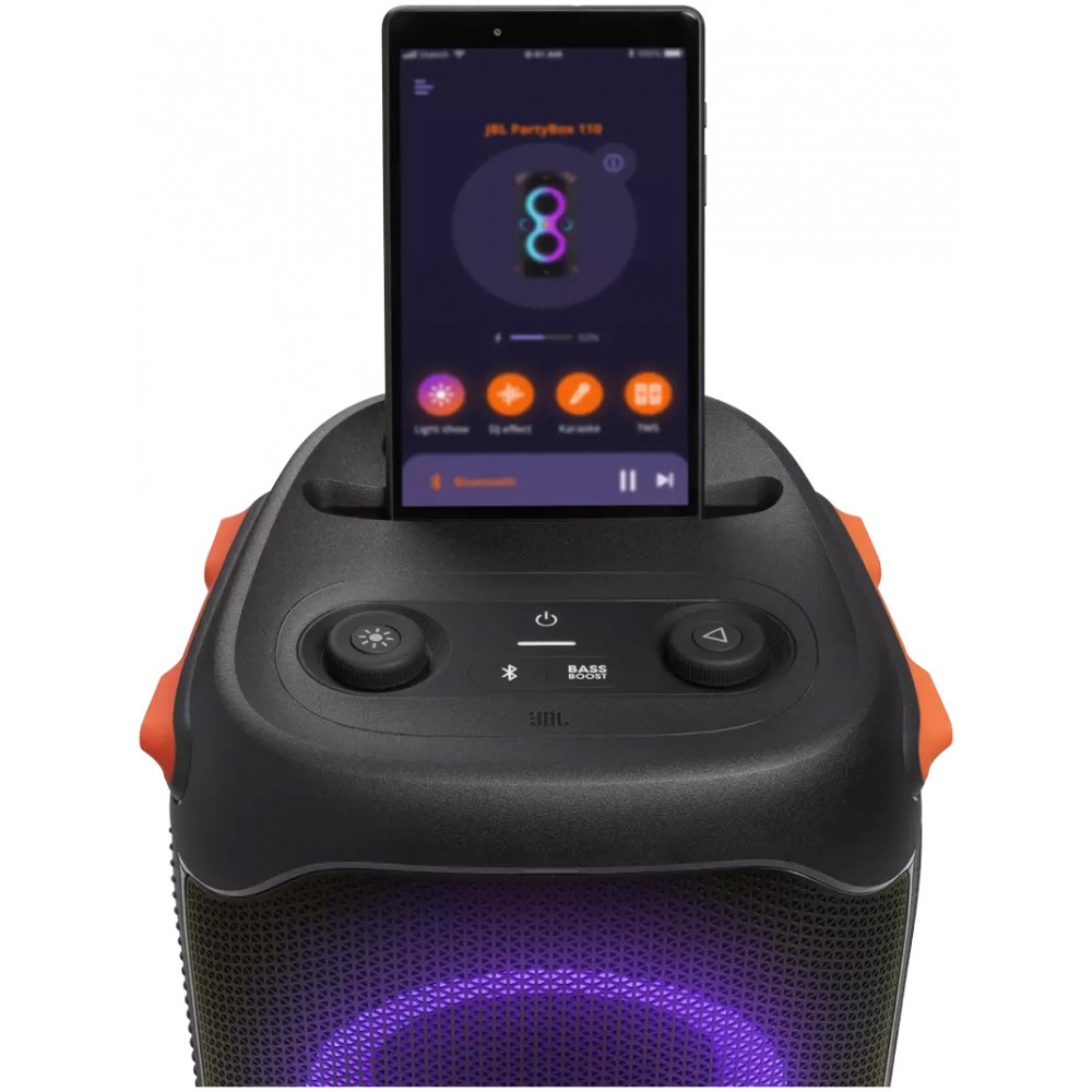 اسپیکر جی بی ال PartyBox 110 یکی از محصولات 2021 می باشد. این اسپیکر با توجه به سایز کوچکی که دارد، صدای قدرتمندی ارائه می دهد و به راحتی می تواند علاوه بر استفاده خانگی، در محیط بیرون از خانه نیز مورد استفاده قرار گیرد. اسپیکر پارتی باکس 110 یکی از ارزانترین اسپیکر های بلوتوثی جی بی ال از سری PartyBox است. این اسپیکر مدل جدیدتر و بهبود یافته اسپیکر جی بی ال PartyBox 100 است که در گذشته معرفی شده بود. برخلاف مدل قبلی، اسپیکر فوق دارای استاندارد IPX4 بوده و در مقابل آب تا حدودی مقاوم است. همچنین این محصول از نرم افزار PartyBox پشتیبانی کرده و بیشتری را در اختیار شما قرار می دهد. اسپیکر PartyBox 110 دارای کانال صوتی 2 می باشد که متشکل از 2 توییتر و 2 ووفر قدرتمند است. محصول فوق، قدرت خروجی صدای 160 وات داشته و به تکنولوژی Bass Boost جهت تقویت صدای باس مجهز می باشد. 2 حالت مختلف برای سیستم تقویت کننده باس در نظر گرفته شده است تا بسته به نوع محیط و سلیقه خود بتوانید قدرت صدای بیس را کنترل و تنظیم کنید. جی بی ال از فناوری Bass Reflex استفاده کرده و با قرار دادن حفره مخصوص در قسمت پشت دستگاه، امکان تولید صدای باس بسیار قدرتمندتری را فراهم ساخته است. بلندگوی جی بی ال Party Box 110 به باتری لیتیوم یوتی مدل IDA108GA با ظرفیت 5000 میلی آمپر مجهز است که امکان پخش موزیک بطور متداوم تا حداکثر 12 ساعت را فراهم می سازد. لازم به ذکر است که حداکثر زمان کار اسپیکر کاملا بستگی به نوع استفاده از آن دارد. شارژ این اسپیکر توسط برق شهر انجام شده و در حدود 3.5 ساعت طول می کشد تا بطور کامل شارژ شود. اسپیکر قابل حمل جی بی ال پارتی باکس 110 به بلوتوث نسخه 5.1 مجهز است. به این ترتیب به راحتی می توانید لوازم مختلف از جمله گوشی هوشمند را از طریق بلوتوث به این اسپیکر متصل کرده و آهنگهای خود را از بلندگوی بلوتوثی خود پخش کنید. همچنین این اسپیکر دارای قابلیت True Wireless Stereo (TWS) است که با استفاده از آن می توانید یک اسپیکر بلوتوثی پارتی باکس دیگر را نیز به این بلندگو متصل کنید تا صدای قدرتمندتری تولید شود. با نصب نرم افزار Partybox روی گوشی هوشمند خود می توانید 2 حالت Party یا Stereo را برای قابلیت TWS تنظیم کنید. با نصب این اپلیکیشن روی گوشی هوشمند اندرویدی یا iOS، می توانید اسپیکر بلوتوثی خود را کنترل کرده و از امکانات فوق العاده این نرم افزار استفاده کنید. توسط اپلیکیشن PartyBox امکان تنظیمات کارائوکه، استفاده از افکتهای DJ و همچنین شخصی سازی رقص نور وجود دارد. اسپیکر بلوتوثی جی بی ال PartyBox 110 دارای ورودی میکروفون و گیتار است و از قابلیت کارائوکه (Karaoke) نیز پشتیبانی می کند. به این ترتیب می توانید به خوانندگی و نوازندگی بپردازید و شور و نشاط دیگری به میهمانی های خود بدهید. امکان تنظیم میزان سطح و حساسیت صدا (Gain) برای میکروفون و گیتار به صورت جداگانه وجود دارد تا کنترل کاملی روی صدای خواننده و نوازنده داشته باشید. همچنین افکت های کارائوکه مانند Echo، Bass و Treble از طریق نرم افزار PartyBox قابل تنظیم بوده و می توانید کنترل کاملتری روی صدای میکروفون خود داشته باشید. در قسمت پشت این محصول ورودی USB وجود دارد و شما می توانید با اتصال حافظه فلش به این پورت، آهنگ های موجود در حافظه را پخش کنید. همچنین این پورت دارای ولتاژ 5 ولت و توان 2.1 آمپر می باشد و می توانید از طریق آن دستگاه های دیگر مانند موبایل یا تبلت را شارژ کنید. این اسپیکر دارای ورودی و خروجی AUX بوده و از قابلیت Daisy Chain پشتیبانی می کند تا بتوانید علاوه بر پخش آهنگ از طریق کابل، بلندگوهای دیگر را نیز از همین طریق به این محصول متصل کرده و صدای قدرتمند تری را تجربه کنید. طراحی اسپیکر پرتابل JBL PartyBox 110 به گونه ای است که به راحتی می توانید آن را جا به جا کرده و مهمانی های خود را به هر مکانی که می خواهید ببرید. برای این کار 2 دستگیره در نظر گرفته شده است تا حمل و نقل به آسانی صورت گیرد. این اسپیکر امکان قرار گیری به صورت ایستاده یا خوابیده را دارد. دکمه های کنترلی اصلی آن در قسمت بالا قرار 