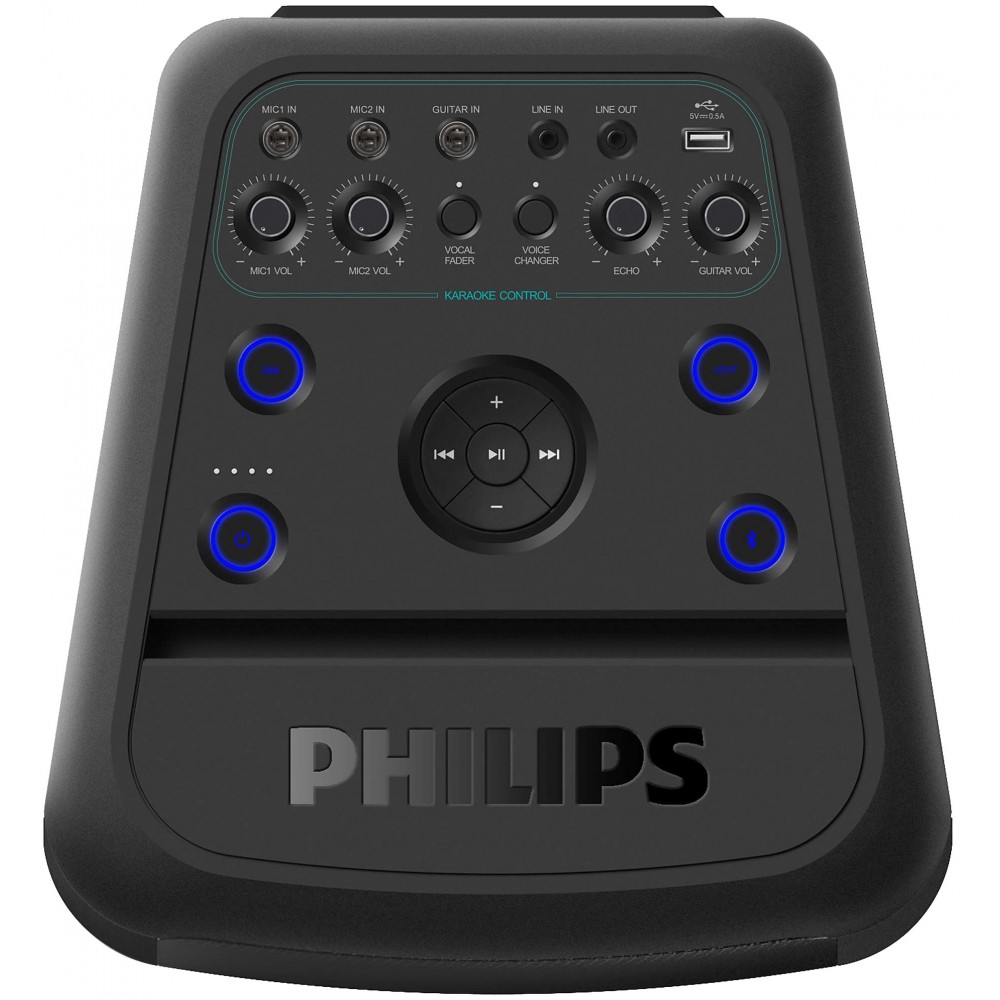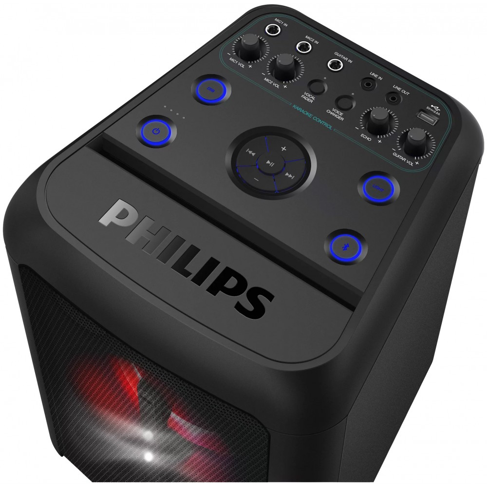 اسپیکر فیلیپس TANX100 یکی از محصولات 2020 است که با نام NX100 نیز در بازار شناخته می شود. این اسپیکر از جمله بلندگوهای سری 1000 فیلیپس است که برای مهمانی ها و دورهمی های کوچک گزینه مناسبی می باشد. اسپیکر TANX100 یکی از ارزان ترین اسپیکر های بلوتوثی قابل حمل فیلیپس در سال 2020 می باشد. به گفته فیلیپس، اسپیکر قابل حمل (پرتابل) TANX100 دارای حداکثر توان خروجی 80 وات است ولی توان خروجی صدای واقعی (RMS) آن برابر 40 وات می باشد. احتمال انحراف فرکانس صدا یا Total Harmonic Distortion (THD) در این اسپیکر، حدود 1% است که برای یک بلندگوی ارزان قیمت نسبتا مناسب می باشد. این بلندگوی پرتابل فیلیپس دارای 2 توییتر و 1 ووفر قدرتمند در قسمت جلو است. اسپیکر فوق از 1 کانال صوتی برخوردار بوده و قابلیت پخش صدا به صورت Mono را دارد. این محصول مجهز به قابلیت Dynamic Bass Boost یا DBB است که باعث تقویت صدای باس خروجی می شود و در 2 حالت قابل تنظیم می باشد. همچنین اسپیکر فوق دارای سیستم Bass Reflex است و به کمک حفره هایی که در قسمت جلویی این محصول تعبیه شده است، باعث تقویت ضربات صدای باس می شود. با وجود تمام اینها باید گفت که این محصول به عنوان یک اسپیکر ارزان قیمت، صدای باس قابل قبولی دارد ولی نمی توان از آن انتظار زیادی داشت. این اسپیکر 40 وات فیلیپس، قابلیت Digital Sound Control دارد و قادر به کنترل و بهبود صدا به صورت دیجیتال می باشد. پارتی اسپیکر بلوتوثی فیلیپس TANX100 دارای 1 پورت ورودی صدای 3.5 میلیمتری است و به راحتی می توانید انواع پخش کننده های صوتی مانند موبایل یا MP3 Player را به آن متصل کنید و آهنگ مورد علاقه خود را از این طریق پخش کنید. همچنین بلندگوی فوق مجهز به 1 ورودی USB 2.0 است که می توانید با متصل کردن حافظه فلش به این پورت، موزیک های مورد علاقه خود را پخش کنید. لازم به ذکر است که محصول فوق فقط از سیستم فایل FAT12، FAT16 و FAT32 پشتیبانی می کند، لذا باید در هنگام استفاده از حافظه فلش، به این نکته دقت فرمایید. از جمله ویژگی های بسیار خوب این اسپیکر قابل حمل، وجود بلوتوث داخلی نسخه 5 با شعاع عملکرد 10 متر است که به شما این امکان را می دهد تا گوشی هوشمند خود را از طریق بلوتوث به محصول فوق متصل کرده و آهنگ های مورد علاقه خود را پخش کنید. همچنین بلندگوی فوق دارای قابلیت Multipoint (Multipair) Support است و می توانید به طور همزمان 2 موبایل را از طریق بلوتوث به آن متصل کنید. بلندگوی فیلیپس TANX100 دارای 2 پورت ورودی میکروفون از نوع 6.3 میلیمتری بوده و قابلیت کارائوکه (Karaoke) دارد که به شما این امکان را می دهد تا با متصل کردن میکروفون به این اسپیکر، به خوانندگی همراه با آهنگ مورد نظر خود بپردازید. قابلیت Vocal Fader در اسپیکر فوق وجود دارد که با فعال کردن آن صدای خواننده در آهنگ کم خواهد شد و به راحتی می توانید بجای خواننده اصلی ایفای نقش کنید. علاوه بر این، این اسپیکر دارای قابلیت Voice Changer نیز می باشد که می توانید با استفاده از آن، تن صدای ورودی از میکروفون را در 3 حالت مختلف تغییر داده و حتی صدای خود را به مرد یا زن تبدیل کنید. در قسمت بالای اسپیکر دکمه های پیچی مخصوص تنظیم سطح صدای میکروفون و یا ایجاد افکت اکو (Echo) در اختیار شما قرار دارد. محصول فوق دارای 1 پورت ورودی مجزا برای گیتار است که به شما این امکان را می دهد تا به نوازندگی نیز بپردازید. اسپیکر ایستاده فیلیپس TANX100 بدنه ای از جنس پلاستیک فشرده دارد و تا حد زیادی در برابر ضربه مقاوم است. این اسپیکر دارای 4 پایه لاستیکی است و فقط به صورت ایستاده روی سطوح مختلف قرار می گیرد. بلندگوهای این محصول تماما در قسمت جلو قرار گرفته اند و توسط توری فلزی محافظت می شوند. این اسپیکر وزن بسیار کمی دارد و با توجه به دستگیره ای که در پشت آن تعبیه شده است، به راحتی می توانید محصول فوق را جابجا کنید. تمامی دکمه ها و ورودی و خروجی های مورد نیاز، در قسمت بالایی اسپیکر فوق قرار داشته و به راحتی در دسترس می باشند. یک شیار مخصوص در قسمت بالایی این اسپیکر تعبیه شده است که برای نگهداری موبایل یا تبلت در هنگام ک