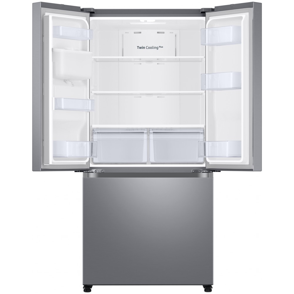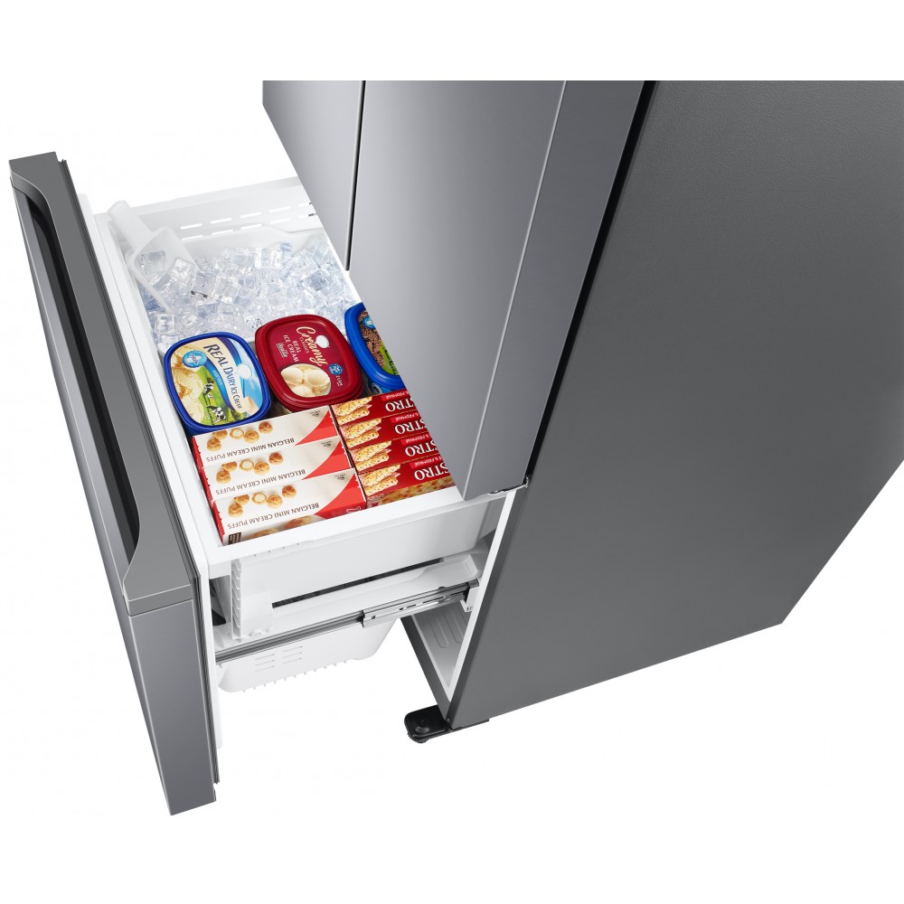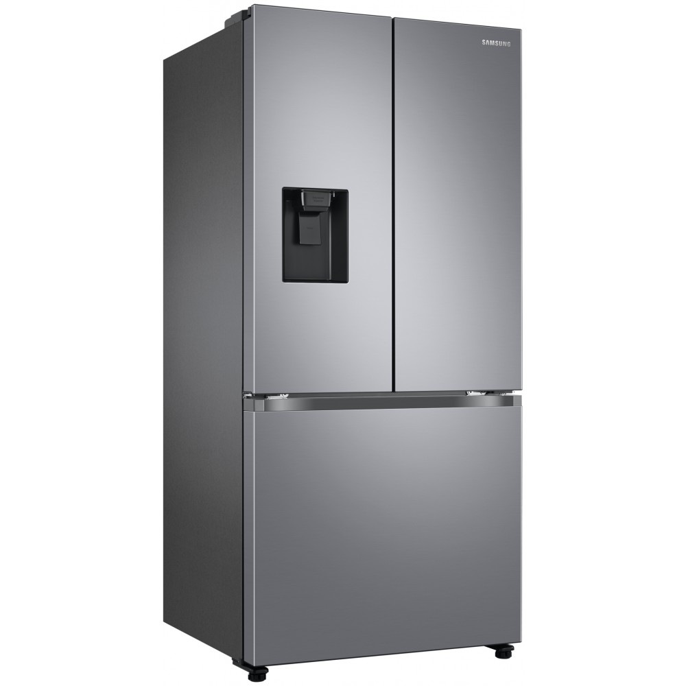 یخچال فریزر سامسونگ RF49 یا RF49A5202SL رنگ نقره ای یکی از یخچال فریزر های 2021 سامسونگ است. این محصول در بازار به RF49 معروف است و حتی ممکن است با مدل RF5000A نیز معرفی شود، اما در واقع مدل کامل محصول پیش روی شما نیست و ممکن است مشخصات یا طراحی آن با محصولات مشابه که با این مدل معرفی می شوند متفاوت باشد. محصول پیش روی شما با مدل کامل RF49A5202SL/LV وارد کشور شده است. این یخچال فریزر سه درب از نظر امکانات و طراحی، تفاوتی با یخچال فریزر سامسونگ RF25A5202 ندارد و عملا دو محصول با ویژگی های یکسان هستند. محصول پیش روی شما از ظرفیت کل 563 لیتر برخوردار است که معادل 20 فوت می باشد. البته ممکن است برخی فروشگاه ها یخچال فریزر 20 فوت سامسونگ RF49 را با ظرفیت 26 فوت یا 28 فوت معرفی کرده و به فروش برسانند که البته کاملا تبلیغاتی است. این یخچال فریزر 563 لیتر سامسونگ یکی از انواع یخچال فریزر های بالا پایین سامسونگ می باشد که یخچال در قسمت بالا و فریزر در قسمت پایین قرار گرفته است. ظرفیت کلی یخچال معادل 370 لیتر، و ظرفیت کلی بخش فریزر معادل 193 لیتر می باشد. البته موارد گفته شده ظرفیت خالص یا واقعی این محصول نیست. ظرفیت واقعی یا قابل استفاده این یخچال فریزر در واقع 470 لیتر است که شامل 354 لیتر در بخش یخچال و 116 لیتر در بخش فریزر است. یخچال فریزر بالا پایین سامسونگ RF49 به کمپرسور اینورتر دیجیتال یا Digital Inverter مجهز است. این محصول امکان تنظیم سرعت موتور دارد و می تواند دمای داخل یخچال فریزر را تقریبا ثابت نگه دارد. این ویژگی باعث صرفه جویی در مصرف انرژی شده و هزینه ها را نیز کاهش می دهد. در ساخت موتور این یخچال فریزر اینورتر سامسونگ، از بهترین و با کیفیت ترین قطعات استفاده شده که باعث افزایش عمر موتور شده است. سامسونگ عملکرد صحیح کمپرسور این محصول را تا 10 سال تضمین کرده است. محصول فوق جزو یخچال فریزر های کم صدا محسوب می شود و سامسونگ حداکثر صدای تولید شده توسط آن را معادل 40 دسی بل اعلام کرده است. این محصول به سیستم تهویه هوای Twin Cooling Plus مجهز می باشد که هوا را به صورت جداگانه در یخچال و فریزر به گردش در می آورد. این سیستم باعث می شود دما و رطوبت یخچال و فریزر حفظ شود و مواد غذایی برای مدت طولانی تری تازه بمانند. به لطف این سیستم، عطر و بوی مواد غذایی که در یخچال و فریزر قرار دارند حفظ شود و روی طعم غذا های دیگر تاثیری نگذارند. محصول پیش روی شما به سیستم No Frost مجهز است و جزو یخچال فریزر های بدون برفک سامسونگ به حساب می آید. متاسفانه این یخچال فریزر هوشمند نیست و به شبکه یا اینترنت متصل نمی شود. این محصول قابلیت های پیشرفته ای ندارد اما امکانات خوبی در اختیار کسانی که به دنبال یک یخچال فریزر با کیفیت هستند می گذارد. یخچال فریزر فرنچ سامسونگ RF49 به آب ریز و یخ ساز اتوماتیک مجهز است اما متاسفانه یخ ریز ندارد. سامسونگ ادعا کرده در ساخت آب ریز این یخچال فریزر از مواد شیمیایی مضر که در اغلب محصولات پلاستیکی یافت می شود استفاده نکرده است و اصطلاحا این یخچال فریزر از نوع BPA-Free می باشد. در کنار اهرم آب ریز کلید مخصوصی قرار دارد که می توانید از آن برای قفل و غیرفعال کردن بخش آب ریز استفاده کنید. یخچال فریزر پیش روی شما امکان اتصال به آب شهر را دارد، اما متاسفانه تنها برای یخ ساز کاربرد دارد و بخش آب ریز مجهز به یک مخزن مجزا است که باید به صورت دستی پر شود. یخ ساز این محصول در قسمت فریزر قرار گرفته است و می تواند یخ حبه ای تولید کند. یخ ها داخل قفسه مخصوصی که برای این کار در نظر گرفته است ریخته می شوند و به راحتی قابل دسترس می باشند. همانطور که گفته شد این یخ ساز به صورت خودکار عمل می کند، اما در صورتی که از آن استفاده نمی کنید، می توانید بخش یخ ساز را از طریق دکمه مخصوصی که روی پنل قرار دارد غیرفعال کنید. این یخچال فریزر دارای پنل کنترل لمسی می باشد که در داخل بخش یخچال قرار گرفته است. شما از طریق این پنل می توانید وضعیت یخچال را مشاهده کرده و تنظیمات لازم را انجام دهید. پنل کنترلی این