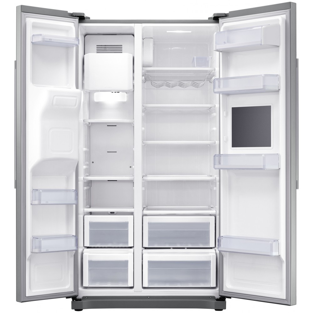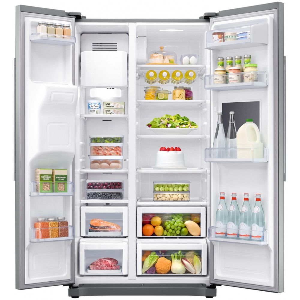 یخچال فریزر سامسونگ RS50 یا RS50N3913SA رنگ نقره ای از جمله یخچال فریزر های 2018 و سری 6 سامسونگ است. این محصول در بازار با عنوان یخچال فریزر سامسونگ RS3000 یا RS50N3913 نیز شناخته می شود و به یخچال فریزر آمریکایی سامسونگ معروف است. یخچال فریزر RS50 در رنگ های مختلف و با امکانات متفاوت تولید می شود. رنگ نقره ای یا همان تیتانیوم نقره ای این یخچال فریزر، با مدل کامل RS50N3913SA/EU مونتاژ چین وارد کشور شده و پیش روی شما قرار دارد. یخچال فریزر سامسونگ RS50 N3913SA به موتور دیجیتال اینورتر یا Digital Inverter مجهز می باشد. کمپرسور های اینورتر به دلیل طراحی و ساختاری که دارند، لرزش کمتری داشته و نسبت به کمپرسور های معمولی صدای کمتری تولید می کند. به گفته سامسونگ حداکثر صدای تولید شده توسط این یخچال فریزر برابر با 43 دسی بل است. موتور این محصول از کیفیت بسیار خوبی برخوردار می باشد و سامسونگ عمر و عملکرد صحیح این موتور را تا 10 سال تضمین کرده است. این کمپرسور اینورتر قابلیت تنظیم سرعت خود را دارد که باعث می شود دمای یخچال فریزر پیش روی شما تقریبا ثابت بماند و در مصرف انرژی صرفه جویی شود. سامسونگ از سیستم Multi Flow در محصول مذکور استفاده کرده است که باعث گردش یکنواخت هوا در کل یخچال فریزر می شود. این محصول به سیستم خنک کننده یکپارچه یا Mono Cooling مجهز است و از یک سیستم مشترک برای خنک کردن بخش یخچال و فریزر استفاده می کند. محصول پیش روی شما به سیستم No Frost مجهز است و جزو یخچال فریزر های بدون برفک سامسونگ به حساب می آید. ظرفیت کل این یخچال فریزر ساید بای ساید سامسونگ برابر با 551 لیتر (20 فوت) می باشد. یخچال فریزر 20 فوت سامسونگ RS50N3913SA ممکن است در بازار با ظرفیت 30 فوت نیز معرفی شده و به فروش برسد که البته اشتباه بوده و کاملا تبلیغاتی است. ظرفیت کلی بخش یخچال برابر با 359 لیتر یا 13 فوت می باشد. در حالی که ظرفیت کل بخش فریزر این محصول معادل 192 لیتر یا 7 فوت است. البته موارد ذکر شده ظرفیت واقعی و قابل استفاده این یخچال فریزر نیست. محصول پیش روی شما از ظرفیت واقعی 501 لیتر برخوردار است که شامل 357 لیتر در بخش یخچال و 144 لیتر در بخش فریزر می باشد. این محصول از جمله یخچال فریزر های دو درب سامسونگ است و یخچال در قسمت راست، و فریزر در قسمت چپ آن قرار دارد. البته یخچال فریزر دو درب سامسونگ RS50N3913 رنگ نقره ای دارای مینی بار یا Home Bar است و یک درب کوچک برای دسترسی آسان به برخی از مواد غذایی که بیشتر مصرف می شوند دارد. این درب فاقد دستگیره می باشد و شما با فشار دادن درب می توانید آن را باز کرده و به بخش مینی بار دسترسی داشته باشید. این یخچال ساید سامسونگ مجهز به آب ریز و یخ ریز است که روی درب فریزر قرار دارند. یخچال فریزر پیش روی شما قابلیت تولید یخ حبه ای و خرد را دارد که توسط پنل کنترلی می توانید نوع یخ خروجی را انتخاب کنید. این یخچال فریزر به آب شهر متصل می شود و فاقد مخزن آب می باشد. به این ترتیب برای استفاده از آب ریز یا یخ ساز، نیازی به پر کردن دستی مخزن نخواهید داشت. این محصول مجهز به فیلتر آب نیز می باشد که آب ورودی به یخچال فریزر را تصفیه می کند. پنل کنترلی این محصول از نوع فشاری است و در قسمت آبریز و یخ ریز آن قرار دارد. شما از طریق این پنل می توانید دمای یخچال و فریزر را مشاهده کرده و کنترل کنید. همچنین امکان مشاهده وضعیت و تغییر تنظیمات دیگر این یخچال فریزر از طریق همین پنل وجود دارد. متاسفانه این یخچال فریزر امکان اتصال به شبکه و اینترنت ندارد و هوشمند نیست، اما برای کسانی که به دنبال یک یخچال خوب، با کیفیت و ساده هستند، امکانات خوبی ارائه می دهد. محصول پیش روی شما دارای قابلیت Power Freeze است که از طریق پنل کنترل می توانید آن را فعال یا غیرفعال کنید. با فعال کردن این ویژگی، موتور با حداکثر توان ممکن عمل می کند تا دمای فریزر را در کمترین زمان ممکن به حد مورد نظر برساند. این محصول دارای حالت تعطیلات یا Vacation Mode نیز می باشد که فعال کردن آن باعث می شود این یخچال فریزر به حالت کم مصرف برود و کمتری