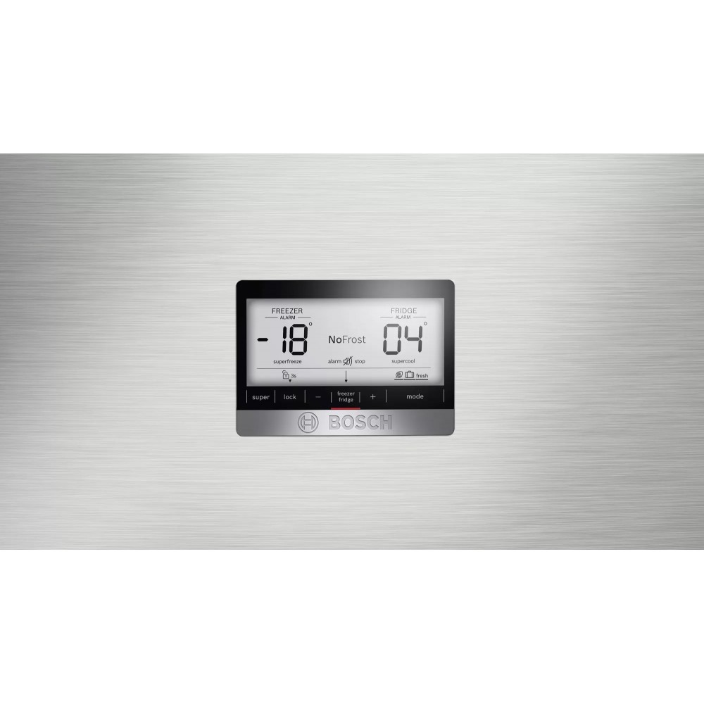یخچال فریزر بوش KDD86AI304 رنگ نقره ای، یکی از جدیدترین یخچال فریزر های 2021 و سری 6 بوش است. این محصول ممکن است در بازار با عنوان یخچال فریزر بوش 86AI304 نیز شناخته شود، که البته مدل کامل آن نیست. همچنین برخی از فروشگاه ها اشتباها بجای حرف I از L در مدل این محصول استفاده می کنند و آن را با عنوان یخچال فریزر بوش KDD86AL304 نیز معرفی می کنند. این یخچال فریزر با مدل کامل KDD86AI304/04 مونتاژ ترکیه وارد کشور ما شده است و با همین مدل نیز در فروشگاه سلام بابا به فروش می رسد. محصول پیش روی شما دارای ظرفیت کل 687 لیتر (24 فوت) است که شامل 505 لیتر در قسمت یخچال و 182 لیتر در بخش فریزر می باشد. البته ظرفیت واقعی یا قابل استفاده یخچال فریزر 24 فوت بوش KDD86AI304 در واقع برابر با 641 لیتر می باشد. ظرفیت واقعی بخش یخچال 493 لیتر، و بخش فریزر معادل 148 لیتر است. بطور کلی ظرفیت این یخچال فریزر برای یک خانواده با جمعیت کم یا متوسط بسیار مناسب می باشد. این محصول دارای 2 درب است که به صورت بالا و پایین قرار گرفته اند. یخچال فریزر دو درب بوش KDD86AI304 رنگ نقره ای طراحی شیک دارد و با اکثر دکوراسیون ها سازگار است. بدنه این محصول از جنس استیل ضد زنگ (Stainless Steel) است و به قابلیت inox EasyClean و Anti-Fingerprint مجهز است که از بجا ماندن اثر انگشت روی بدنه جلوگیری می کند و نظافت آن نیز آسان تر است. دستگیره درب این یخچال فریزر از نوع نواری است و طراحی شیک دارد. بطور پیش فرض درب این محصول به سمت راست باز می شود اما بوش قابلیت Door Reversible را برای این یخچال فریزر در نظر گرفته است و شما می توانید جهت باز شدن درب را تغییر دهید. البته پیشنهاد می شود برای انجام این کار از یک متخصص کمک بگیرید. همانطور که می دانید محصول پیش روی شما دارای آب ریز است اما متاسفانه فاقد یخ ریز می باشد. بخش آب ریز روی درب پایینی قرار دارد که به راحتی در دسترس است. روی درب بالایی نیز پنل کنترلی یخچال فریزر قرار دارد که از نوع LCD بوده و به دکمه های لمسی مجهز می باشد. از طریق این پنل می توانید وضعیت یخچال فریزر را مشاهده کرده و تنظیمات مورد نیاز را روی محصول اعمال کنید. این محصول به قابلیت Child Lock مجهز است که با فعال کردن آن، پنل کنترل قفل می شود تا از ایجاد تغییرات ناخواسته جلوگیری شود. یخچال فریزر بالا پایین بوش KDD86AI304 دارای دو بخش یخچال و فریزر می باشد که بخش فریزر این محصول در بالا، و بخش یخچال در قسمت پایین آن قرار گرفته است. فریزر این محصول دارای 2 قفسه است. شما می توانید قفسه شیشه ای این بخش را به راحتی خارج کرده و نظافت کنید. همچنین امکان تنظیم ارتفاع این قفسه نیز وجود دارد تا بتوانید انواع مواد غذایی بزرگ و کوچک را درون فریزر جای دهید. این محصول مجهز به یخ ساز دستی با قابلیت تولید یخ حبه ای است که داخل فریزر و روی قفسه شیشه ای ذکر شده نصب می شود. متاسفانه محصول پیش روی شما امکان اتصال به آب شهر ندارد و شما باید بخش یخ ساز را به صورت دستی پر کنید. این یخ ساز دارای محفظه مخصوص برای نگه دادی یخ های تولید شده است. به کمک اهرمی که روی یخ ساز قرار دارد می توانید به راحتی یخ های تولید شده را درون محفظه مذکور خالی کنید. روی درب فریزر نیز 2 قفسه بزرگ وجود دارد که برای نگهداری مواد غذایی و ظروف کوچکتر مناسب می باشند. متاسفانه این یخچال فریزر هوشمند نیست، اما امکانات خوبی برای کسانی که به دنبال یک یخچال فریزر ارزان قیمت و با کیفت می گردند دارد. یخچال فریزر بدون برفک بوش KDD86AI304 دارای قابلیت Super Freezing است که با فعال کردن آن، بخش فریزر در سریع ترین زمان ممکن به دمای مورد نظر می رسد. همچنین این محصول به قابلیت Super Cooling مجهز می باشد که باعث می شود دمای داخل یخچال سریع تر به کمترین میزان برسد و مواد غذایی سریع تر خنک شوند. یخچال فریزر پیش روی شما بطور کلی 3 حالت پیشفرض (Holiday، Energy-Saving و Freshness) دارد که با توجه به شرایط و نیاز خود می توانید یکی از آن ها را انتخاب کنید. با انتخاب حالت تعطیلات یا Holiday Mode، دمای یخچال بطور خودکار روی 14 درجه سانتیگراد تنظیم می شود و 