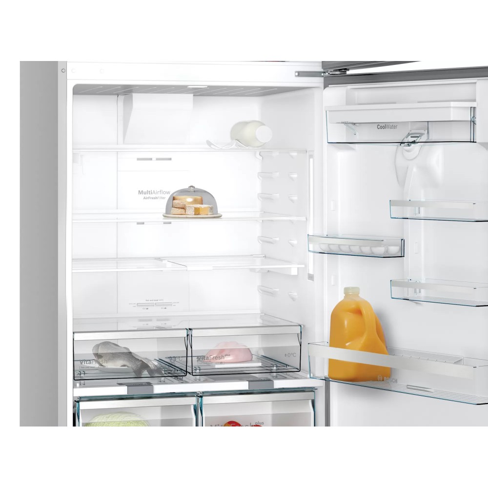 - سیستم تهویه هوای MultiAirFlow برای توزیع هوای سرد یکنواخت در کل یخچال و فریزر از طریق دریچه های هوای متعدد قفسه Bottle Shelf مخصوص نگهداری بطری ها طراحی Perfect Fit برای جلوگیری از برخورد درب یخچال به دیوار و وسایل کناری یخچال و دسترسی راحت به کشوها حتی با باز بودن 90 درجه درب قابلیت Door Alarm برای اطلاع دادن در صورت باز ماندن درب یخچال حالت کم مصرف یا Energy-Saving Mode و تنظیم خودکار دمای یخچال فریزر برای صرفه جویی در مصرف انرژی مناسب برای مناطق جغرافیایی با آب و هوای گرمسیری (Tropical) یا T قابلیت Super Cooling برای سرمایش سریع در یخچال کشوی VitaFresh Plus مخصوص نگهداری گوشت و ماهی، با قابلیت تنظیم دما در حدود 0 درجه برای افزایش ماندگاری و حفظ تازگی مواد غذایی مناسب برای مناطق جغرافیایی با آب و هوای نیمه معتدل (Extended temperate) یا SN قابلیت Door Reversible برای تنظیم و تغییر جهت باز شدن درب ها به سمت چپ یا راست قفسه Bottle Holder مخصوص نگهداری بطری های بزرگ و بلند در درب یخچال و جلوگیری از افتادن آن ها در زمان باز و بست شدن درب سیستم بدون برفک (No Frost) حالت تعطیلات یا Holiday Mode برای کاهش مصرف انرژی یخچال (مخصوص مسافرت های طولانی) جنس بدنه استیل ضد زنگ (inox EasyClean) با قابلیت Anti-Fingerprint برای نظافت آسان و جلوگیری از ایجاد خط و خش و ماندگاری اثر انگشت روی بدنه قفسه Variable Shelf مخصوص نگهداری بطری و ظروف بزرگ دارای کشوی مخصوص نگهداری میوه و سبزیجات قابلیت Super Freezing برای انجماد سریع در فریزر سیستم یخ ساز اتوماتیک (Auto Ice Maker) حالت Freshness Mode و تنظیم خودکار دمای یخچال فریزر برای افزایش ماندگاری و حفظ تازگی مواد غذایی قابلیت Temperature Alarm برای اطلاع دادن در صورت افزایش دمای یخچال فریزر کشوی VitaFresh Plus مخصوص نگهداری میوه و سبزیجات با قابلیت تنظیم رطوبت (Humidity Control) برای افزایش ماندگاری و حفظ تازگی مواد غذایی قابلیت Power Freeze برای انجماد سریع در فریزر قابلیت سرد نگهداشتن مواد غذایی در فریزر تا 22 ساعت در صورت قطع برق (Storage time in power failure)