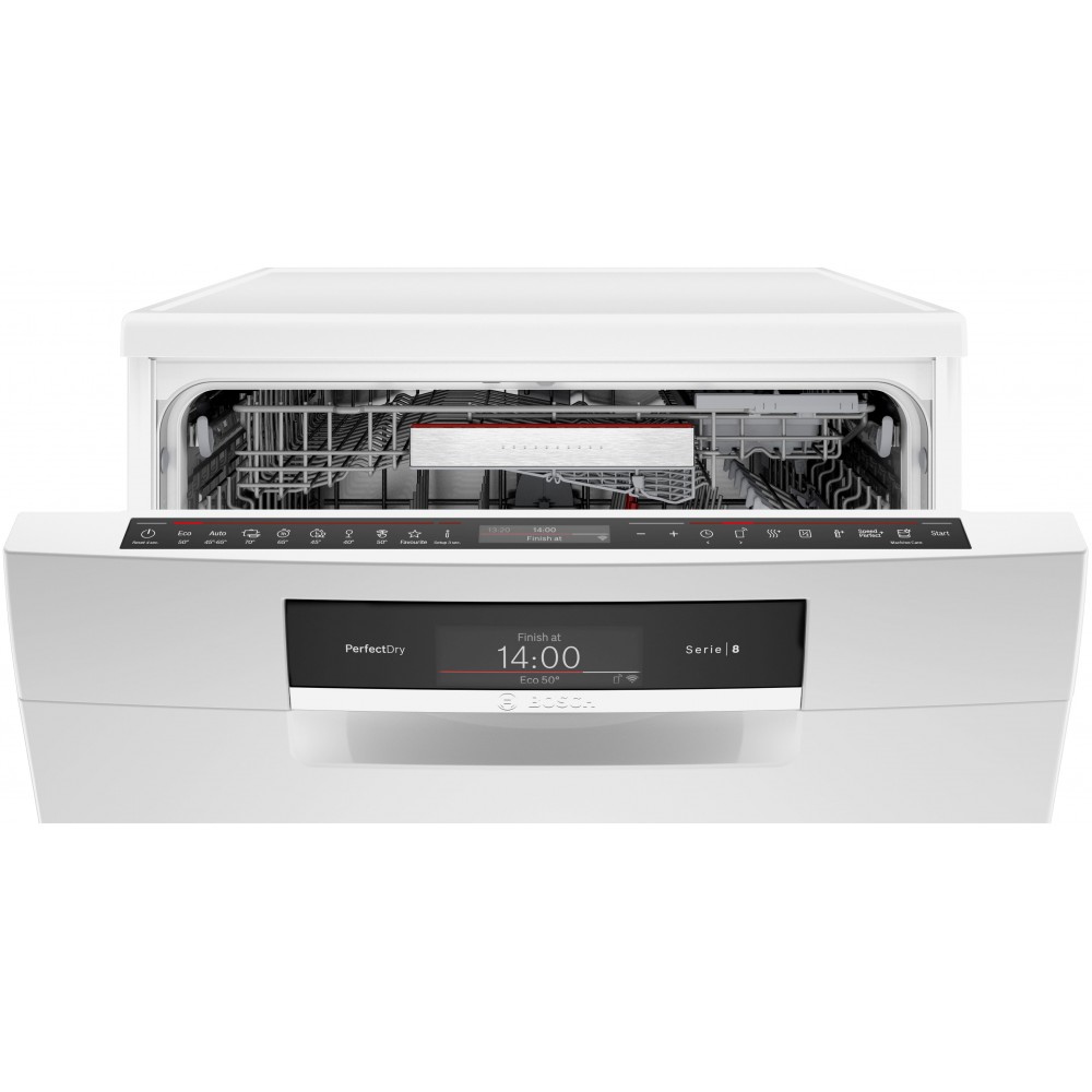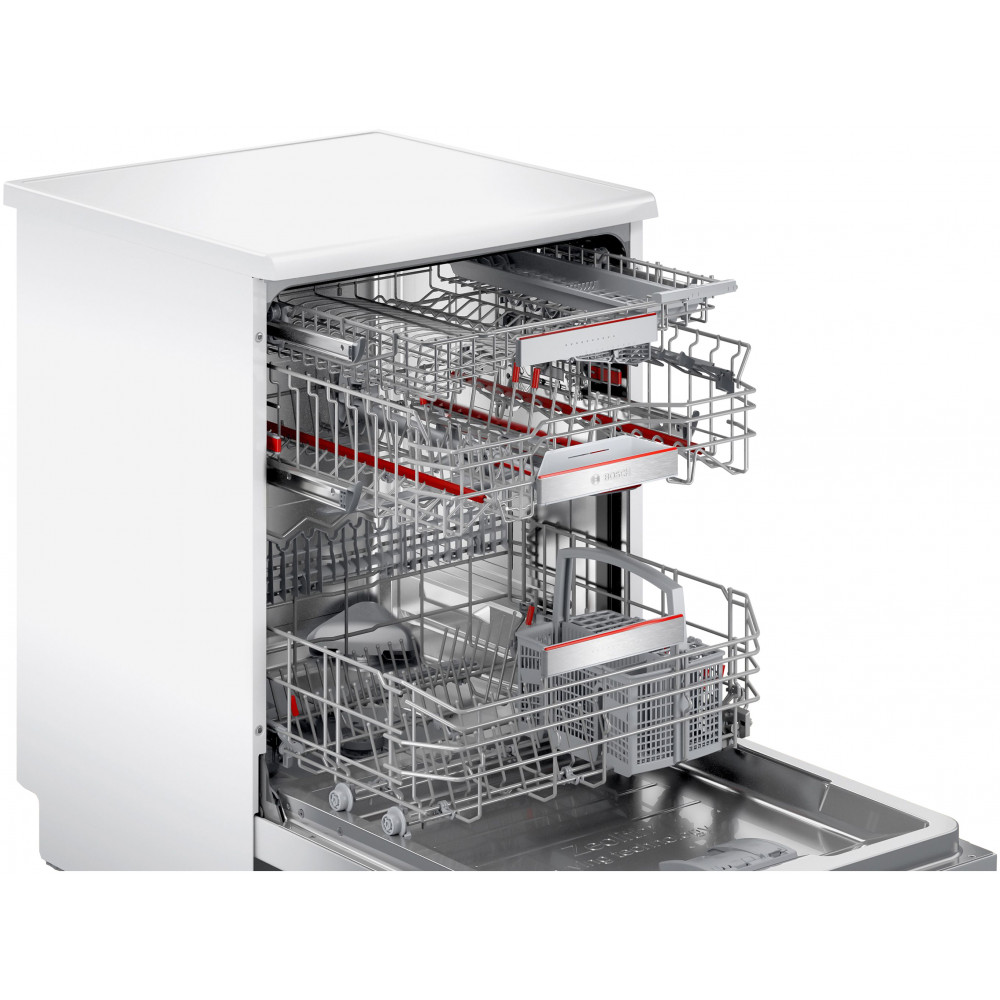 - قابلیت شروع شستشو با تاخیر از 1 تا 24 ساعت دارای مبدل حرارتی (Heat Exchanger) برای خشک کردن ظروف برنامه شستشوی Silence برای کارکرد با صدای کم (در حدود 40 دسی بل) تکنولوژی Detergent Automation برای صرفه جویی و تنظیم خودکار میزان استفاده از مواد شوینده سیستم Anti-Slip Protection برای جلوگیری از سر خوردن ظروف در سبد طبقه دوم هنگام شستوشو دارای موتور BLDC بدون برس با طول عمر بالا، صرفه جویی در مصرف انرژی و کاهش سطح سر و صدا پشتیبانی از برنامه Home Connect برای کنترل و مدیریت ماشین ظرفشویی از طریق موبایل دارای سیستم تمیز کردن خودکار با فیلتر 3 مرحله ای (Self-cleaning Filter System) محفظه داخلی ماشین ظرفشویی از جنس فولاد ضد زنگ (Stainless Steel) قابلیت Half Load برای شستشوی ظروف با نصف ظرفیت تکنولوژی Zeolith Drying برای خشک کردن بهتر و سریع تر ظروف و صرفه جویی در انرژی محفظه داخلی ماشین ظرفشویی از جنس فولاد ضد زنگ و تضمین کیفیت آن تا 10 سال توسط بوش دارای سنسور تشخیص میزان کثیفی آب و ظروف (AquaSensor) قابلیت ExtraDry برای خشک کردن بهتر ظروف قابلیت برداشتن قسمت بالایی ماشین ظرفشویی (Removable Top (Removable Top Cover)) دارای طبقه یا سبد بالا (Extra Space 3rd Basket) مخصوص قرارگیری قاشق، چنگال و ظروف کوچک دارای لوله ورودی آب به طول 165 سانتی متر تکنولوژی Detergent Detection برای صرفه جویی و تنظیم خودکار میزان استفاده از مواد شوینده شستشوی سریع (Express Cycle) در 38 دقیقه دارای Wi-Fi برای اتصال به شبکه و اینترنت تکنولوژی ActiveWater برای شستشوی بهتر و صرفه جویی در مصرف آب و انرژی قابلیت emotionLight برای روشنایی محفظه داخلی ماشین ظرفشویی قابلیت Remote Start برای شروع برنامه شستشو ماشین ظرفشویی از راه دور به کمک موبایل با برنامه Home Connect قابلیت HygienePlus برای شستشوی بهداشتی و ضدعفونی کردن ظروف به کمک آب با دمای بالا دارای موتور EcoSilence Drive با صدای کم، راندمان و طول عمر بالا و صرفه جویی در مصرف انرژی تکنولوژی Precise Glass Protection برای تنظیم خودکار سختی آب و جلوگیری از آسیب رسیدن به ظروف شیشه ای و ظریف سیستم DosageAssist برای ارائه شستشوی بهتر با پخش یکنواخت مواد شوینده در داخل ماشین ظرفشویی دارای سبد کوچک Vario Basket یا Cutlery Basket مخصوص کارد، قاشق و چنگال دارای نگهدارنده مخصوص لیوان های پایه دار (Stemware Holder) سیستم AquaStop برای جلوگیری از نشت آب با گارانتی مادام العمر توسط بوش دارای طبقات یا سبد های قابل تنظیم با سیستم Max Flex Pro دارای لوله تخلیه آب به طول 190 سانتی متر دارای چرخه Intensive برای شستشوی ظروف بسیار کثیف فناوری Speed Perfect Plus با توانایی شستشوی سریع ظروف سیستم RackMatic 2-stage برای تنظیم ارتفاع طبقه یا سبد در 2 سطح برنامه شستشوی Machine Care برای شستشو و تمیز کردن خودکار داخل ماشین ظرفشویی پشتیبانی از اینترنت اشیا (IoT) برای مدیریت و کنترل ماشین ظرفشویی از راه دور