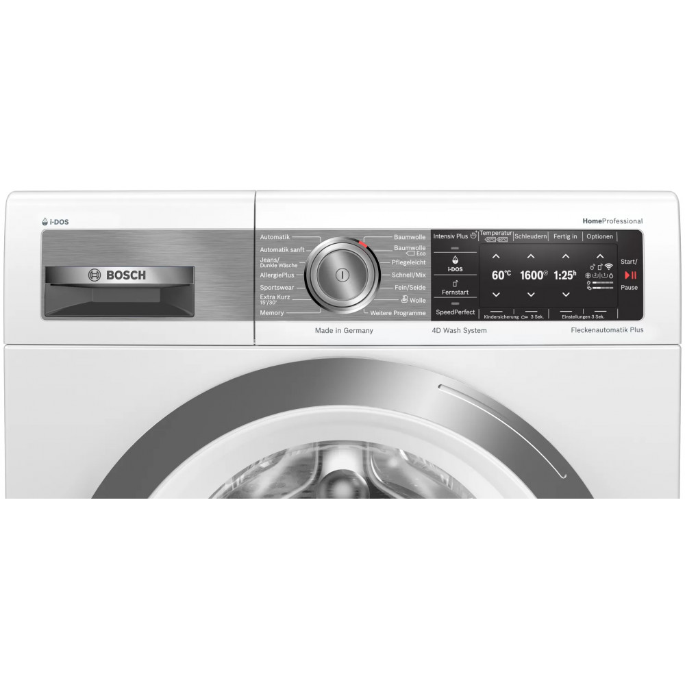 - قابلیت Intensive Plus برای شستشوی لباس های معمولی و بسیار کثیف قابلیت Rinse Hold برای توقف برنامه شستشوی فعلی و تغییر روند آن با انتخاب گزینه ها یا برنامه های متفاوت قابلیت SpeedPerfect (Speed Perfect) برای کاهش زمان برخی از برنامه های شستشو حداکثر تا 65% قابلیت i-DOS برای فعال یا غیر فعال کردن سیستم i-DOS به منظور استفاده از مقدار آب و مواد شوینده متناسب با میزان کثیفی و حجم لباس ها قابلیت Remote Start برای شروع برنامه شستشو از راه دور به کمک موبایل با برنامه Home Connect قابلیت Temperature برای تنظیم دمای آب برنامه شستشو به صورت دستی Options قابلیت وای فای (Wi-Fi) برای اتصال به شبکه و اینترنت برنامه Soaking برای شستشوی لباسهای بسیار کثیف و لکهدار قابلیت Stains برای انتخاب نوع لکه و از بین بردن آن هنگام شستشوی لباس ها قابلیت Extra Rinse برای اضافه کردن مرحله آبکشی به برنامه شستشو قابلیت Reduce Spin برای تنظیم سرعت چرخش دیگ به صورت دستی قابلیت Settings برای انجام تنظیمات قابلیت Child Lock برای قفل کردن پنل کنترلی و برنامه های ماشین لباسشویی قابلیت Reload برای اضافه کردن لباس حتی بعد از شروع شستشو قابلیت Easy Iron (Easy-iron) جهت کاهش چین و چروک لباس ها قابلیت Ready in برای شروع شستشو با تاخیر و تنظیم زمان پایان شستشو از 1 تا 24 ساعت