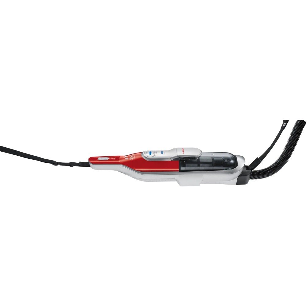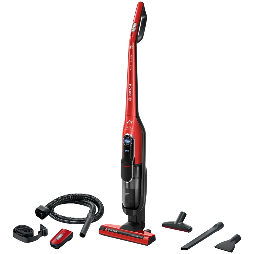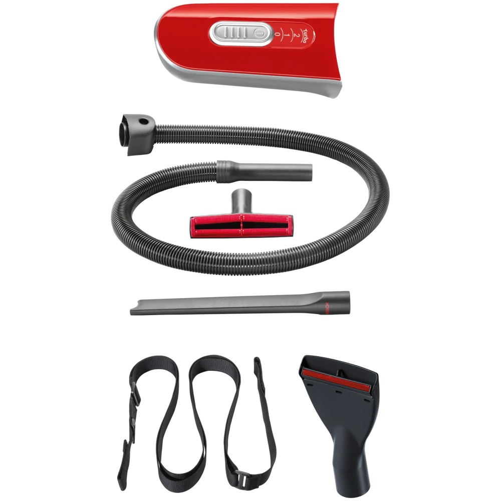 جارو شارژی بوش BCH86PET1 رنگ قرمز، یکی از جاروبرقی های ایستاده و قابل حمل بوش است که در سال 2020 معرفی شد. این محصول ممکن است در بازار با عنوان جارو شارژی بوش 86PET1 یا BCH86 و یا حتی 28Vmax نیز معرفی شود که البته مدل کامل و دقیق محصول فوق نیست. محصول فوق در واقع یکی از جارو شارژی های ایستاده و سری 6 بوش است که با مدل کامل جارو شارژی بوش BCH86PET1 Athlet ProAnimal معرفی شده و مونتاژ چین آن وارد کشور شده است. این محصول از جمله جارو شارژی های چند کاره و قابل حمل بوش می باشد که فاقد سیم است و شعاع عملکرد محدودی ندارد. بطور کلی این محصول برای نظافت خانه، خودرو یا ماشین، و حتی موی حیوانات بسیار مناسب است که در ادامه به توضیح کامل تر آن ها می پردازیم. جارو شارژی ایستاده Bosch BCH86PET1 به موتور قدرتمند بوش (HiSpin) مجهز است و با وجود کوچک بودن، قدرت مکش بسیار خوبی ارائه می دهد. این جارو شارژی به تکنولوژی SensorBagless مجهز است که به کمک سیستم SmartSensor Control، میزان جریان هوای ورودی را به صورت لحظه ای بررسی می کند تا مطمئن شود همیشه از حداکثر قدرت مکش جارو شارژی استفاده می کنید. محصول فوق به لطف سیستم SmartSensor Control حتی می تواند میزان کثیفی فیلتر ها را تشخیص داده و توسط چراغ ال ای دی که روی بدنه قرار دارد به شما اطلاع دهد تا اقدام به نظافت فیلتر ها نمایید. همانطور که گفته شد این محصول به جارو شارژی بوش 28Vmax نیز معروف است که در واقع نشان دهنده حداکثر توان 28 ولت می باشد. البته این عدد از طرف بوش اعلام شده ولی تنها جنبه تبلیغاتی دارد. محصول فوق در واقع به باتری لیتیوم یونی (Lithium-ion) 25.2 ولت و 2000 میلی آمپر یا 2 آمپر مجهز است و توان آن در حدود 50.4 وات می باشد. باتری این محصول در مدت 3 ساعت حدود 80 درصد شارژ می شود و در مدت 6 ساعت بطور کامل شارژ خواهد شد. با هر بار شارژ کامل محصول فوق، حداکثر 60 دقیقه می توانید از آن استفاده کنید که برای یک جارو شارژی فراتر از حد انتظار است! لازم به ذکر است که این جارو شارژی امکان تنظیم قدرت مکش در 3 سطح مختلف را دارد و عدد ذکر شده، برای زمانی که از کمترین قدرت جارو شارژی استفاده می کنید معتبر است. این محصول دارای مخزن با ظرفیت 0.9 لیتر است و یکی از جارو شارژی های مخزن دار بوش به حساب می آید. مخزن جارو شارژی 0.9 لیتری بوش BCH86PET1 به راحتی جدا شده و قابل تخلیه و نظافت است. این جارو شارژی برای جمع آوری زباله های خشک طراحی شده و نمی توانید از آن برای جمع آوری مایعات استفاده کنید. پس اگر این موضوع برای شما اهمیت دارد، باید به سراغ محصولات دیگر بروید. همانطور که مشخص است این محصول ظرفیت کمی دارد و برای نظافت یکباره خانه یا مکان های بزرگ مناسب نیست. اما بوش این جارو شارژی را به گونه ای طراحی کرده که تخلیه و نظافت مخزن آن به آسانی انجام می شود. همچنین همانطور که گفته شد محصول فوق دارای باتری قدرتمند است که امکان استفاده طولانی مدت از جارو شارژی را فراهم ساخته و به سرعت شارژ می شود. با وجود این ویژگی ها، می توانید به راحتی چندین بار مخزن این جارو شارژی پرتابل را تخلیه کرده و کل منزل را نظافت کنید. این محصول دارای فیلتر های مخصوص در داخل مخزن است که از وجود ذرات گرد و خاک به داخل موتور جلوگیری می کنند. این فیلتر ها قابلیت شستشو دارند اما جارو شارژی مذکور به سیستم RotationClean مجهز است و شما تا مدت ها نیاز به شستن این فیلتر ها نخواهید داشت. با وجود این سیستم، تنها کافی است اهرم چرخشی که داخل مخزن وجود دارد را بچرخانید تا خاک و غبار موجود روی فیلتر ها جدا شده و داخل مخزن بریزد. به گفته بوش، محصول فوق دارای فیلتر بهداشتی در قسمت هوای خروجی از موتور است که می تواند تا حدودی مانع خارج شدن گرد و غبار از جارو شارژی شود. جارو شارژی قابل حمل یا پرتابل بوش BCH86PET1 از خانواده جارو شارژی های Athlet بوش است و علاوه بر دسته بلند، دارای یک دسته کوچک و همچنین بند دوشی (Shoulder Strap) و لوله خرطومی است. این لوازم باعث می شوند محصول فوق به راحتی قابل حمل و نقل باشد تا بتوانید بجز داخل خانه، از آن برای نظافت 