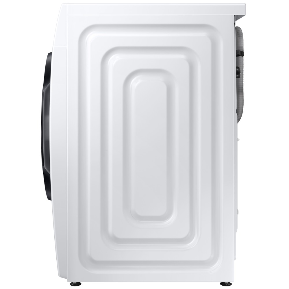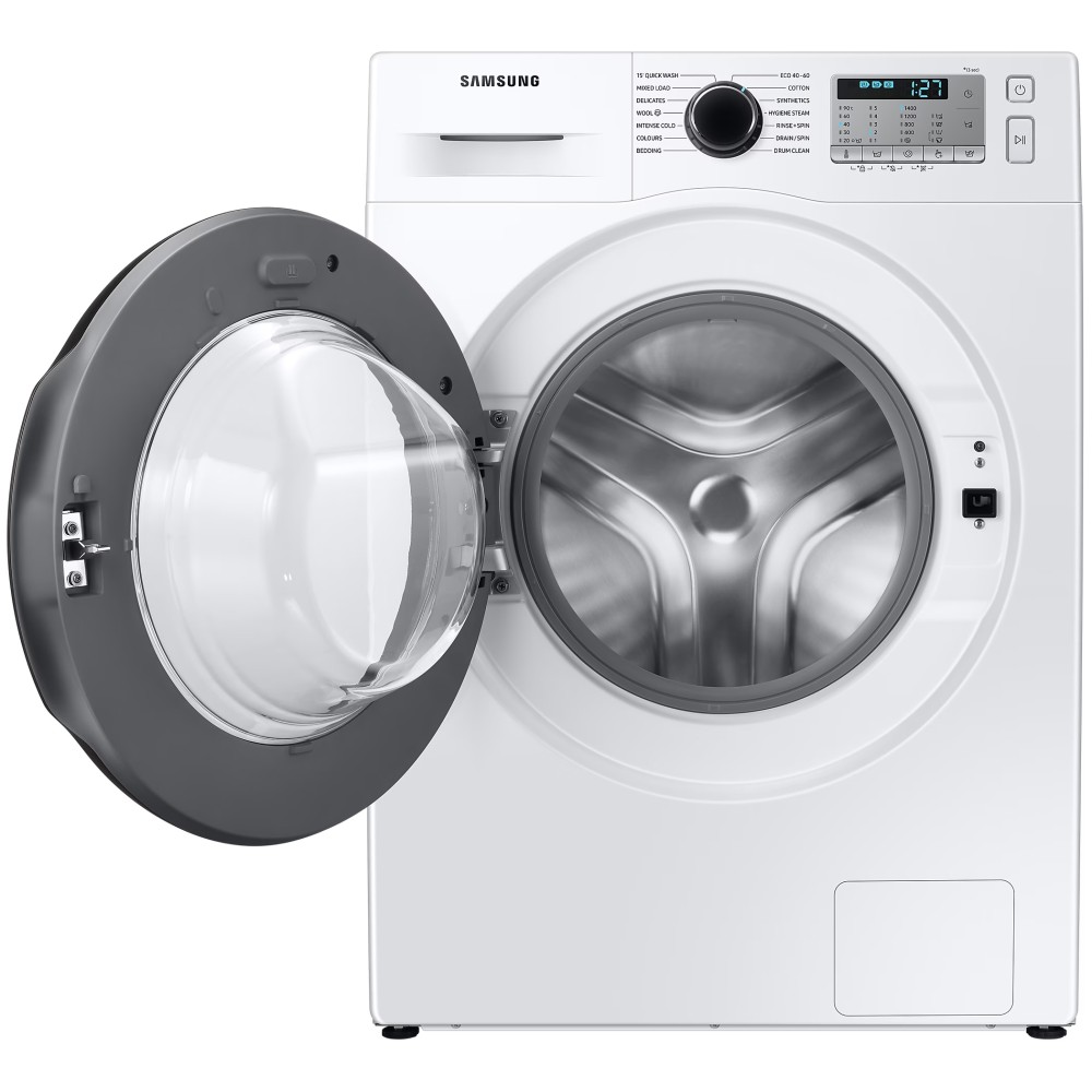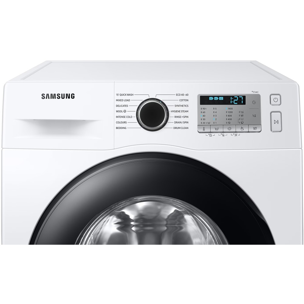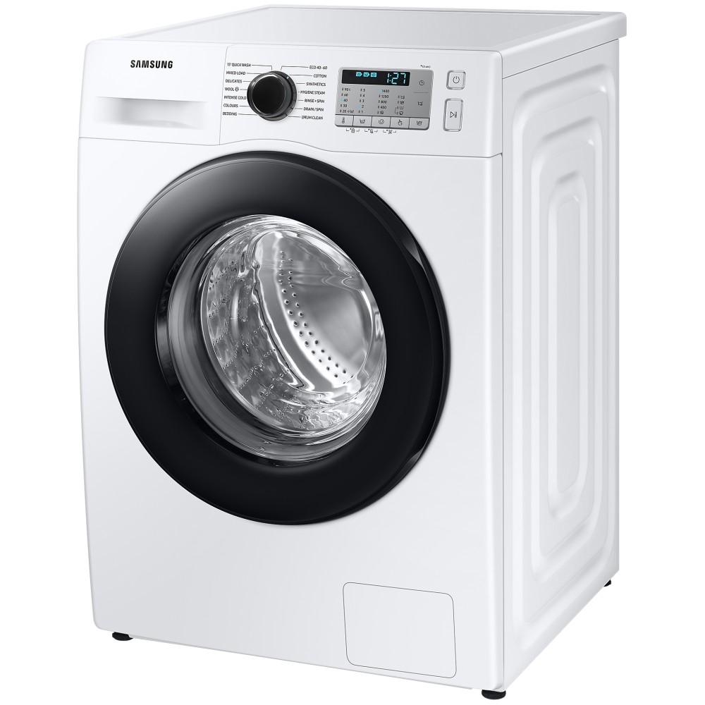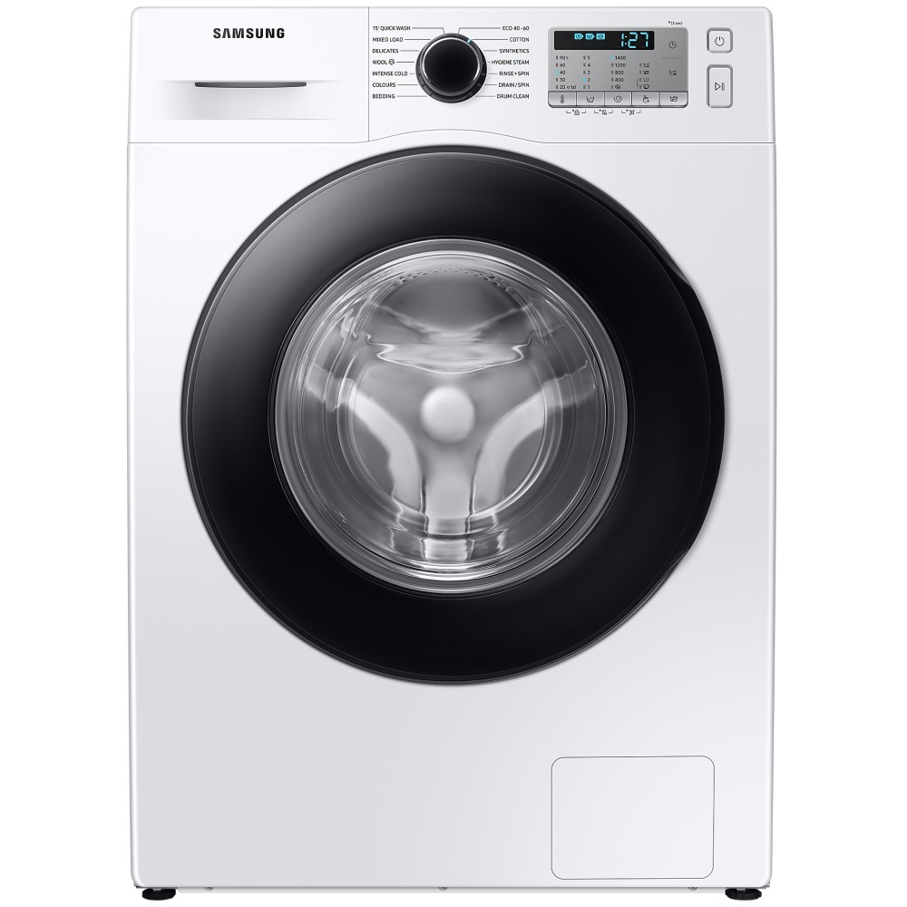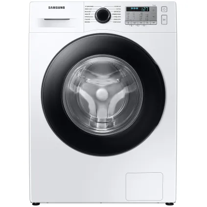 ماشین لباسشویی سامسونگ WW80TA046AH رنگ سفید یکی دیگر از ماشین لباسشویی های 2020 سامسونگ به شمار می آید. بعضی از سایت ها محصول فوق را با مدل ماشین لباسشویی سامسونگ WW80T یا WW80 نیز به مشتری معرفی می نمایند؛ در واقع حرف T نماد سال تولید لباسشویی یعنی 2020 و عدد 80 بیانگر 8 کیلویی بودن محصول می باشد. محصول فوق به جز تفاوت در برخی برنامه های شستشو و طراحی پنل تفاوتی با ماشین لباسشویی سامسونگ WW80TA046AH ندارد و مشابه یکدیگر می باشند. محصول فوق به جز تفاوت در برخی برنامه های شستشو و طراحی پنل تفاوتی با ماشین لباسشویی سامسونگ WW80TA046AE و ماشین لباسشویی سامسونگ WW80TA046AE1 ندارد و مشابه یکدیگر می باشند. ماشین لباسشویی 8 کیلویی سامسونگ WW80TA046AH انتخابی مناسب برای خانواده های با جمعیت متوسط به شمار می آید. موتور دیجیتال اینورتر (Digital Inverter) این محصول نسبت به موتور های معمولی و قدیمی از لرزش و سر و صدای کمتری برخوردار می باشد و مصرف انرژی کمتری نیز دارد. این موتور بدون برس است و اصطلاحا به آن براشلس (Brushless) گفته می شود و به صورت مغناطیسی کار می کند. این موتور به وسیله تسمه به دیگ شستشو متصل می شود و آن را می چرخاند. بنابراین این ماشین لباسشویی در واقع تسمه ای است. طول عمر موتور Digital Inverter این لباسشویی بالا بوده و سامسونگ عملکرد مفید این این موتور را تا 20 سال نیز ضمانت نموده است. ماشین لباسشویی 1400 دور سامسونگ WW80TA046AH خشک کن ندارد؛ به عبارت دیگر این محصول نمی تواند لباس ها را 100% خشک و قابل پوشیدن به شما تحویل دهد. اما به لطف سرعت چرخش نسبتا سریعی که دارد لباس ها را به خوبی آبگیری کرده و با اندکی رطوبت به شما تحویل می دهد. سرعت چرخش دیگ در برنامه های مختلف شستشو متفاوت از یکدیگر است اما حداکثر سرعت چرخش دیگ در این ماشین لباسشویی 1400 دور در دقیقه می باشد. ماشین لباسشویی سامسونگ WW80T دارای 14 برنامه شستشو برای انواع البسه است و امکان دانلود برنامه شستشوی جدید برای آن وجود ندارد. برای شستشوی لباس های روزمره خود می توانید برنامه 15' Quick Wash را اجرا نمایید تا در عرض 15 دقیقه شستشوی آن ها انجام شود. محصول مذکور مجهز به تکنولوژی Ecobubble است که با تبدیل مواد شوینده به حباب لباس ها را به خوبی شستشو می نماید؛ برای استفاده از تکنولوژی فوق لازم است برنامه شستشو را روی Intense Cold تنظیم نمایید. لباسشویی فوق دارای برنامه مخصوص شستشوی دیگ می باشد. بعد از 40 بار شستشو آلارمی روی پنل ال ای دی محصول نمایان می شود که بیانگر زمان فرا رسیدن شستشوی دیگ است. پس از دیدن آلارم مذکور لازم است برنامه Drum Clean را اجرا نمایید تا شستشوی دیگ انجام شود. اگر برنامه Drum Clean را اجرا نکنید آلارم مذکور تا 6 شستشو جهت اطلاع روی پنل باقی مانده و پس از آن خاموش می شود. این لباسشویی قابلیت بخارشوی دارد. تکنولوژی بخارشوی این محصول از نوع Hygiene Steam است، برای استفاده از این تکنولوژی باید برنامه شستشوی Hygiene Steam را اجرا کنید تا لباس ها به خوبی ضد عفونی شده و ذرات آلرژی زا و باکتری ها تا 99.9% از تار و پود پارچه حذف شود. سامسونگ در کنار برنامه های متنوع شستشو، محصول فوق را به قابلیت هایی مجهز کرده است گه از طریق پنل ال ای دی قابل تنظیم است و در ادامه به ارائه توضیح در خصوص آن ها خواهیم پرداخت. شما می توانید در برخی برنامه های شستشو قابلیت Bubble Soak را فعال کنید تا با غوطه ور شدن لباس ها در حباب فراوان شستشوی آن ها به طرز موثر تری انجام شود. قابلیت Intensive نیز برای شستشوی لباس های بسیار کثیف به کار می رود، اما به یاد داشته باشید با فعال کردن این قابلیت مدت زمان شستشو افزایش می یابد. قابلیت Delay End برای شما این امکان را فراهم می سازد تا زمان شروع و پایان شستشو را با تاخیر تعیین و تنظیم نمایید. اگر قابلیت Easy Iron را در برخی برنامه های شستشو فعال کنید اتوکشی آن ها پس از اتمام فرآیند شستشو آسان تر انجام خواهد شد. در لباسشویی فوق شما می توانید قابلیت های Temp ،Spin و Rinse را به صورت دستی تنظیم نمایید. ماشین لباسشویی مورد بررسی هوشمند نیست و WiFi 