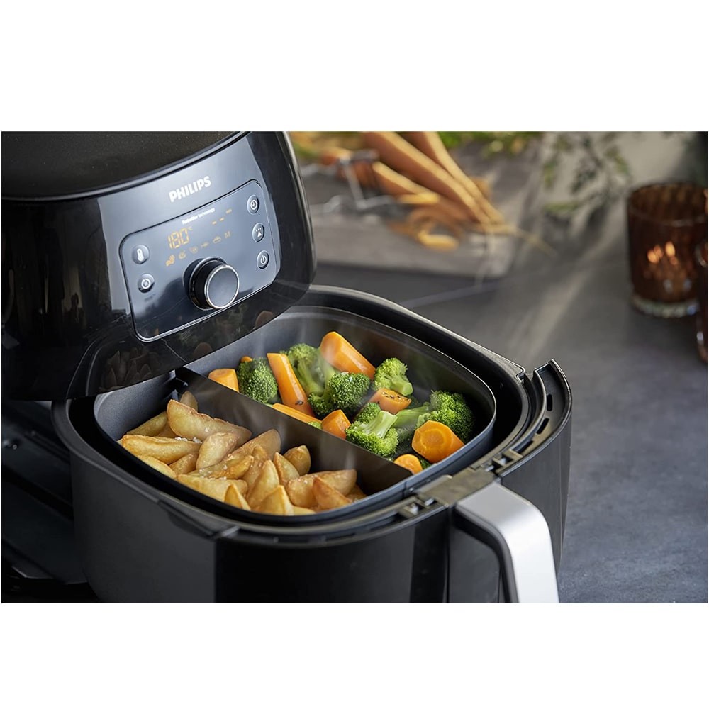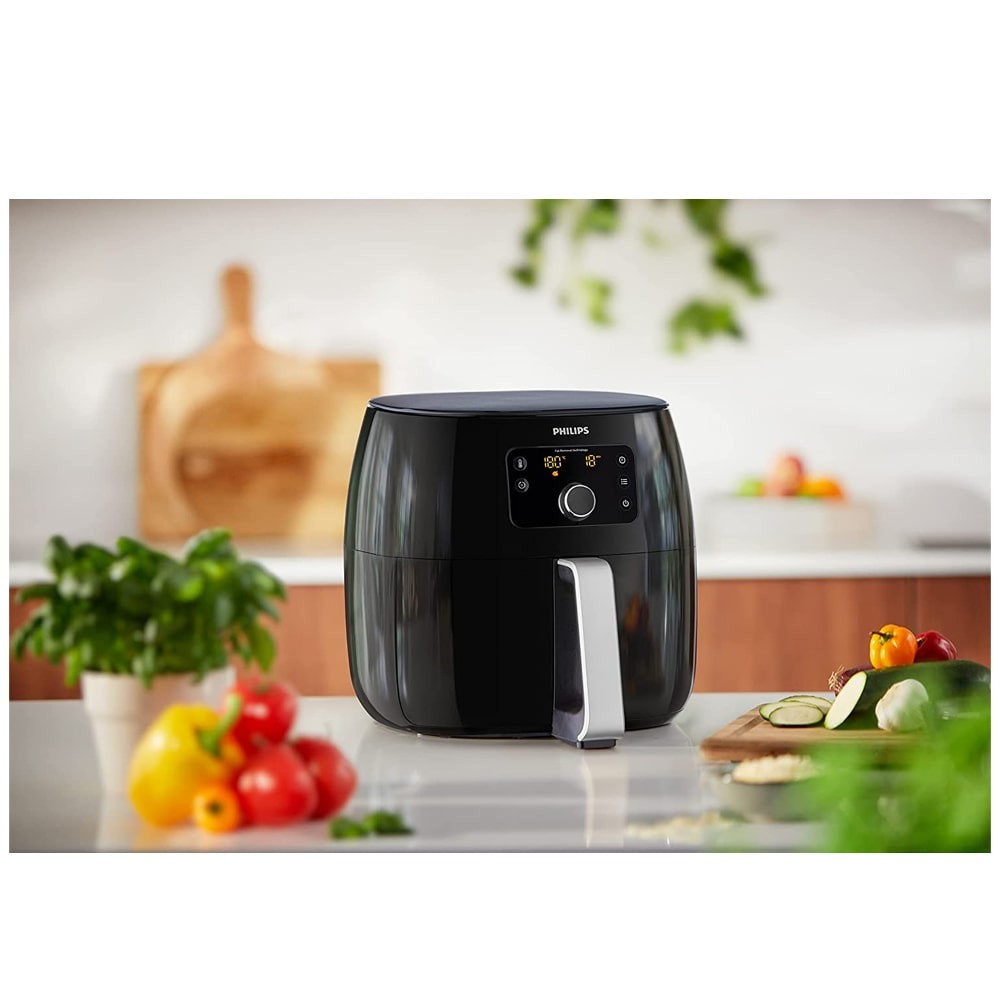 سرخ کن فیلیپس HD9650 دستگاهی مناسب برای کسانی که رژیم غذایی میگیرند و یا دوست دارند از روغن خیلی کمی در غذاهایشان استفاده کنند. یعنی اینکه شما میتوانید همراه با این سرخ کن با کمترین میزان مصرف روغن غذاهای خیلی خوشمزهای را درست کنید و لذت تمام را از آن ببرید. این سرخ کن از هوای گرم برای پختن غذای مورد علاقه شما با روغن کم یا بدون روغن استفاده میکند بنابراین میتوانید مواد غذایی را تا 90٪ با چربی کمتری سرخ کنید. این مدل سرخ کن فیلیپس از نسل سرخ کنهای XXL این کمپانی به شمار میآید که برای تهیه یک وعده غذایی خانواده 6 نفری کاملا مناسب میباشد و میتواند غذاهای سالم و خوشمزهای را به شما ارائه دهد. سرخ کن مورد بررسی دارای یک سبد با ظرفیت 1.4 کیلوگرم و حجم مخزن 7.3 لیتری میباشد که به راحتی میتوانید حجم ایدهآلی از مواد غذایی را در داخل آن سرخ کنید. سبد این سرخ کن 2200 واتی فیلیپس از نوع QuickClean Airfryer است که قابل شستشو در ماشین ظرفشویی میباشد. با توجه به اینکه این سبد توری دارای روکش نچسب است بنابراین خیلی راحت و سریع میتوانید آن را تمیز کنید. یک صفحه نمایش دیجیتال بر روی بدنه دستگاه قابل مشاهده میباشد که دارای 5 برنامه پخت از پیش تنظیم شده است بنابراین برای پخت سیبزمینیها، گوشت، ماهی، مرغ و غیره تنها گزینه مورد نظر را لمس کنید تا ماده غذایی مورد نظر با دمای از پیش تعریف شده و زمان تعیین شده پخته شود. ضمن اینکه میتوانید درجه حرارت و زمان را هم به صورت دستی تنظیم کنید. محدوده تنظیم درجه حرارت این سرخ کن بین 40 تا 200 درجه و تنظیم زمان پخت دستگاه تا 60 دقیقه میباشد.