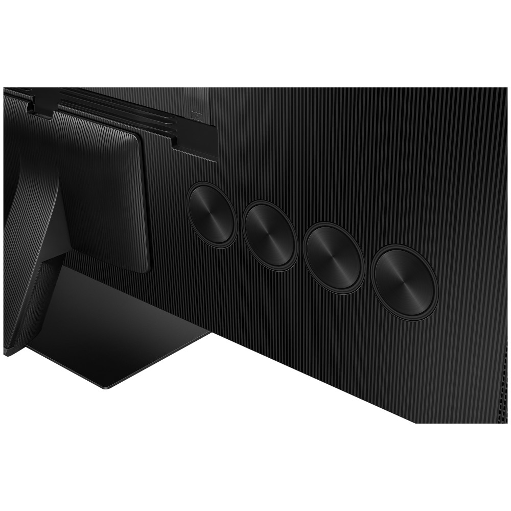 تلویزیون سامسونگ 65QN95C دارای سیستم صوتی 4.2.2 کاناله می باشد. این سیستم صوتی دارای 8 بلندگو می باشد که شامل 4 بلندگوی 5 واتی، 2 بلندگوی ووفر 10 واتی و 2 بلندگوی (Up Firing) 15 واتی است و مجموعا صدای خروجی را با توان صوتی 70 وات به گوش کاربر می رساند. به گفته سامسونگ بلندگوهای این تلویزیون صدا را به سمت پایین (Down Firing)، بالا (Up Firing)، جلو (Front Firing) و طرفین (Side Firing) شلیک می کنند. بلندگو های این تلویزیون در پشت آن و به شکل دایره ای شکل در سمت راست و چپ پایه تلویزیون قرار دارند. در سایز 65 اینچ این مدل هر طرف 4 بلندگوی دایره ای شکل وجود دارد. سامسونگ برای بهبود و تقویت صدای خروجی این تلویزیون را به تکنولوژی صوتی Dolby MS12 5.1ch مجهز می باشد که شامل تکنولوژی صوتی Dolby Digital، Dolby Digital Plus، Dolby Audio و Dolby AC4 است. تلویزیون پیش روی شما از تکنولوژی دالبی اتموس پشتیبانی می کند. با وجود 2 بلندگوی بالایی و تکنولوژی True Dolby Atmos شما می توانید شاهد صدای دالبی اتموس و کاملا سینمای، واقعی و فراگیر باشید. به لطف تکنولوژی Object Tracking Sound+ در این تلویزیون صداها درست از جایی از تصویر که نمایش داده می شود پخش خواهد شد. تلویزیون پیش روی شما دارای سنسور صدا و تکنولوژی Adaptive Sound+ است. تکنولوژی فوق به کمک سنسور، صدای تلویزیون را با توجه به محتوای در حال پخش و ابعاد محیط به صورت هوشمند بهبود می بخشد و تحت هر شرایطی بهترین کیفیت تصویر را در اختیار شما قرار می دهد. همچنین با وجود تکنولوژی Active Voice Amplifier و به کمک سنسور، سر و صدای محیط تشخیص داده شده و باعث می شود تحت شرایط مختلف محیطی صدای دیالوگ ها را واضح بشنوید. به لطف تکنولوژی Q-Symphony 3.0 در این محصول، شما می توانید تلویزیون را به صورت سیمی یا بی سیم و از طریق شبکه به ساندبار سازگار سامسونگ متصل کرده و صدایی همزمان و هماهنگ را از بلندگو های ساندبار و تلویزیون بشنوید. در نسخه جدید این تکنولوژی صدای خروجی به صورت تفکیک شده تر به گوش شما می رسد. با وجود قابلیت Multiroom Link در تلویزیون فوق شما می توانید صدای تلویزیون را به وسیله شبکه به ساندبار، سینمای خانگی و سیستم صوتی مجزا و سازگار متصل کرده و شاهد صدای قدرتمند تری باشید. این محصول دارای قابلیت Dual Audio Support (Bluetooth) بوده و شما می توانید تلویزیون خود را به صورت بی سیم و بلوتوثی همزمان به 2 دستگاه بلوتوثی مجزا مانند هدفون، ساندبار یا بلندگو متصل کرده و صدای تلویزیون را از دو دستگاه مختلف به صورت همزمان بشنوید. تلویزیون پیش روی شما مجهز به جدید ترین قابلیت تلویزیون های سامسونگ یعنی قابلیت Buds Auto Switch می باشد. به لطف این قابلیت و داشتن یک هندزفری بلوتوثی سامسونگ Galaxy Buds که مجهز به قابلیت Auto Switch است، هندزفری به صورت هوشمندانه و خودکار بین دستگاه های مختلف سوییچ می شود. البته موبایل هوشمند شما نیز باید از این قابلیت پشتیبانی کند.