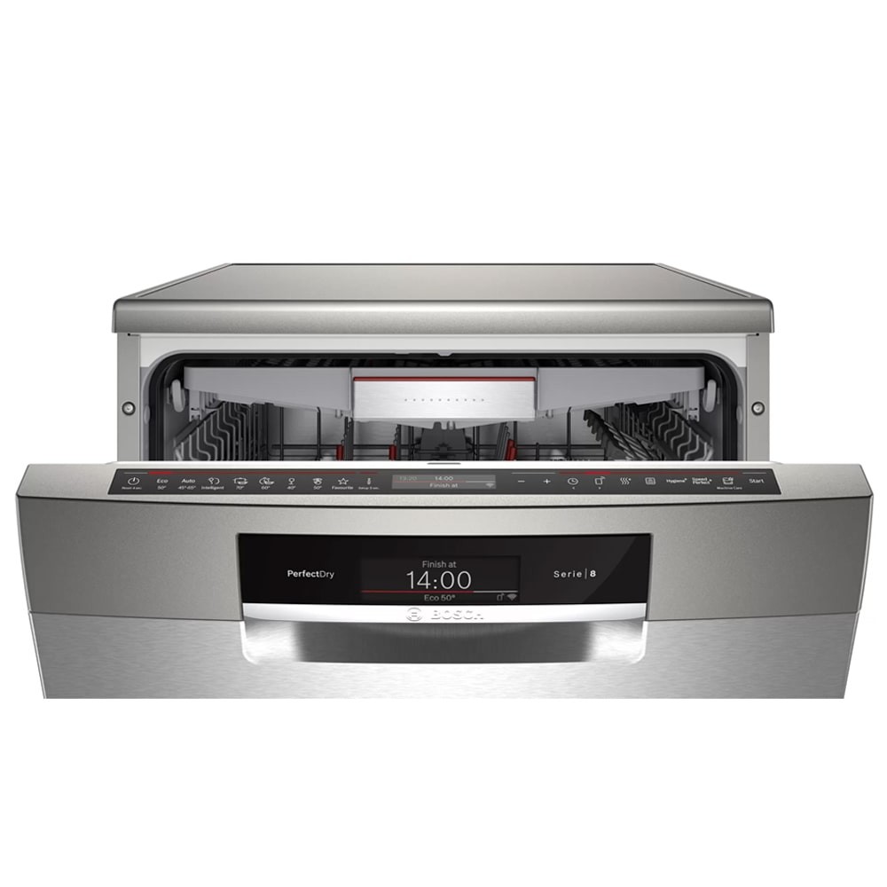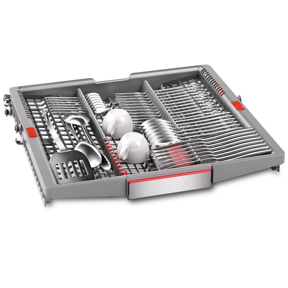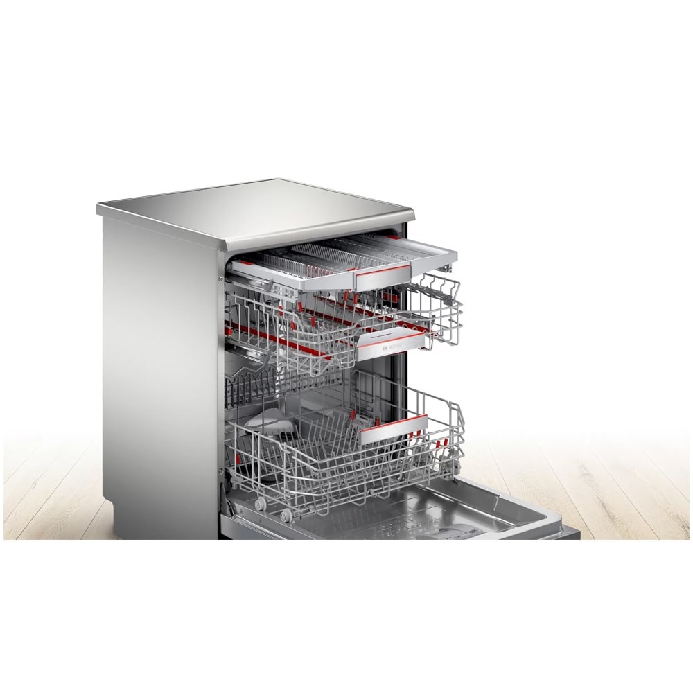 - دارای موتور EcoSilence Drive با صدای کم، راندمان و طول عمر بالا و صرفه جویی در مصرف انرژی دارای مبدل حرارتی (Heat Exchanger) برای خشک کردن ظروف قابلیت Remote Start برای شروع برنامه شستشو ماشین ظرفشویی از راه دور به کمک موبایل با برنامه Home Connect برنامه شستشوی Silence برای کارکرد با صدای کم (در حدود 44 دسی بل) جنس بدنه فولاد ضد زنگ (Stainless Steel) با قابلیت Anti-Fingerprint برای جلوگیری از ماندگاری اثر انگشت روی بدنه دارای طبقات یا سبد های قابل تنظیم با سیستم Max Flex Pro قابلیت HygienePlus برای شستشوی بهداشتی و ضدعفونی کردن ظروف به کمک آب با دمای بالا دارای نگهدارنده مخصوص لیوان های پایه دار (Stemware Holder) تمیزکاری کامل برای ظروف بسیار کثیف در طبقه یا سبد بالایی (Extra Clean Zone) محفظه داخلی ماشین ظرفشویی از جنس فولاد ضد زنگ و تضمین کیفیت آن تا 10 سال توسط بوش تکنولوژی Detergent Automation برای صرفه جویی و تنظیم خودکار میزان استفاده از مواد شوینده سیستم Anti-Slip Protection برای جلوگیری از سر خوردن ظروف در سبد طبقه دوم هنگام شستوشو قابلیت برداشتن قسمت بالایی ماشین ظرفشویی (Removable Top (Removable Top Cover)) برنامه شستشوی Machine Care برای شستشو و تمیز کردن خودکار داخل ماشین ظرفشویی تکنولوژی Detergent Detection برای صرفه جویی و تنظیم خودکار میزان استفاده از مواد شوینده طراحی کاملا مینیمال برای هماهنگی هر چه بهتر با آشپزخانه شما سیستم Aqua-Stop برای جلوگیری از نشت آب تکنولوژی Glass Protection برای محافظت از ظروف شیشه ای و ظریف هنگام شستشو پشتیبانی از برنامه Home Connect برای کنترل و مدیریت ماشین ظرفشویی از طریق موبایل پشتیبانی از اینترنت اشیا (IoT) برای مدیریت و کنترل ماشین ظرفشویی از راه دور تکنولوژی Zeolith Drying برای خشک کردن بهتر و سریع تر ظروف و صرفه جویی در انرژی تکنولوژی Precise Glass Protection برای تنظیم خودکار سختی آب و جلوگیری از آسیب رسیدن به ظروف شیشه ای و ظریف دارای سیستم تمیز کردن خودکار با فیلتر 3 مرحله ای (Self-cleaning Filter System) دارای قابلیت تاشو (Foldable Tines) دندانه های سبد برای جایگیری ظروف بزرگ تر شستشوی سریع (Express Cycle) در 38 دقیقه شستشوی اقتصادی (Eco) در 235 دقیقه دارای سنسور تشخیص میزان کثیفی آب و ظروف (AquaSensor) دارای چرخه Intensive برای شستشوی ظروف بسیار کثیف فناوری Speed Perfect Plus با توانایی شستشوی سریع ظروف قابلیت emotionLight برای روشنایی محفظه داخلی ماشین ظرفشویی قابلیت ExtraDry برای خشک کردن بهتر ظروف دارای طبقه یا سبد بالا VarioDrawer یا Cutlery Drawer از نوع 3rd Rack 1.0 دارای Wi-Fi برای اتصال به شبکه و اینترنت