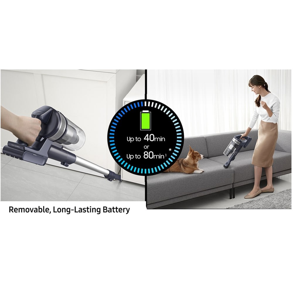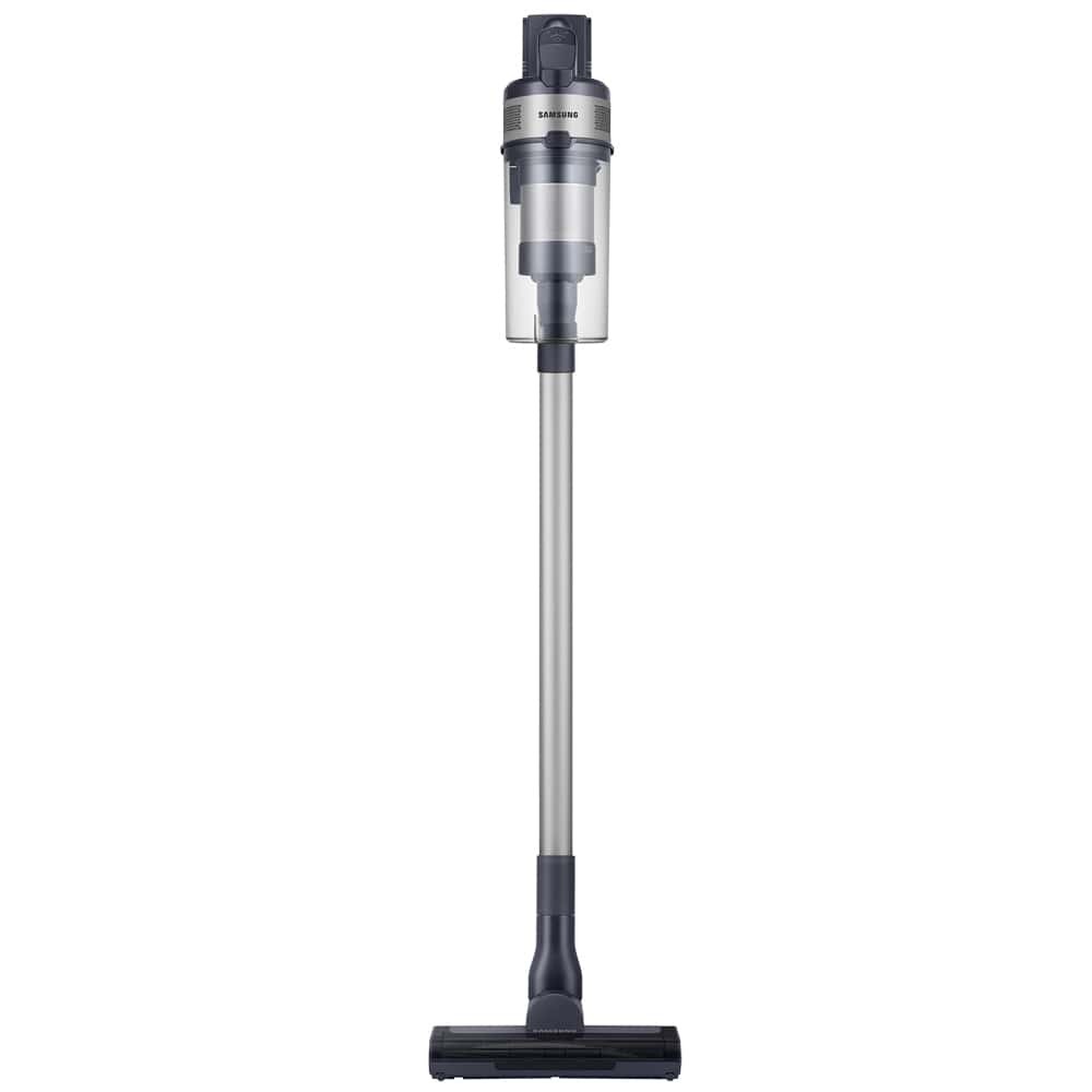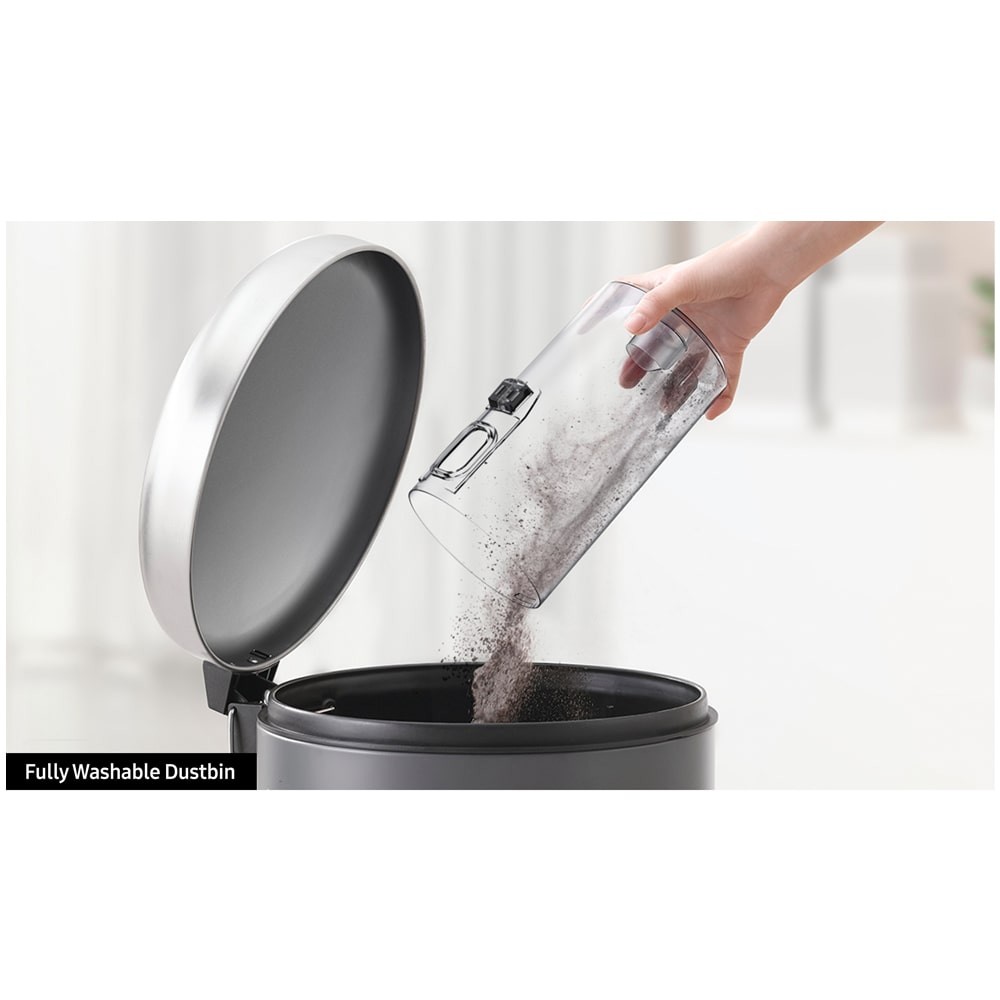 جارو شارژی سامسونگ VS15A6032R5 سبکترین جارو شارژی کمپانی کرهای سامسونگ در سال 2021 است که به شما کنترل بیشتری روی تمیز کردن میدهد. باید گفت که طراحی سبک وزن این جاروشارژی کنترل حداکثر و آسان را هنگام استفاده از جارو شارژی در اطراف خانه شما را تضمین میکند. این محصول ممکن است در بازار با عنوان جارو شارژی سامسونگ VS6700 یا Jet 60 نیز معرفی شود که البته مدل کامل و دقیق محصول فوق نیست. در حال حاضر مونتاژ ویتنام این جارو شارژی ایستاده سامسونگ در بازار ما موجود میباشد. طراحی بیسیم جاروشارژی jet 60 سامسونگ این اطمینان را به شما میدهد که نیازی به نگرانی در مورد افتادن کابل برق نداشته باشید، در حالی که ساختار سبک وزن آن به شما امکان میدهد آن را بردارید و با کمترین تلاش حمل کنید. در واقع این مدل جارو شارژی برای نظافت خانه، خودرو یا ماشین، و حتی موی حیوانات بسیار مناسب است و میتواند کارایی عالی را از خود به نمایش بگذارد. جارو شارژی Samsung Jet 60 برای نظافت کارگاهی طراحی نشده است. عملکرد رضایت بخشی را روی سطوح صاف مانند کف بتنی یا میز کار ارائه میدهد و روی فرشهای کم پرز عملکرد خوبی دارد، اما برای جارو کشیدن زبالههای معمولی کارگاه مانند برادههای چوبی یا فلزی مناسب نیست. همچنین قادر به مقابله با نشت مایعات نمیباشد. جارو شارژی ایستاده SAMSUNG VS15A6032R5 به موتور قدرتمند Digital Inverter مجهز است و با وجود کوچک بودن، قدرت مکش بسیار خوبی ارائه میدهد. حداکثر قدرت مکش این موتور 150 وات میباشد و سطح نویز ایجاد شده از این دستگاه در هنگام استفاده 86 دسیبل است.