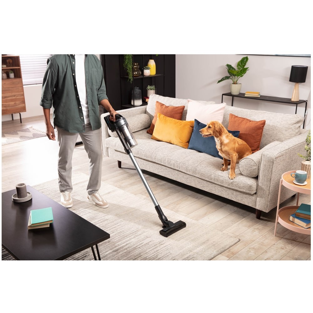 جارو شارژی سامسونگ VS15A6032R5 با چند ابزار و لوازم جانبی عرضه میشود. یک برس توربو مینیاتوری برای تمیز کردن سطوح پارچهای، یک ابزار شکاف برای چسباندن زبالهها در ترکها، و یک ابزار ترکیبی برس با موهای نرم و اثاثه یا لوازم داخلی برای تمیز کردن سطوح ظریف و مبلمان وجود دارد. این ابزارها و لوازمهای مختلف را میتوانید به راحتی جدا کرده و وصل کنید. استفاده از دکمههای «+» و «-» روی دسته به شما امکان میدهد بین سه حالت انرژی مختلف سوئیچ کنید: حالت «MIN» کم مصرف، حالت پیشفرض «MED» و حالت «MAX» پرمصرف. برخلاف سایر مدلهای سری جاروبرقیهای جت استیک سامسونگ، هیچ نمایشگری مینیاتوری برای نشان دادن حالت قدرت مکش فعلی وجود ندارد، بنابراین باید بر اساس صدایی که هنگام فشار دادن دکمههای کنترل پاور ایجاد میکند، قضاوت کنید که جارو شارژی در چه حالتی است. همچنین هیچ چراغ نشانگر باتری روی بدنه جارو شارژی وجود ندارد، اگرچه نشانگرهای شارژ قابل مشاهده روی خود باتری وجود دارد. این دستگاه با وزن 2.3 کیلوگرم بسیار سبک است. بدنه نیز باریک و جمع و جور میباشد که استفاده از آن را برای جمع کردن ذرات گرد و غبار آسان میکند. باید گفت که این جارو شارژی کمی از جلو سنگین است، اما دسته آن به خوبی در دست شما قرار میگیرد و احساس سفت و ارگونومیکی دارد. شارژ باتری جاروشارژی ذکر شده (از صفر تا 100 درصد) 3.5 ساعت طول میکشد، بنابراین مطمئن شوید که پس از استفاده دوباره آن را شارژ کنید.
