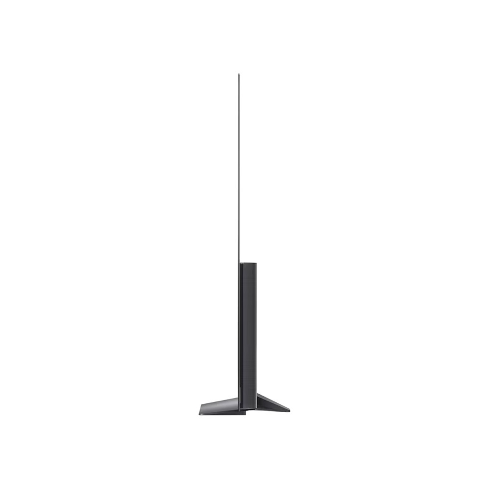 طراحی تلویزیون 65 اینچ ال جی CS مشابه مدل سال گذشته خود می باشد و از زبان طراحی 4 Sided Cinema Screen برخوردار است. به لطف این زبان طراحی، شاهد حاشیه های باریکی در چهار طرف صفحه نمایش آن هستیم که به شما امکان آن را می دهد تا محتوای در حال پخش را با تمرکز بیشتری مشاهده کرده و از تماشای تلویزیون لذت بیشتری ببرید. ال جی این تلویزیون را با ضخامت 4.69 سانتیمتر طراحی نموده است که برای یک تلویزیون OLED کاملا مناسب است. باریک بودن این تلویزیون به شما امکان آن را می دهد که آن را به راحتی بر روی دیوار نیز نصب کنید. تلویزیون پیش روی شما به صورت دو تکه طراحی شده است؛ قسمت بالای این محصول بسیار باریک است (حتی باریک تر از ضخامت موبایل) و ضخامت 4.69 سانتیمتری گفته شده، مربوط به قسمت پایینی آن می باشد که در واقع پورت های ورودی و خروجی و مادربورد در آن قرار گرفته اند. پایه این محصول به شکل خطی طراحی شده است و به کمک پیچ در قسمت میانی آن متصل می گردد. این پایه نسبت به مدل سال قبل، فضای کمتری را اشغال می کند و می توانید از میز کوچکتری برای قراردادن آن استفاده کنید. ال جی در جعبه این محصول یک گیره نگهدارنده قرار داده است که به کمک آن می توانید کابل های پشت تلویزیون را مدیریت و مرتب کنید. کابل برق این تلویزیون به بدنه آن متصل شده و قابلیت جداسازی ندارد.