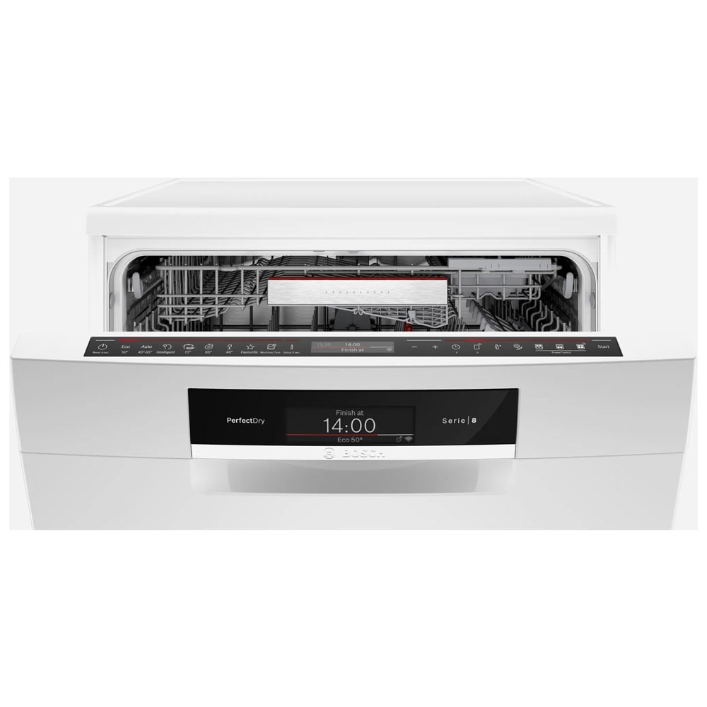 - دارای سبد کوچک Vario Basket یا Cutlery Basket مخصوص کارد، قاشق و چنگال تکنولوژی Zeolith Drying برای خشک کردن بهتر و سریع تر ظروف و صرفه جویی در انرژی تکنولوژی Precise Glass Protection برای تنظیم خودکار سختی آب و جلوگیری از آسیب رسیدن به ظروف شیشه ای و ظریف دارای Wi-Fi برای اتصال به شبکه و اینترنت سیستم AquaStop برای جلوگیری از نشت آب با گارانتی مادام العمر توسط بوش برنامه شستشوی Machine Care برای شستشو و تمیز کردن خودکار داخل ماشین ظرفشویی دارای چرخه Intensive برای شستشوی ظروف بسیار کثیف دارای طبقات یا سبد های قابل تنظیم با سیستم VarioFlex تکنولوژی Glass Protection برای محافظت از ظروف شیشه ای و ظریف هنگام شستشو قابلیت emotionLight برای روشنایی محفظه داخلی ماشین ظرفشویی دارای موتور EcoSilence Drive با صدای کم، راندمان و طول عمر بالا و صرفه جویی در مصرف انرژی دارای مبدل حرارتی (Heat Exchanger) برای خشک کردن ظروف دارای سیستم تمیز کردن خودکار با فیلتر 3 مرحله ای (Self-cleaning Filter System) تکنولوژی Detergent Detection برای صرفه جویی و تنظیم خودکار میزان استفاده از مواد شوینده تکنولوژی PowerControl برای کنترل قدرت اسپری آب با قابلیت تنظیم در 3 حالت مختلف به منظور شستشوی بهتر ظروف دارای پنل کنترلی مخفی (Hidden Panel Control) دارای سنسور تشخیص میزان کثیفی آب و ظروف (AquaSensor) تمیزکاری کامل برای ظروف بسیار کثیف در طبقه یا سبد بالایی (Extra Clean Zone) محفظه داخلی ماشین ظرفشویی از جنس فولاد ضد زنگ و تضمین کیفیت آن تا 10 سال توسط بوش پشتیبانی از اینترنت اشیا (IoT) برای مدیریت و کنترل ماشین ظرفشویی از راه دور قابلیت Remote Start برای شروع برنامه شستشو ماشین ظرفشویی از راه دور به کمک موبایل با برنامه Home Connect دارای نشانگر پر کردن مجدد نمک (Salt Refill Icon) طراحی کاملا مینیمال برای هماهنگی هر چه بهتر با آشپزخانه شما قابلیت برداشتن قسمت بالایی ماشین ظرفشویی (Removable Top (Removable Top Cover)) برنامه Hygiene Plus جهت شستشوی بهداشتی و ضدعفونی کردن ظروف پشتیبانی از برنامه Home Connect برای کنترل و مدیریت ماشین ظرفشویی از طریق موبایل دارای قیف (Funnel) برای پر کردن مخزن نمک ماشین ظرفشویی