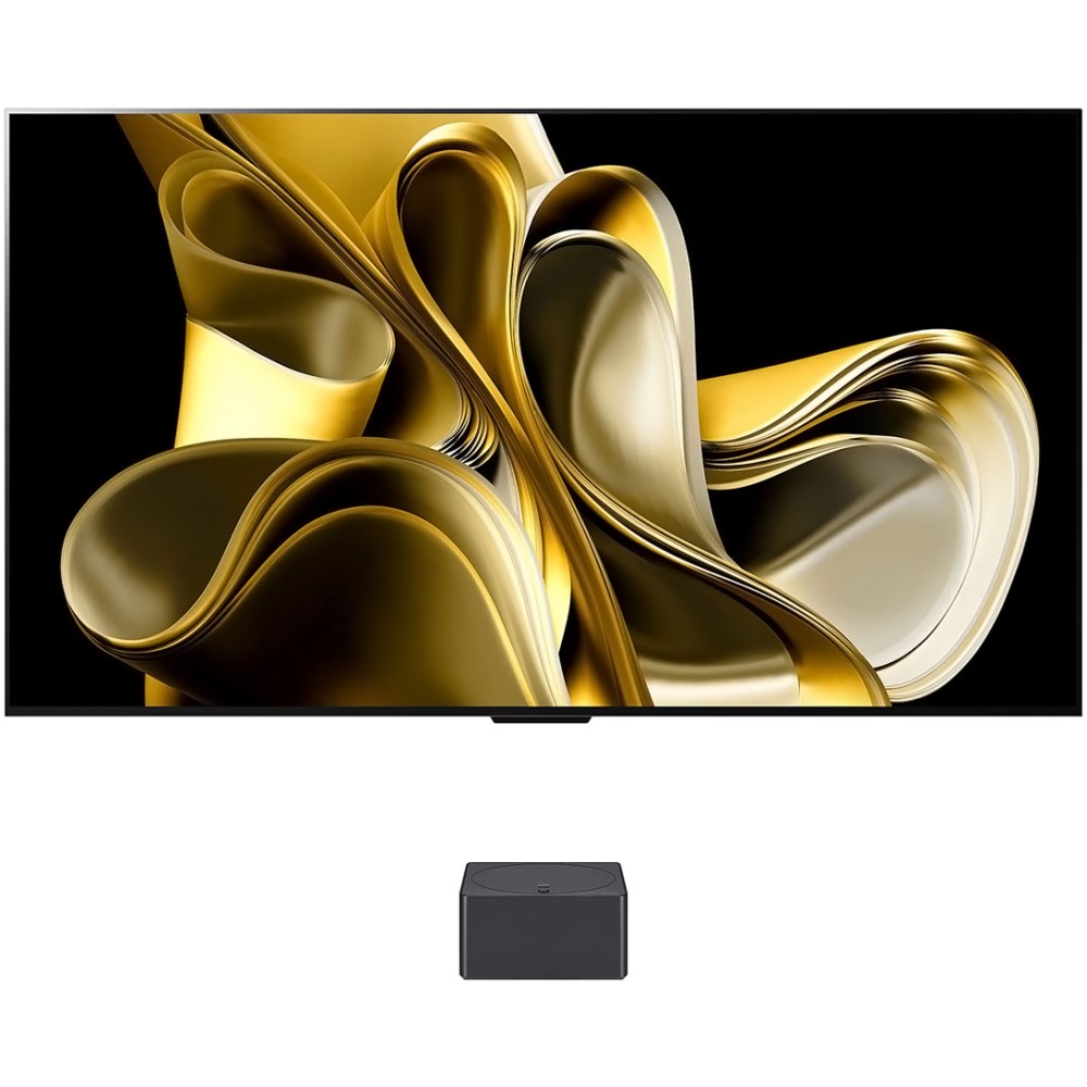 تلویزیون 83 اینچ ال جی M3 با طراحی بسیار شیک و لوکسی که دارد نظر هر فردی را به خود جلب می کند. این محصول جزو تلویزیون های بالارده و خاص شرکت کره ای LG محسوب می شود و دارای زبان طراحی Gallery می باشد. این مدل به عنوان یک تلویزیون 83 اینچی طراحی بسیار باریکی دارد و ضخامت بدنه آن در حدود 2.8 سانتیمتر (28 میلیمتر) است. همین موضوع باعث شده است تا هنگام نصب آن روی دیوار، تلویزیون به خوبی با دیوار فیت شده و ظاهری شیک و زیبا به محیط شما ببخشد. ال جی حاشیه و قاب سه طرف صفحه نمایش این تلویزیون را باریک تر از حاشیه پایینی آن طراحی کرده است تا علاوه بر زیبایی بیشتر محصول، هنگام تماشای محتواهای مختلف حواس بیننده کمتر پرت شده و بتواند بر روی محتوای در حال پخش راحت تر تمرکز کند. دقت کنید که تلویزیون مذکور پایه رومیزی ندارد و الجی آن را برای نصب بر روی دیوار طراحی کرده است؛ به همین دلیل است که در جعبه این محصول تنها یک پایه یا براکت دیواری وجود دارد. البته در فروشگاه ال جی امکان خرید پایه رومیزی متناسب با این تلویزیون به صورت جداگانه نیز وجود دارد و شما می توانید با تهیه آن، تلویزیون را روی میز نیز قرار دهید. اما چیزی که این مدل را از سایر تلویزیون های ال جی متمایز می کند عرضه دستگاه زیرو کانکت باکس مدل WM23EA همراه آن است. این دستگاه شبیه به دستگاه وان کانکت باکس شرکت سامسونگ می باشد و همانطور که پیش تر گفته شد تمامی پورت های ورودی و خروجی تلویزیون (به جز کابل برق) روی آن قرار دارند. البته نکته جالب و متمایز کننده این است که دستگاه Zero Connect Box به صورت بی سیم (Wi-Fi) به تلویزیون فوق متصل می شود و می تواند تمامی داده ها و سیگنال ها صوتی و تصویری را از طریق باند بی سیم 60 گیگاهرتز با بالاترین کیفیت ممکن به تلویزیون منتقل کند. بنابراین شما باید تمام وسایل و دستگاه های مورد نظر خود را به زیرو کانکت باکس متصل کنید و امکان اتصال مستقیم دستگاهی به تلویزیون وجود ندارد. این موضوع باعث شده است تا دیگر خبری از کابل های متعدد در اطراف و پشت تلویزیون نبوده یا حتی نیازی نباشد تا کابل ها را مدیریت و منظم نمایید. دستگاه Zero Connect Box عرضه شده به همراه تلویزیون مذکور دارای ابعاد 230x121.7x230 میلیمتر و وزن 3 کیلوگرم است که به شکل یک جعبه مکعب مستطیل مشکی رنگ می باشد. در بالای زیرو کانکت باکس یک صفحه گردان دایره ای شکل برای تنظیم زاویه سیگنال ارسالی به تلویزیون (به سمت چپ و راست) وجود دارد که می توانید آن را به صورت ساعتگرد و پادساعتگرد بچرخانید. همچنین در بالای Zero Connect Box یک کلید نیز تعبیه شده است که با عقب و جلو بردن آن می توانید زاویه سیگنال ارسالی به تلویزیون را به سمت بالا و پایین تنظیم نمایید. ال جی در بالای بدنه دستگاه زیرو کانکت باکس یک نشانگر ال ای دی تعبیه کرده است و به کمک آن متوجه خواهید شد که دستگاه مذکور را در جای مناسبی قرار داده اید و سیگنال ارسالی با قدرت مناسبی به تلویزیون می رسد. در صورتی که ال ای دی گفته شده آبی رنگ شود یعنی سیگنال قوی و عالی است؛ رنگ سبز نشان دهنده سیگنال خوب، رنگ زرد نشان دهنده سیگنال ضعیف و رنگ قرمز نیز نشان دهنده قطع شدن سیگنال می باشد. علاوه بر آن، یک نشانگر ال ای دی دیگر نیز در جلوی زیرو کانکت باکس وجود دارد که خاموش و روشن بودن دستگاه را نشان می دهد. لازم به ذکر است که میکروفون داخلی تلویزیون در جلوی بدنه Zero Connect Box تعبیه شده است و اگر دستگاه مذکور را در محل مناسبی قرار ندهید ممکن است برای استفاده از قابلیت Hands-free Voice Control با مشکل مواجه شوید.