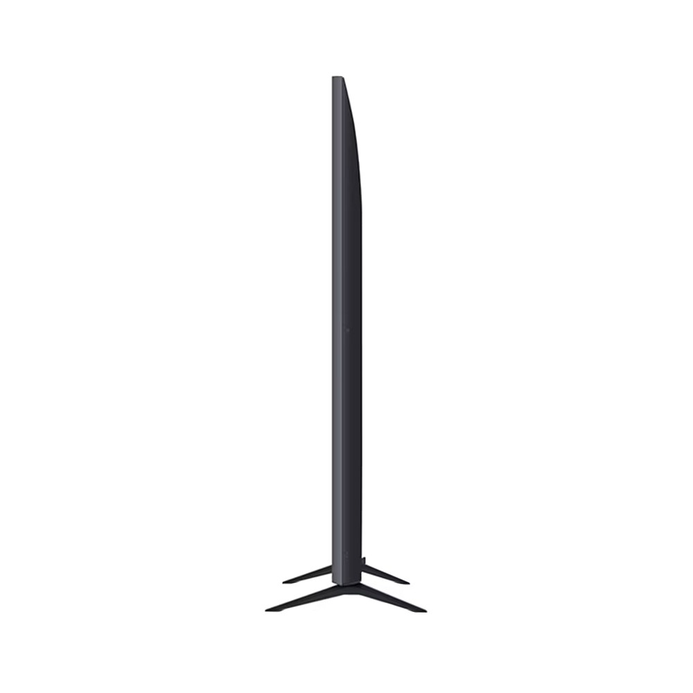 تلویزیون 86 اینچ ال جی UR8050 به لطف برخورداری از زبان طراحی 3 Sided Cinema Screen حاشیه های باریکی در سه طرف صفحه نمایش خود دارد و به شما امکان تمرکز بیشتری بر روی محتوای در حال پخش را می دهد. الجی برای این محصول پایه های دو شاخه ای را از جنس پلاستیکی طراحی کرده است که به کمک پیچ در دو طرف آن نصب می شوند. فاصله قرارگیری این پایه ها از یکدیگر به گونه ای است که نمی توان تلویزیون را بر روی میز کوچکی قرار داد. این تلویزیون دارای ضخامت 5.99 سانتیمتر می باشد و در صورتی که بخواهید آن را بر روی دیوار نصب کنید، مشکلی نخواهد داشت. البته لازم است بدانید که براکت دیواری به همراه محصول عرضه نمی شود و شما در صورت نیاز باید آن را به صورت جداگانه تهیه نمایید. قاب این تلویزیون به رنگ خاکستری طراحی شده است و در کنار رنگ مشکی بدنه و پایه های آن، زیبایی خاصی را ایجاد نموده است. در جعبه این محصول گیره های مخصوص مدیریت کابل (Cable Management) و بست کمربندی قرار دارد تا شما بتوانید به کمک آن ها کابل های مربوطه را در پشت تلویزیون مرتب کنید. کابل برق تلویزیون مذکور به صورت دو شاخه می باشد و برای اتصال آن به پریز، نیازی به تبدیل 3 به 2 نخواهید داشت.