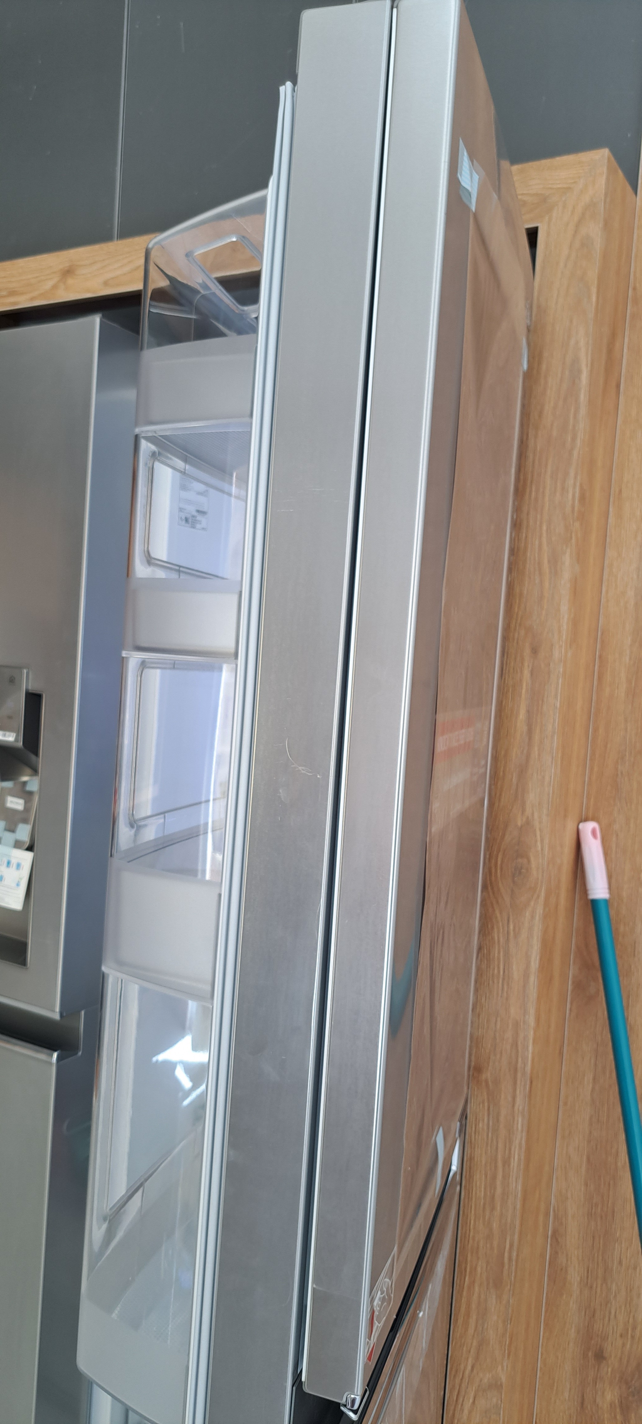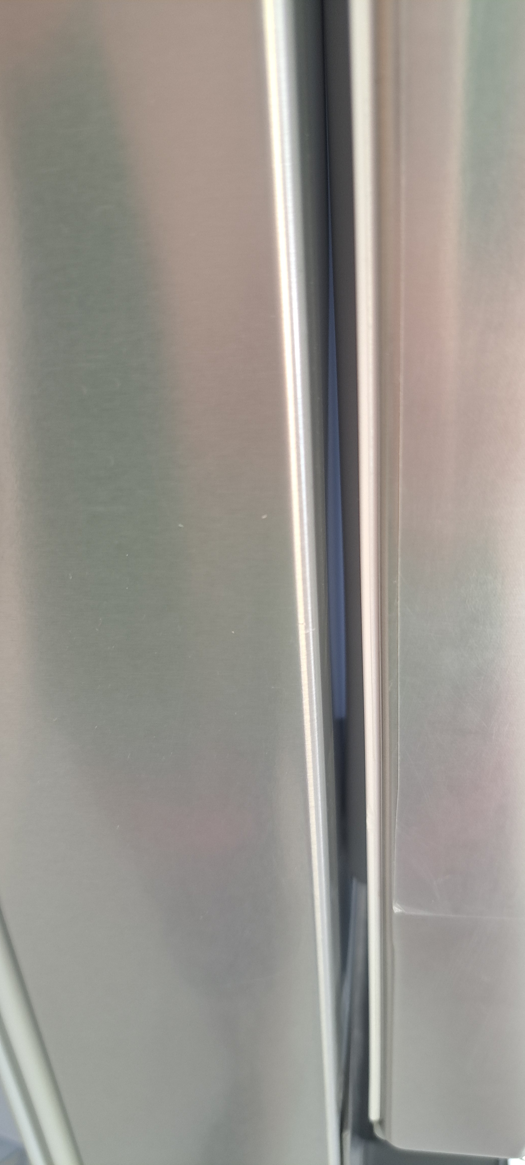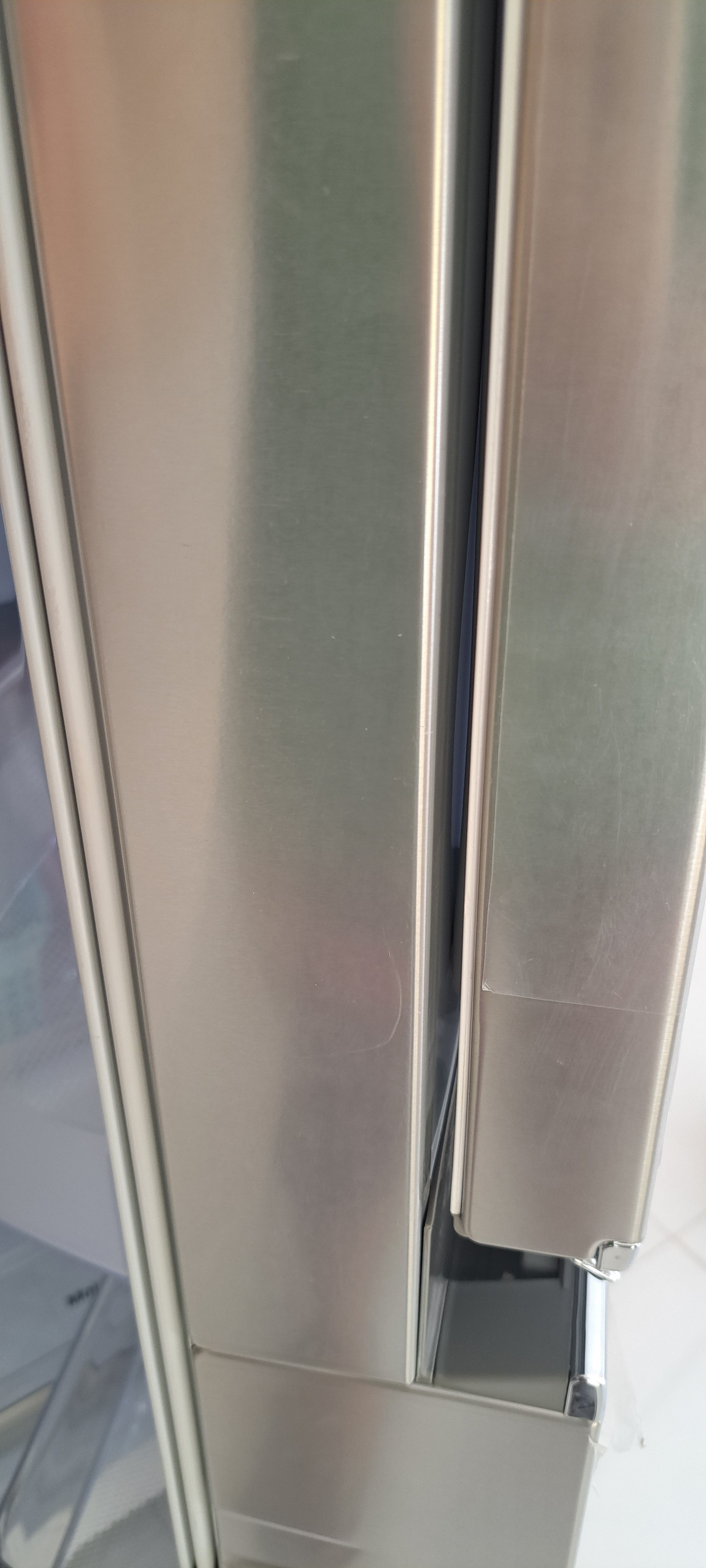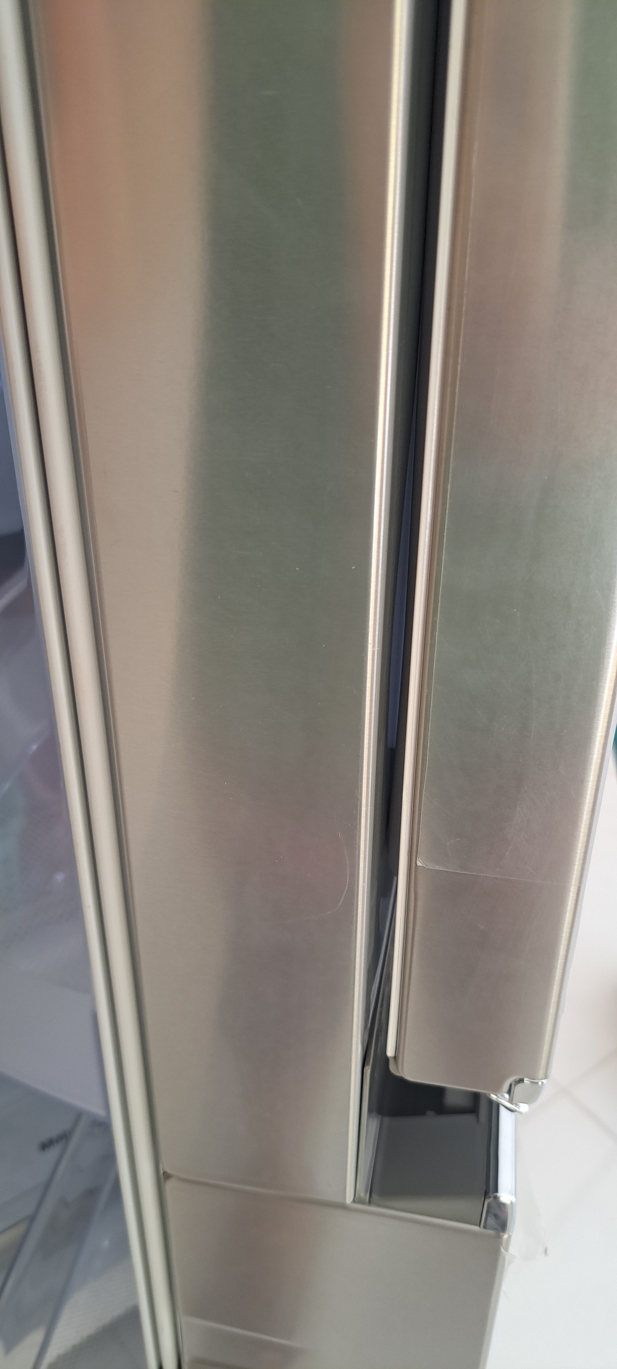 با توجه به عکس های ارسالی شما بین درب Door-in-Door و یخچال فریزر یک فاصله وجود دارد و واشرهای آن قسمت آسیب دیده اند. این فضای باز و فاصله باعث می شود تا سرمای داخل یخچال به هدر برود و هوای گرم بیرون نیز روی عملکرد یخچال تاثیر منفی داشته باشد و در دراز مدت ممکن است به یخچال فریزر حتی آسیب نیز وارد کند. بنابراین حتما با فروشنده خود در مورد این موضوع صحبت کرده تا آن را رفع و رجوع کند یا اگر یخچال فریزر را با گارانتی خریداری کرده اید، این موضوع را با شرکت گارانتی کنده خود در میان بگذارید تا واشرها را تعویض کند. در صورتی که هیچ کدام از این موارد میسر نبود می توانید با یک نصاب یا تعمیرکار مجرب در این زمینه صحبت کنید تا واشر (لاستیک دور در) را برای شما تعویض کند.