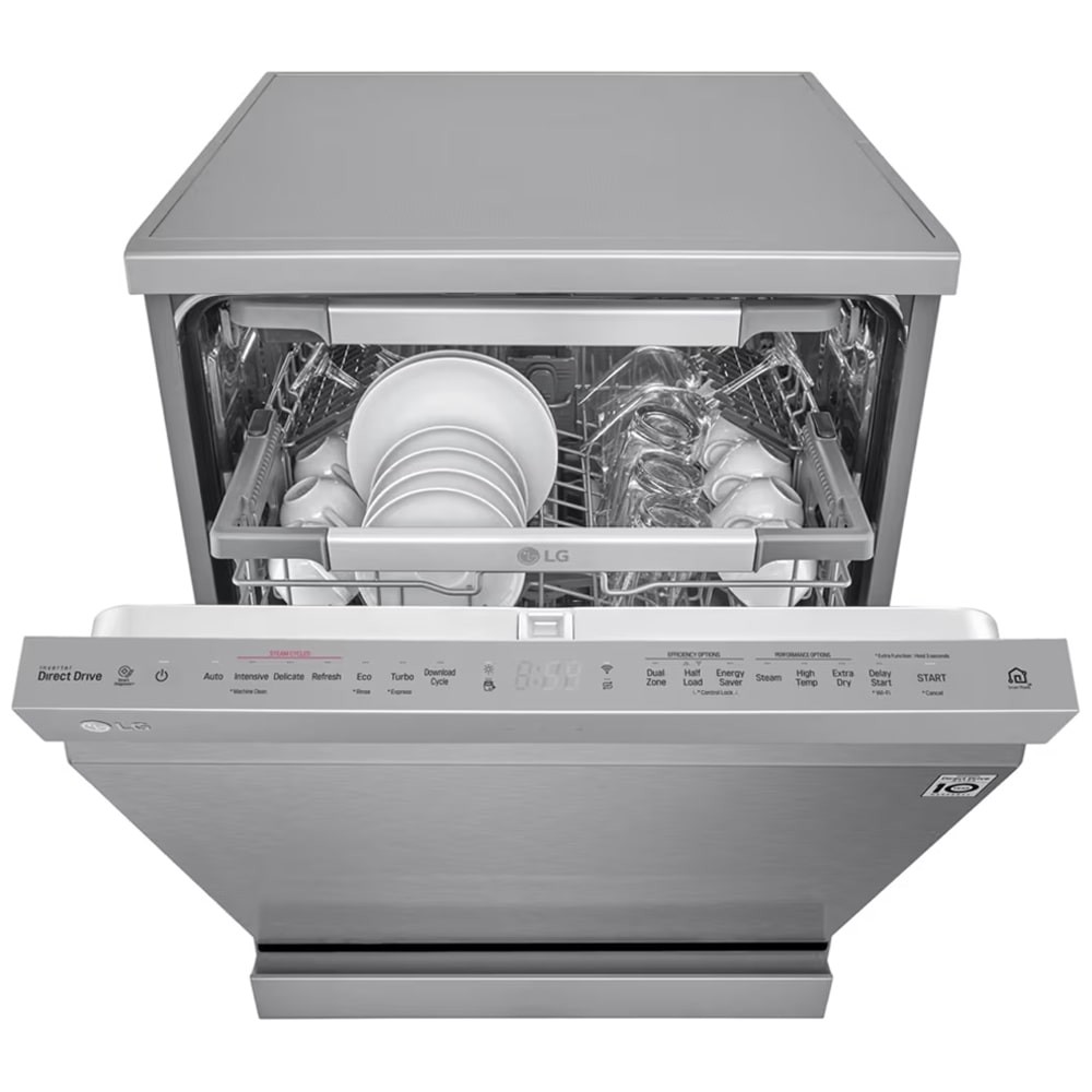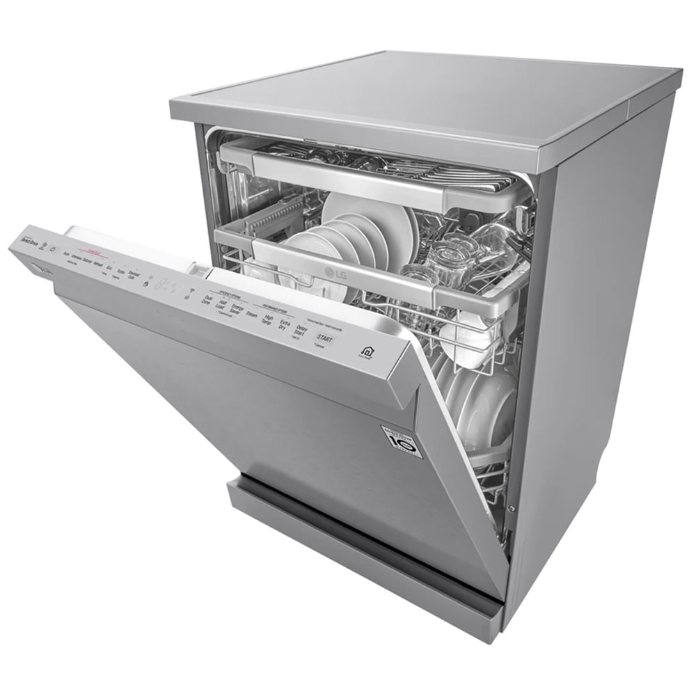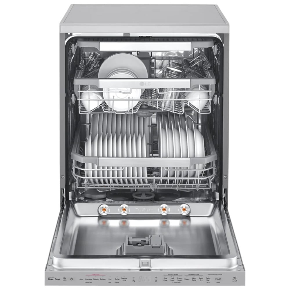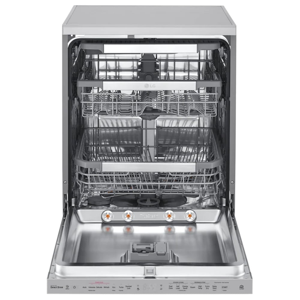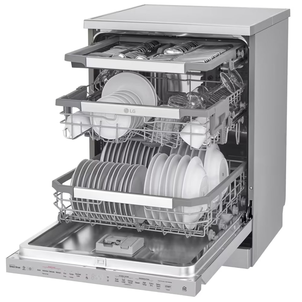 - تکنولوژی TrueSteam برای شستشو و خشک کردن کامل ظروف قابلیت شروع شستشو با تاخیر از 1 تا 12 ساعت کنترل کاملا الکترونیکی (Fully Electronic Control) برنامه Delicate برای شستشوی ظروف ظریف و شیشهای سیستم Vario Plus برای شستشوی بهتر ظروف به کمک بازوی وسط دارای نشانگر پر کردن مجدد نمک (Salt Refill Icon) دارای پنل کنترلی مخفی (Hidden Panel Control) دارای 4 نوار نویزگیر (Noise Strip) با قابلیت نصب برای کاهش انتقال لرزش و صدای ماشین ظرفشویی دارای قابلیت تاشو (Foldable Tines) دندانه های سبد برای جایگیری ظروف بزرگ تر سیستم Smart Diagnosis برای عیب یابی هوشمند قابلیت High temp برای شستشو با آب داغ شستشوی توربو (Turbo Cycle) در 59 دقیقه دارای موتور Inverter Direct Drive با طول عمر بالا و صرفه جویی در مصرف انرژی و زمان هنگام شستشو قابلیت Energy Saver برای صرفه جویی در مصرف انرژی قابلیت تنظیم ارتفاع طبقات یا سبد ها در 3 سطح مختلف دارای صفحه نمایش سگمنتی از نوع میکرو ال ای دی (Micro LED) دارای سنسور تشخیص میزان کثیفی آب و ظروف (Soil Sensor (Turbidity Sensor)) قابلیت Auto Opening Door برای باز شدن خودکار درب بعد از اتمام شستشو طراحی کاملا مینیمال برای هماهنگی هر چه بهتر با آشپزخانه شما پشتیبانی از اینترنت اشیا (IoT) برای مدیریت و کنترل ماشین ظرفشویی از راه دور دارای چرخه Intensive برای شستشوی ظروف بسیار کثیف قابلیت Machine Clean Reminder جهت یادآوری تمیز کردن دستگاه از طریق برنامه LG ThinQ تکنولوژی QuadWash برای شستشوی بهتر ظروف با استفاده از بازوی آبپاش 4 پره استفاده از مواد ضد باکتری در ساخت برخی از اجزا ماشین ظرفشویی (Anti-Bacterial Treatment) سیستم Aqua-Stop برای جلوگیری از نشت آب پشتیبانی از برنامه LG ThinQ برای کنترل و مدیریت ماشین ظرفشویی از طریق موبایل (مخصوص موبایل های اندرویدی و iOS) قابلیت Half Load برای شستشوی ظروف با نصف ظرفیت شستشوی سریع (Express Cycle) در 38 دقیقه قابلیت Control Lock برای قفل کردن پنل کنترلی ماشین ظرفشویی دارای 3 چراغ نشانگر برای نمایش وضعیت دستگاه (SignaLight) سیستم تنظیم شدت جریان آب بین سبدها و طبقات مختلف (Vario Washing System) مجهز به قابلیت Delay Start برای شروع شستشو با تاخیر تکنولوژی Condensing برای خشک کردن ظروف به کمک هوای داغ حاصل از دور آخر آبکشی و فن تکنولوژی Detergent Detection برای صرفه جویی و تنظیم خودکار میزان استفاده از مواد شوینده سیستم EasyRack Plus برای تنظیم طبقات یا سبد های ماشین ظرفشویی قابلیت Dual Zone برای شستشوی ظروف ظریف و ظروف بزرگ به طور هم زمان دارای مبدل حرارتی مخفی (Hidden Heater) دارای Wi-Fi برای اتصال به شبکه و اینترنت قابلیت Steam برای شستشو با بخار قابلیت Adjustable Leg برای تنظیم پایه ها تا 30 میلیمتر سیستم Water Softener برای تنظیم میزان سختی آب دارای قیف (Funnel) برای پر کردن مخزن نمک ماشین ظرفشویی دارای چرخه Refresh یا تازه سازی برای رفع گرد و غبار روی ظروف (شستشوی بدون مواد شوینده) برنامه شستشوی Machine Clean برای شستشو و تمیز کردن خودکار داخل ماشین ظرفشویی دارای 3 بازوی آبپاش (Top, Upper, Lower Spray Arms) سیستم SenseClean میزان کثیفی ظروف را تشخیص می دهد و شستشو را به صورت خودکار تنظیم میکند تضمین عملکرد و کارایی موتور Inverter Direct Drive تا 10 سال توسط ال جی قابلیت Extra Dry برای خشک کردن بهتر ظروف دارای نگهدارنده مخصوص لیوان های پایه دار (Stemware Holder)