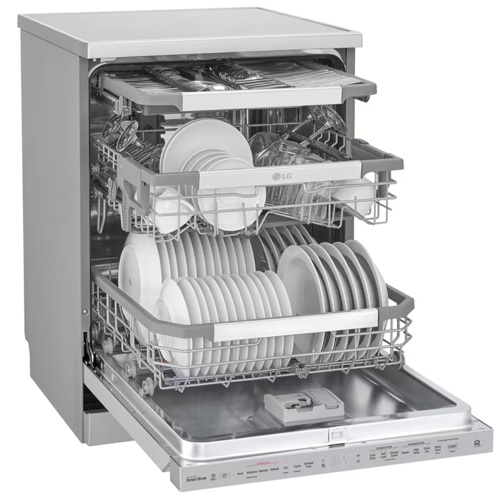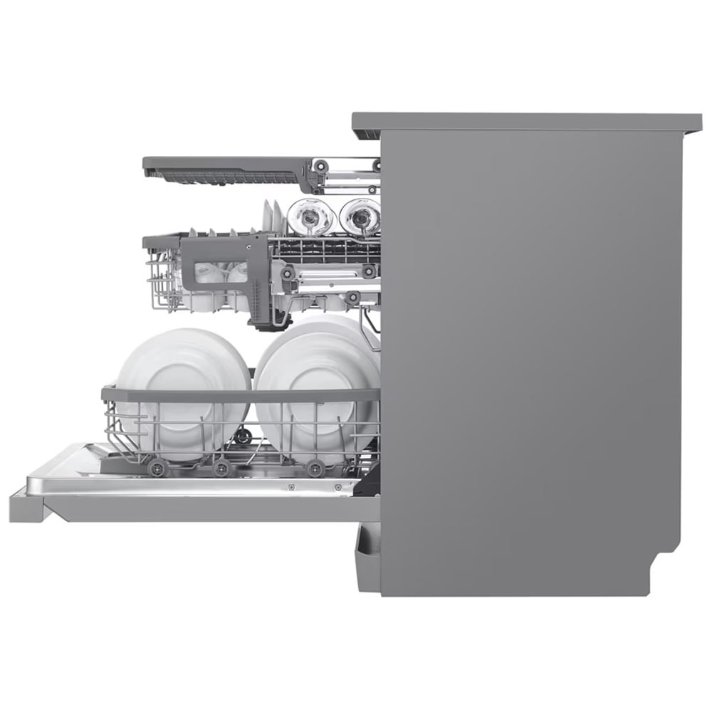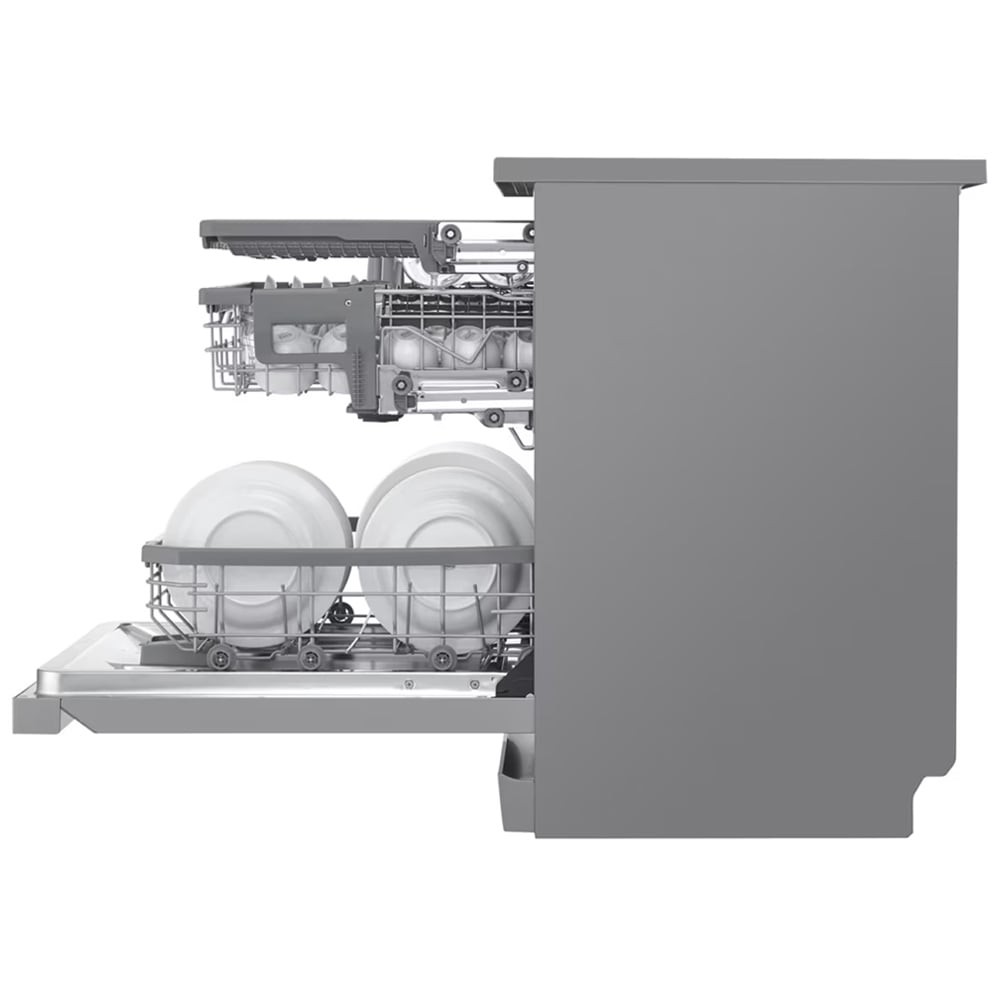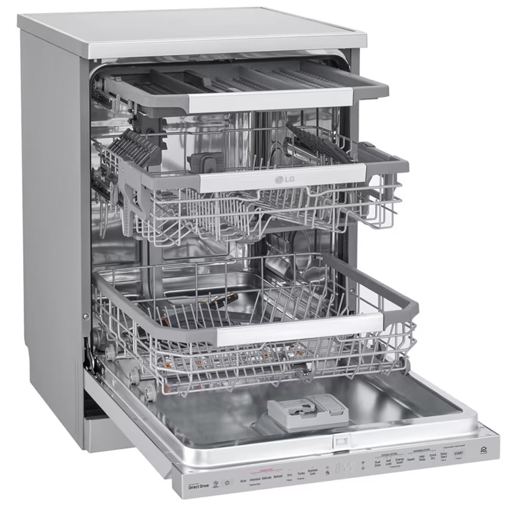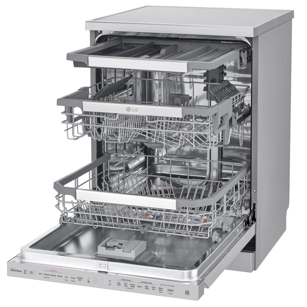 Dishwasher LG DFC335HP ظاهری زیبا و مدرن دارد و با هر طراحی آشپزخانهای سازگار است. این ماشین ظرفشویی ایستاده با مجموعهای از ویژگیهای پیشرفته و روکش نقرهای پلاتینیومی براق، سبک و عملکرد را به طور یکپارچه ترکیب میکند تا هر بار نتایج بینقصی را ارائه دهد. با باز کردن درب، پنل کنترل بالایی آن نمایان میشود که یک نمایشگر LED را در میان مجموعهای از دکمههای لمسی قرار میدهد که اطلاعات دقیقی در مورد برنامهها، زمان باقی مانده و وضعیت اجرا را نشان میدهد. کاربران میتوانند با استفاده از پنل کنترل ساده و قابل فهم، تنظیمات و برنامههای مناسب را انتخاب کنند. با باز کردن کامل درب، سه قفسه ماشین ظرفشویی نمایان میشود. قفسههای پایینی و میانی دارای دندانههای تاشو هستند، قفسه میانی را میتوان به صورت عمودی تنظیم کرد و قفسه سوم فضای زیادی را برای ملاقههایی که نمیتوانستید در سبد ظروف جا دهید، فراهم میکند بنابراین میتوانید به راحتی ماشین ظرفشویی را متناسب با نیازهای خود پیکربندی کنید و جا دادن ظروف با اندازهها و شکلهای مختلف آسان خواهد شد و میتوانید به راحتی همه چیز را از قابلمههای بزرگ گرفته تا لیوانهای ظریف را بدون دردسر بشویید.
