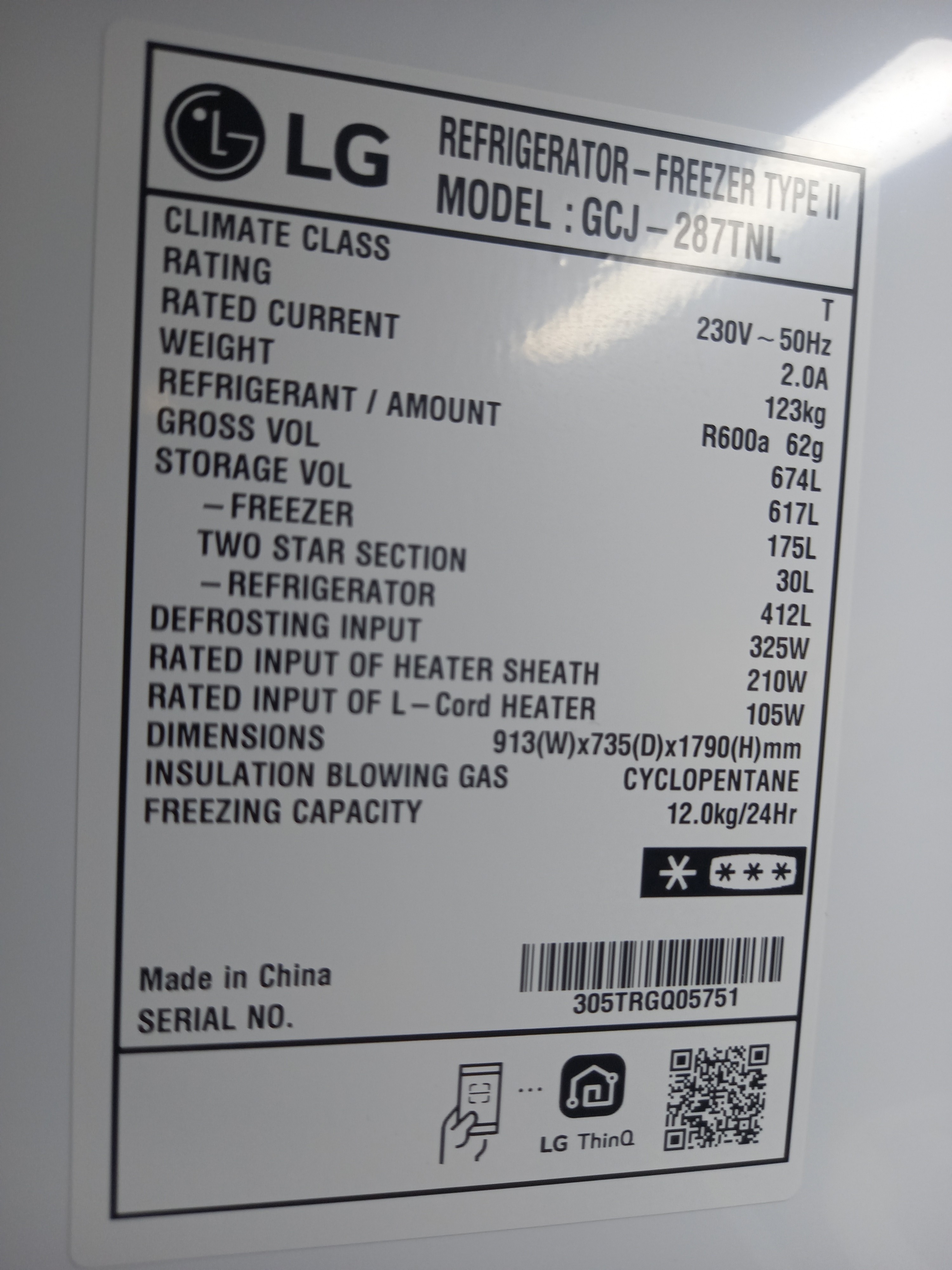 یخچال فریزر ال جی J287 یا GCJ-287TNL مدلی که دارای عملکرد درب در درب یا همان قابلیت Door-in-Door ال جی است که اساساً به شما امکان میدهد درب مناسب برای دسترسی به نوشابهها و چاشنیهای ذخیره شده در قفسههای داخل درب را باز کنید. این یخچال مونتاژ کشور چین میباشد که هم اکنون در بازار ما موجود است و شما میتوانید نسبت به خرید آن اقدام نمایید. گاها این محصول در بازار به عنوان یخچال فریزر ال جی J287 هم معرفی میشود و احتمال اینکه با مدلهای مشابه اشتباه گرفته شود وجود دارد پس در هنگام خرید دقت لازم را خرج دهید تا مدل درست و دقیق این محصول که یخچال فریزر ال جی GCJ-287TNL رنگ نقرهای میباشد را خریداری نمایید. یخچال فریزر ساید بای ساید ال جی J287 دارای ظرفیت کل 674 لیتر یا 24 فوت (یخچال 424 لیتر و فریزر 250 لیتر) است و برای یک خانواده با جمعیت متوسط بسیار مناسب میباشد. البته احتمال دارد محصول فوق در فروشگاههای دیگر با عنوان یخچال فریزر 28 فوت یا 30 فوت نیز معرفی شود، اما صرفا تبلیغاتی است. البته ظرفیت واقعی یا قابل استفاده این یخچال فریزر در واقع 617 لیتر میباشد که شامل 412 لیتر در بخش یخچال و 205 لیتر در بخش فریزر است.