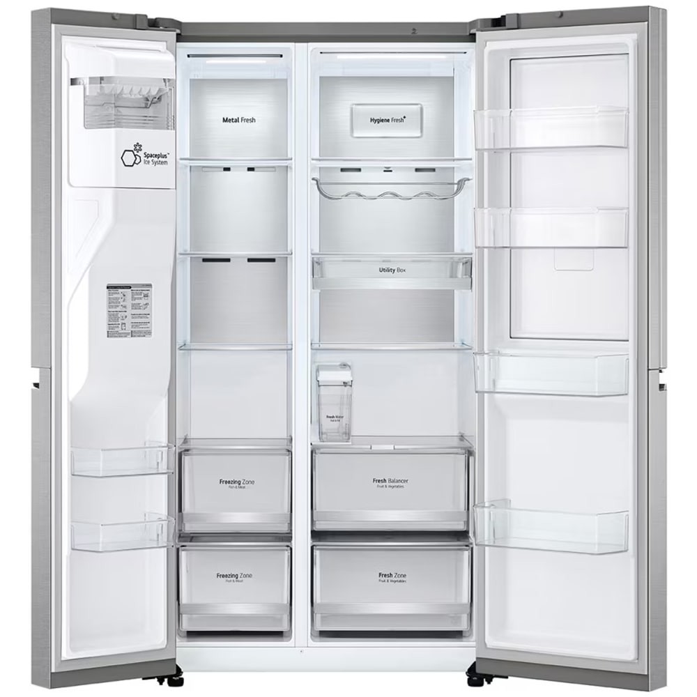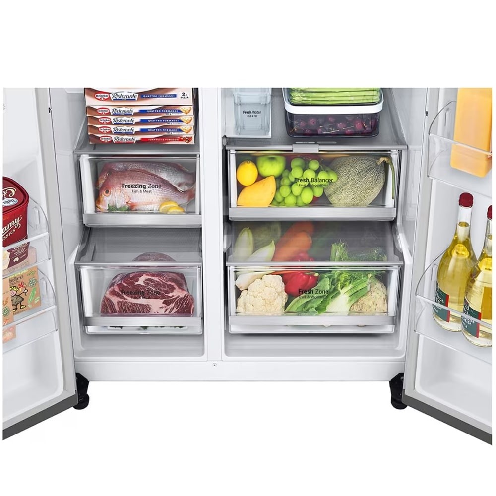 یخچال فریزر 24 فوت ال جی J287 از قابلیت Door-in-Door یا همان درب روی درب برخوردار است که باعث میشود تا به آنچه در قفسههای درب، قفسههای نوشیدنی و قفسههای شیشهای در نیمه بالایی یخچالتان وجود دارد بدون باز کردن درب اصلی یخچال دسترسی داشته باشید. بر روی درب یخچال درب دیگری تحت عنوان دور این دور وجود دارد که با استفاده از اهرمی که در گوشه درب قابل مشاهده است باز میشود. اجزای داخلی بخش یخچال شامل دو کشوی Fresh Balancer و Fresh Zone میباشد. Fresh Balancer مقدار صحیح رطوبت را تنظیم میکند تا سبزیجات و میوههای شما را با فشار دادن یک دکمه در بهترین حالت نگه دارد. در قسمت میانی یخچال هم کشوی Utility Box وجود دارد که برای نگهداری اقلام غذایی کوچک کاربردی میباشد. بالای این کشوها تعدادی قفسه وجود دارد که به خوبی میتوانند وزن مواد غذایی را تحمل کنند. همچنین تعدادی قفسه بر روی درب قرار دارد که برای نگهداری نوشیدنیها میتوانید از آنها استفاده کنید. در بخش فریزر هم چند قفسه به همراه دو کشو Freezing Zone (مخصوص نگهداری گوشت و ماهی) وجود دارد. ضمن اینکه دو قفسه دیگر هم بر روی درب زیر محفظه یخساز قرار داده شده است. سیستم یخساز اتوماتیک این یخچال فریزر از نوع SpacePlus Ice System میباشد که فضای کمی برای قرارگیری اشغال میکند. باید گفت که این سیستم یخساز توانایی تولید یخهای حبهای و خرد را دارد. از طریق پنل لمسی موجود بر روی درب فریزر میتوانید برخی از تنظیمات دستگاه را انجام دهید. علاوه بر این در زیر این بخش محفظه آب سردکن و یخریز قرار دارد که دسترسی سریع به آب سرد و تکهها کوچک یخ را فراهم میکند. ضمن اینکه این یخچال فریزر دارای صفحه فلزی مخصوص (Metal Fresh) در قسمت داخلی یخچال برای ثابت نگهداشتن و حفظ سرما میباشد.