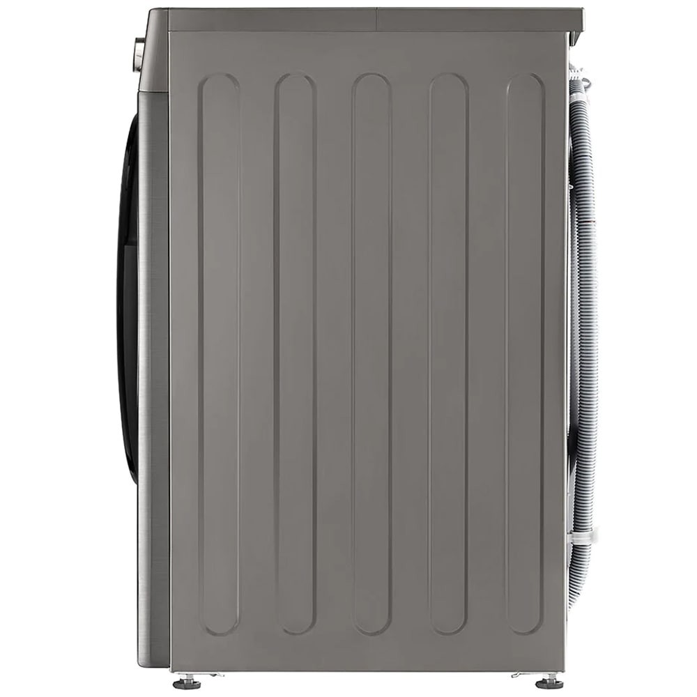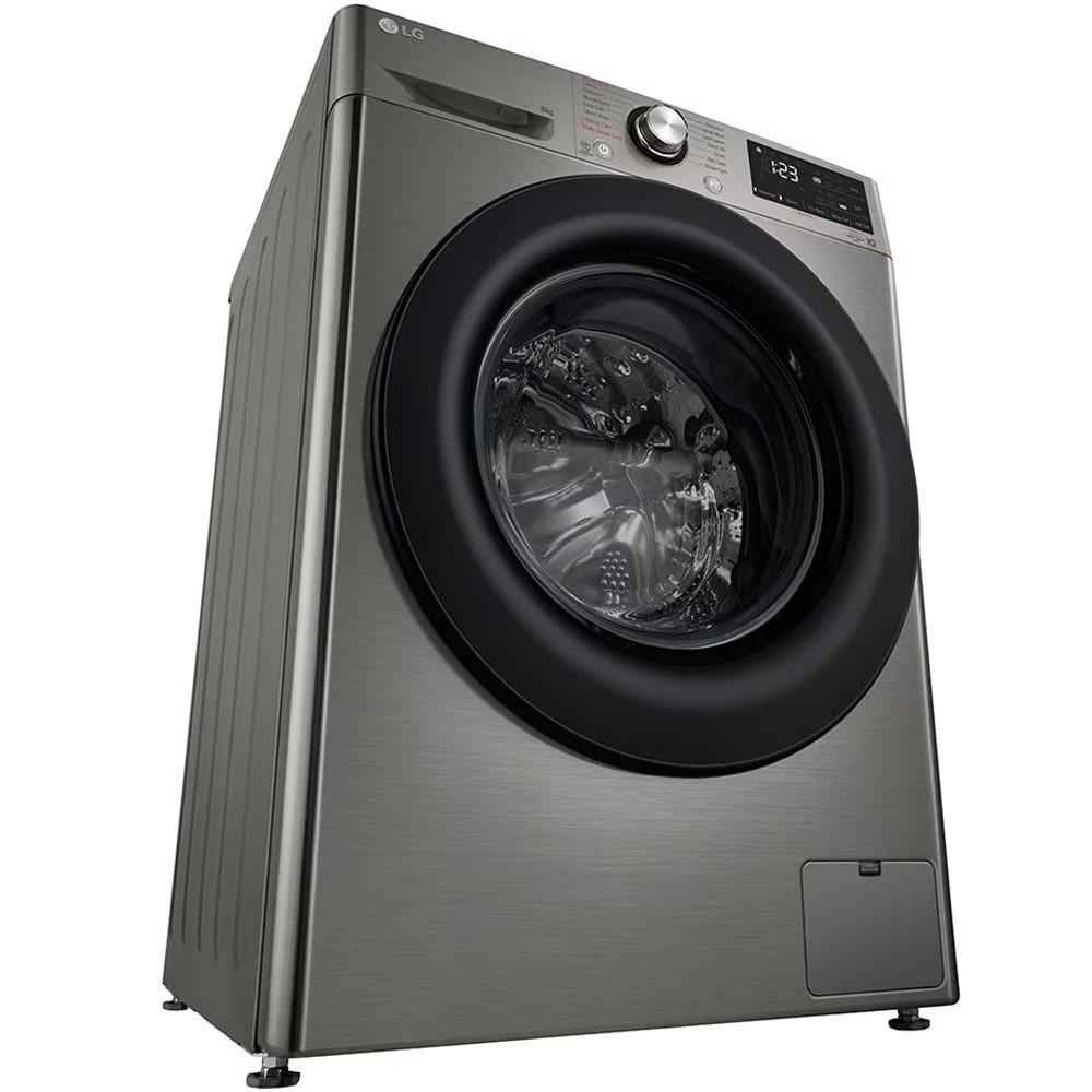 ماشین لباسشویی ال جی F4R3VYG6P در نگاه اول با طراحی مینیمال و مدرن خود جلب توجه میکند. رنگ بدنه نقرهای جلوهای حرفهای و هماهنگ با آشپزخانههای مدرن ایجاد کرده است. ابعاد کلی دستگاه حدود 850 میلیمتر ارتفاع، 600 میلیمتر عرض و 565 میلیمتر عمق است که به راحتی در فضای داخل کابینت قرار خواهد گرفت. درب بزرگ شیشهای در مرکز بدنه قرار دارد و با حاشیهی مشکی براق طراحی شده تا ترکیب رنگی عالی میان بخش فلزی و شیشهای ایجاد شود. زاویهی باز شدن درب به اندازهای است که دسترسی به داخل دیگ را حتی برای لباسهای حجیم آسان میکند. در بخش داخلی، دیگ از جنس استیل ضد زنگ با الگوی موجی شکل (Emboss Drum) ساخته شده است بنابراین تماس لباس با سطح دیگ نرمتر و ایمنتر انجام خواهد شد و از کشیدگی یا آسیب به بافتهای ظریف مانند ابریشم و پشم جلوگیری میشود. در قسمت بالای درب صفحه نمایش قرار دارد که اطلاعات زمان باقیمانده، برنامه فعال و وضعیت دستگاه را به صورت کاملا خوانا نمایش میدهد.
