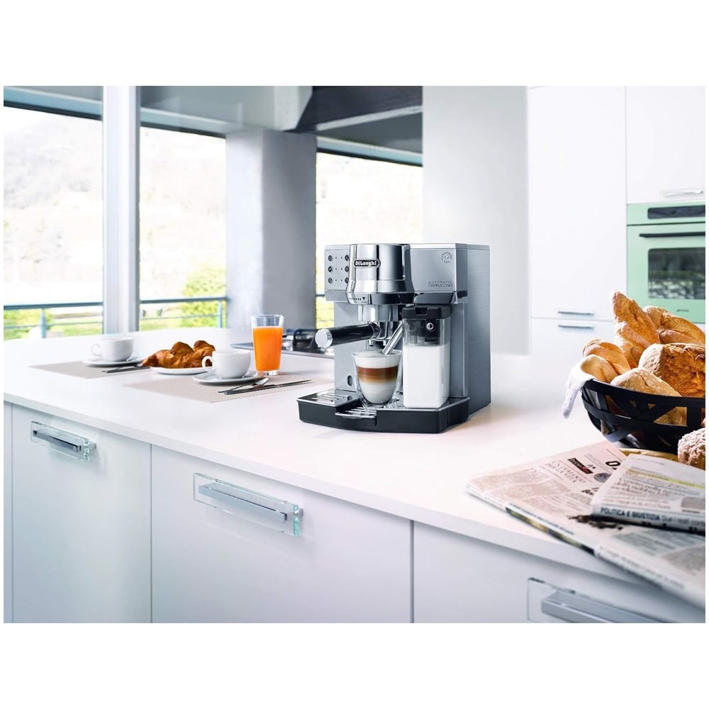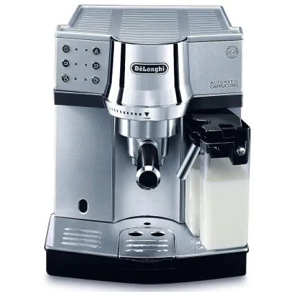 اسپرسوساز دلونگی EC850M یک قهوه ساز عالی برای کسانی که عاشق قهوه با شیر هستند که با طراحی پیچیده و شیک تولید شده و تمام قطعات آن فلزی می باشد و به شما استحکام بیشتری را می دهد. این دستگاه یکی از محصولات باکیفیت تولید شده توسط برند دلونگی است، De'Longhi یک تولید کننده ی مشهور قهوه ساز یا اسپرسوساز با چندین سال تجربه است که این امر در ویژگی های منحصر به فرد این دستگاه نیز مشهود است. این یک ماشین با کارایی بالا است اما مصرف انرژی آن محدود است؛ استفاده از این دستگاه بسیار آسان است و تنها با یک لمس می توانید بین دم کرده، آب داغ، کاپوچینو و ... یکی را انتخاب کنید. در واقع اگر به دنبال یک افزودنی عالی برای خانه، دفتر شخصی، مغازه و یا کافی شاپ خود هستید این محصول می تواند یک انتخاب عالی برای شما باشد. این دستگاه مجهز به عملکرد کاپوچینوی اتوماتیک و نگهدارنده ی فیلتر فولادی ضد زنگ حرفه ای است که هر زمان که نیاز داشته باشید اسپرسوها و کاپوچینوهای حرفه ای تولید می کند. این محصول نه تنها اسپرسو و قهوه سیاه بلکه می تواند لاته، کاپوچینو و لاته ماکیاتو نیز تهیه کند. همه ی این نوشیدنی ها را می توان از دانه های از قبل آسیاب شده یا از غلاف های قهوه تهیه کرد. نوشیدنی ها در این دستگاه اسپرسوساز قابل برنامه ریزی هستند، شما می توانید مقدار دلخواه خود را تنظیم کنید، بنابراین لازم نیست نگران باشید که نوشیدنی های شما در فنجان جا نمی شوند. کنترل و استفاده از این دستگاه بسیار آسان است بنابراین می توانید فقط بنشینید و از خوردن یک فنجان قهوه ی عالی لذت ببرید.