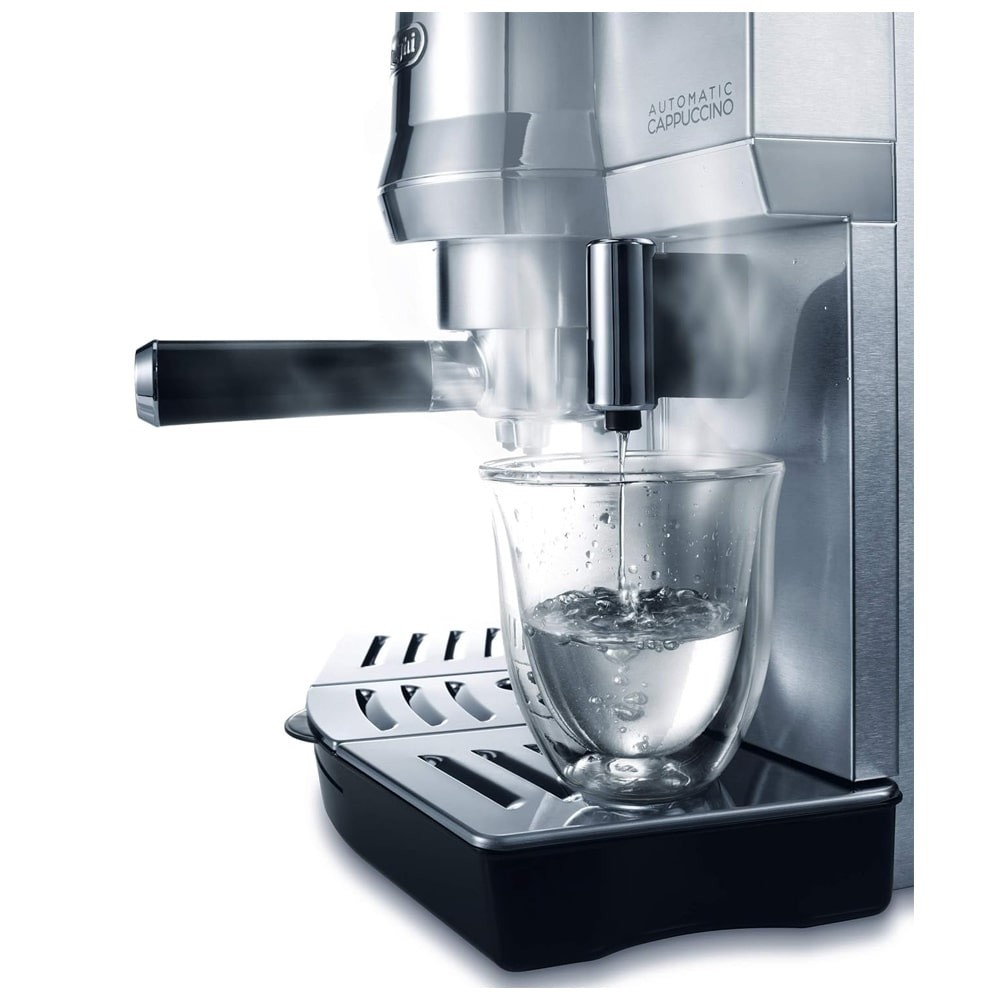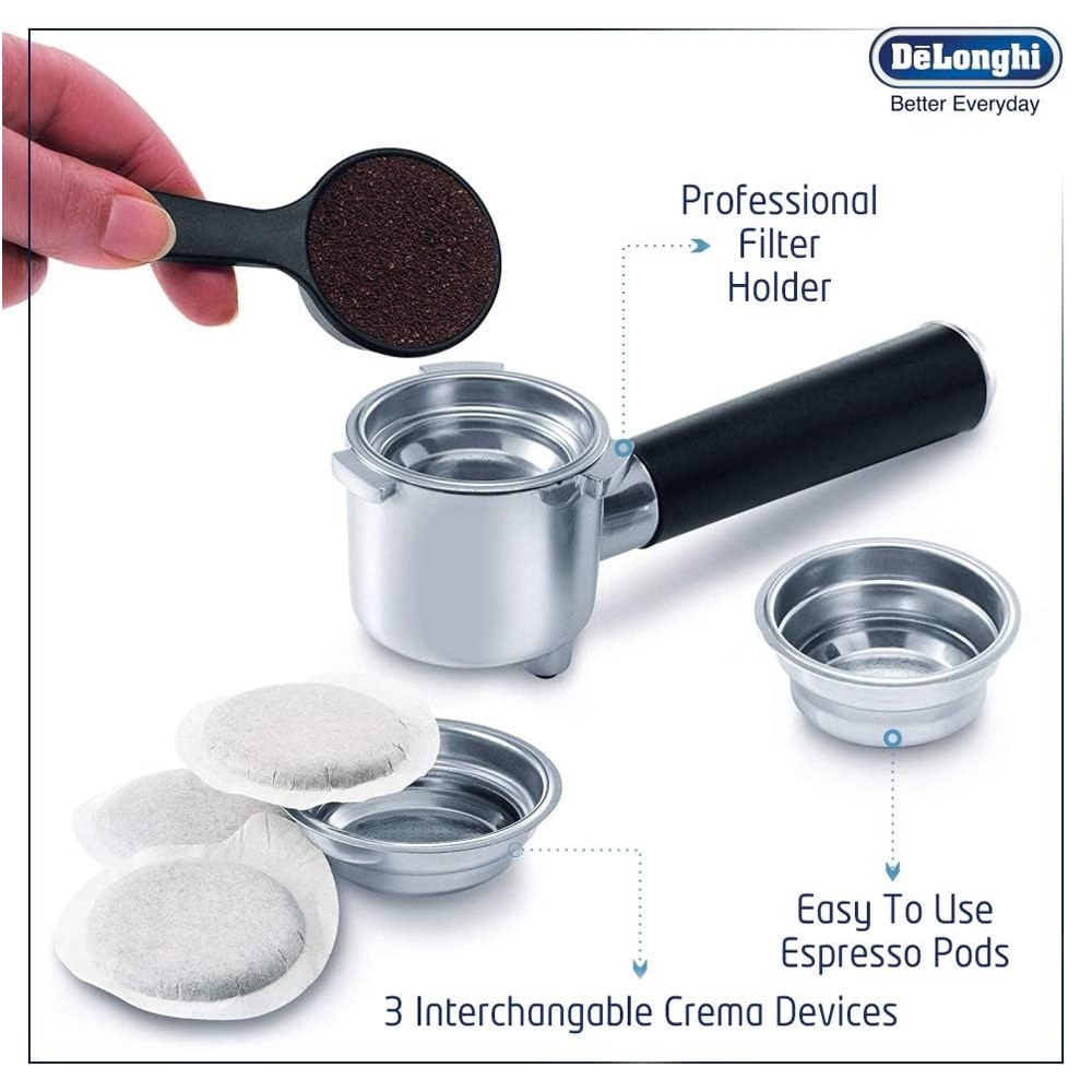 آیا می خواهید به قهوه و فنجان خود در یک مکان دسترسی داشته باشید! این دقیقا همان چیزی است که با این دستگاه به دست می آورید. این محصول دارای یک قفسه ی فنجانی است که در بالای دستگاه قرار گرفته است و می توانید لیوان و فنجان خود را در آن قرار دهید، به عبارتی این قفسه به شما این اطمینان را می دهد که هر زمان که یک فنجان قهوه و یا آب گرم می خواهید یک فنجان آماده داشته باشید. این دستگاه همچنین توانایی گرفتن اسپرسو برای یک نفر یا اسپرسو سینگل و همچنین با تعویض پرتا فیلتر برای دو نفر یا اسپرسوی دوبل را دارد. این دستگاه قهوه ساز اتوماتیک نیست. این بدان معنی است که شما باید دانه های قهوه خود را آسیاب کنید و مخلوط آسیاب شده را در داخل فیلتر پورتا قرار دهید. خبر باورنکردنی در مورد این دستگاه این است که به غیر از قهوه آسیاب شده از غلاف قهوه نیز استفاده می کند! این دستگاه قهوه ساز دلونگی همه چیز را دارد تا یک لیوان خوشمزه قهوه تازه و داغ را در اختیار شما قرار دهد. این اسپرسوساز دارای سیستم ثبت اختراع کاپوچینوی خودکار است که به شما امکان می دهد از یک کاپوچینو و لاته ماکیاتوی خامه ای، غنی و کف آلود لذت ببرید. نگهدارنده فیلتر حرفه ای آن با یک دستگاه کرم یکپارچه به شما امکان می دهد نوشیدنی مورد علاقه خود را با استفاده از قهوه آسیاب شده یا غلاف اسپرسو سرو آسان تهیه کنید.