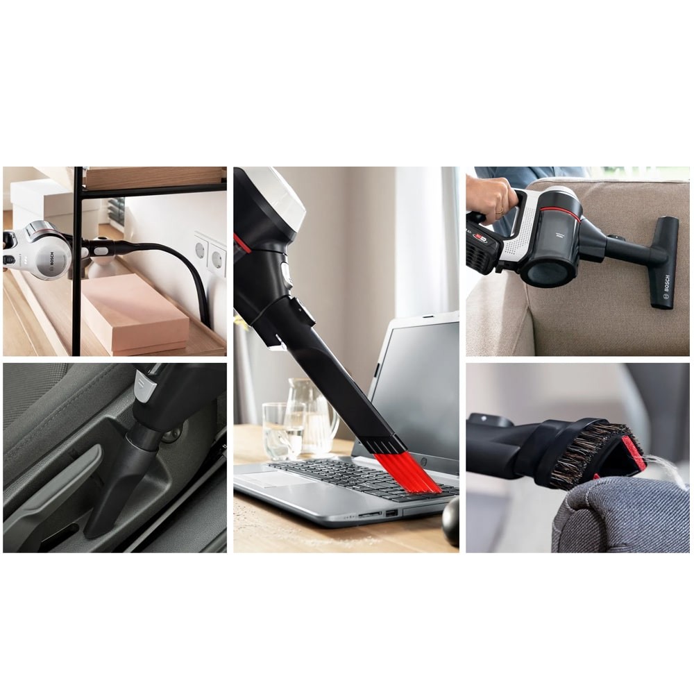 تمیز کردن داخل خودرو معمولاً مکانی دشوار است و اغلب هیچ پریز برقی در نزدیکی آن وجود ندارد. زمان کار طولانی، انعطافپذیری بالا و سهولت استفاده، جارو شارژی بوش BCS711XXL را به راه حلی عالی برای تمیز کردن ماشین شما تبدیل کرده است. جاروبرقی با طیف گستردهای از لوازم جانبی ارائه میشود که به شما کمک میکند به راحتی به هر مکانی برسید. مانند مینی نازل موتوری برای کثیفی سنگین یا نازل انعطافپذیر برای اتصالات، مناسب برای فضاهای کوچک. دیگر مجبور نخواهید شد برای تمیز کردن فضای داخلی خودرو خود به کارواش بروید. از نتایج بهینه جاروبرقی در تمام طبقات و سطوح و حتی در تاریکترین مکانها لذت ببرید! با یک برس موتوری قدرتمند، میتوانید بیش از 99.9% گرد و غبار را جمع آوری کنید. به لطف چراغهای LED داخلی قدرتمند، میتوانید خاک و گرد و غبار را حتی در مکانهایی که به سختی دیده میشود، مانند پشت مبلمان یا گوشههای تاریک پیدا کنید و جاروبرقی بکشید. علاوه بر این، میتوانید 30 درصد بیشتر گرد و غبار روی فرشها جمع آوری کنید. بنابراین میتوانید در کمترین زمان در یک خانه تمیز احساس راحتی کنید.