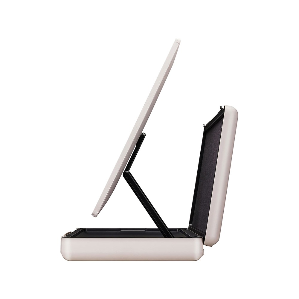 تلویزیون و مانیتور 27 اینچ ال جی LX5 از زبان طراحی Briefcase Design یا Carry Bag Design برخوردار است و به تلویزیون کیفی یا چمدانی نیز معروف است. در واقع یکی از موارد مهمی که این محصول را خاص کرده همین طراحی متفاوت و منحصر به فرد آن می باشد. محصول پیش روی شما یک کیف دستی است که داخل آن یک تلویزیون یا مانیتور لمسی با قابلیت های هوشمند متنوع قرار دارد که پیش تر به توضیح آن ها پرداخته شد. به این ترتیب شما به راحتی می توانید محصول فوق را با خود حمل کرده و به هر جایی که دوست داشتید ببرید. همانطور که گفته شد این محصول دارای باتری داخلی است و می تواند تا حدود 3 ساعت برق مورد نیاز تلویزیون را تامین کند. باتری تلویزیون و همچنین تمام بردهای این محصول داخل بخش زیرین کیف دستی قرار دارند و به خوبی محافظت شده اند. لازم به ذکر است که این مانیتور و تلویزیون چمدانی ال جی توانسته تست های مخصوص تجهیزات نظامی آمریکا را با موفقیت بگذراند و تاییدیه MIL-STD را دریافت کند. این یعنی محصول پیش روی شما دارای بدنه مقاوم در برابر ضربه و حتی گرد و خاک است و همچنین در دمای پایین و بالا قابل استفاده می باشد. البته همانطور که در ابتدا نیز اشاره کردیم، این تلویزیون ضد آب نیست و نباید حتی در محیط هایی که رطوبت بالایی دارند مورد استفاده قرار گیرد. صفحه نمایش این محصول توسط پایه ای به کف چمدان متصل شده است. این پایه به گونه ای طراحی شده است که امکان تنظیم کردن ارتفاع و زاویه صفحه نمایش وجود داشته باشد. به طور کلی شما می توانید در 3 حالت صفحه نمایش را تنظیم کنید اما به راحتی این امکان وجود دارد که صفحه نمایش را در زوایای مختلف تنظیم کنید. در حالت اول می توانید صفحه نمایش را کف کیف دستی بخوابانید و از آن به عنوان صفحه بازی و یا گرامافون دیجیتال استفاده کنید که پیش تر نیز به توضیح آن ها پرداختیم. در حالت دوم صفحه نمایش به حالت افقی (Landscape) قرار می گیرد و امکان تنظیم ارتفاع و زاویه آن وجود دارد. در حالت سوم می توانید صفحه نمایش را 90 درجه چرخانده و به صورت عمودی یا اصطلاحا پرتره (Portrait) به استفاده و تماشای محتوای مورد نظر خود بپردازید. تلویزیون فوق دارای تکنولوژی 3-Way Sound Optimiser است و با توجه به نوع قرار گیری صفحه نمایش، تنظیمات اکولایزر صدا را به گونه ای انجام می دهد که بهترین خروجی را ارائه دهد. همانطور که گفته شد، به همراه این محصول یک ریموت کنترل نیز ارائه می شود. همچنین کابل برق و بست کمربندی مخصوص مدیریت کابل نیز به همراه این تلویزیون عرضه می شود. تمامی اقلام ذکر شده در قسمت مخصوصی که داخل کیف دستی تعبیه شده است قرار می گیرند و به راحتی در دسترس می باشند. لازم به ذکر است که در قسمت کف چمدان درست جایی که محل قرار گیری ریموت کنترل و کابل برق است، یک شیار مخصوص برای قرار دادن موبایل تعبیه شده تا بتوانید موبایل خود را در این قسمت قرار دهید.
