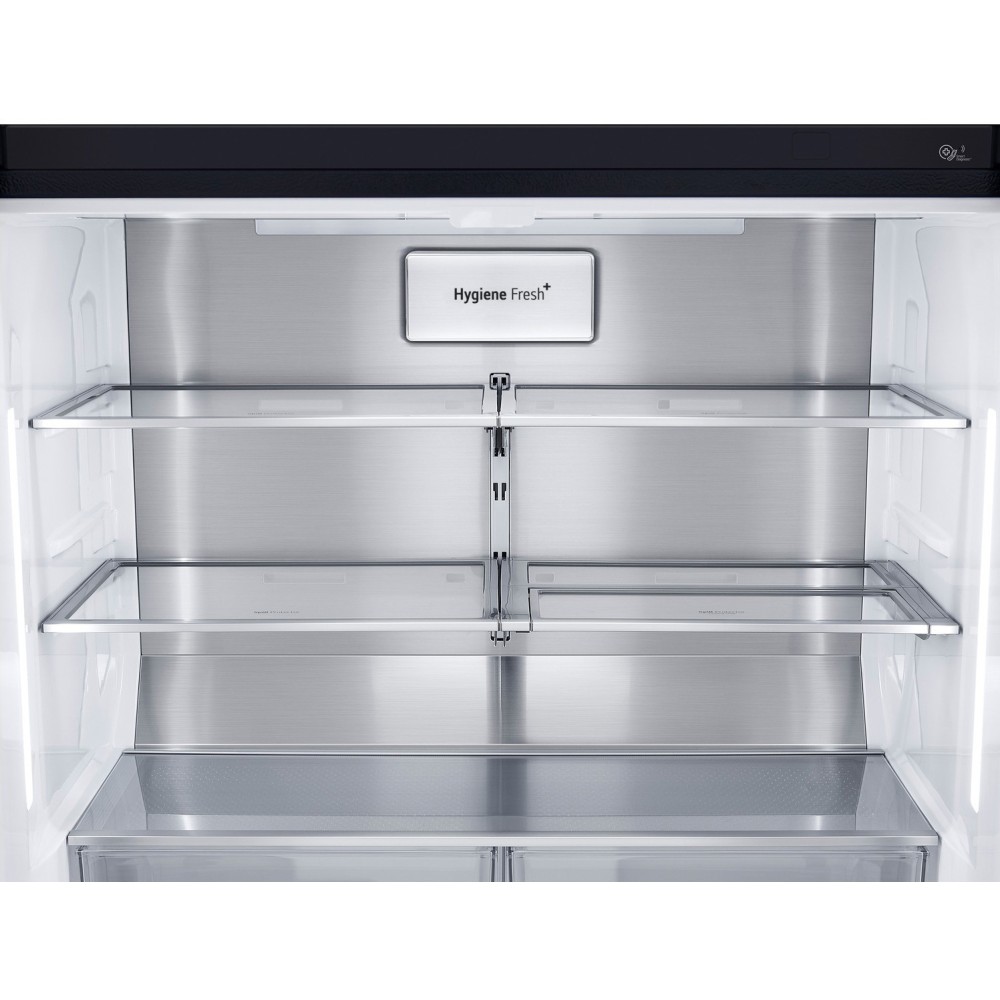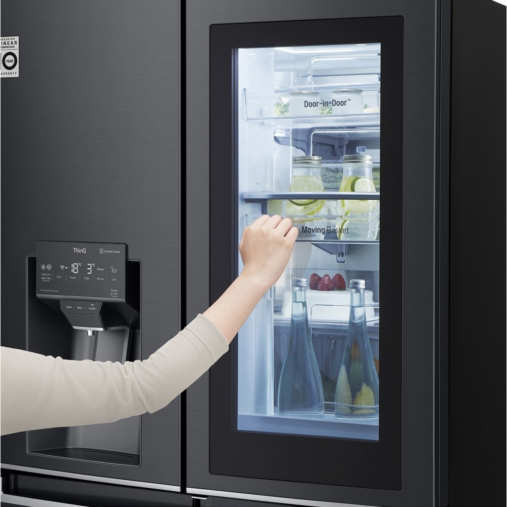یخچال فریزر مشکی ال جی GR-X31FMQHL طراحی بسیار شیک، لوکس و مینیمالی دارد و برای کسانی که آشپزخانه منزل آنها دکوراسیون مشکی یا تیره رنگ دارند، کاملا مناسب است. البته این موضوع سلیقه ای است و شما می توانید آن را با هر نوع دکوراسیونی هماهنگ کنید. بدنه این محصول از جنس استیل ضد زنگ و به رنگ مشکی مات (Matte Black) است و زیبایی خاصی دارد. دستگیره این محصول از نوع Square Pocket Handle است که به دستگیره مخفی یا پاکتی نیز معروف است. همانطور که پیش تر خدمت شما عرض کردیم، یخچال این محصول در قسمت بالا و فریزر در قسمت پایین تعبیه شده است، به همین دلیل به آن یخچال فریزر بالا پایین نیز گفته می شود. علاوه بر آن به دلیل طراحی خاصی که این محصول دارد، به یخچال فریزر فرنچ (درب فرانسوی) نیز معروف است. این یخچال فریزر 4 درب بزرگ دارد اما با توجه به اینکه دارای قابلیت درب در درب نیز می باشد، در بازار به یخچال فریزر 5 درب نیز معروف است. البته برخی فروشندگان و فروشگاه ها قابلیت درب در درب ال جی را به عنوان مینی بار نیز معرفی می کنند که البته اشتباه است. مینی بار به محفظه و درب کوچکی گفته می شود که تنها به برخی نوشیدنی ها از طریق آن دسترسی خواهید داشت اما درب در درب (Door-in-Door) به شما اجازه می دهد تا بدون باز کردن درب اصلی یخچال، به راحتی به مواد غذایی مختلف داخل بخشی از یخچال دسترسی داشته باشید؛ به این ترتیب از هدر رفت سرما تا حدود 41% جلوگیری می شود و در مصرف انرژی نیز صرفه جویی خواهد شد. برای استفاده از قابلیت Door In Door و دسترسی به آن یک اهرم کوچک در قسمت دستگیره یخچال وجود دارد که با فشردن آن می توانید به راحتی به داخل یخچال دسترسی داشته باشید. ال جی از یک قفسه قابل تنظیم به نام Moving Basket نیز در این بخش استفاده نموده است که در بازار به آن قفسه آسانسوری نیز گفته می شود. شما می توانید این قفسه را به سمت پایین یا بالا حرکت داده و حتی به مواد غذایی با ابعاد بزرگ تر نیز در داخل یخچال دسترسی داشته باشید. یکی از جذاب ترین بخش های این محصول، اینستاویو (InstaView) آن می باشد. ال جی روی قسمت درب در درب این محصول یک صفحه شیشه ای تعبیه کرده است که با دو بار ضربه زدن روی آن یا به اصطلاح Knock, Knock (مانند در زدن) چراغ داخل یخچال روشن شده و شما بدون اینکه درب یخچال را باز کنید، می توانید داخل آن را مشاهده کنید. این موضوع باعث می شود تا مواد غذایی مد نظر خود را قبل از باز کردن درب یخچال مشاهده نمایید و سپس درب یخچال را باز کرده و در سریع ترین زمان ممکن مواد غذایی را از داخل یخچال بردارید. این ویژگی باعث هدر رفت سرمای کمتر و صرفه جویی در مصرف انرژی می شود و از نظر ظاهری نیز جلوه زیبایی به محصول داده و باعث زیباتر شدن آشپزخانه شما نیز خواهد شد. همانطور که پیش تر نیز عرض کردیم، این یخچال فریزر دارای آب ریز و یخ ریز است و برای تامین آب مورد نیاز به لوله کشی آب شهر متصل می شود و مخزن ندارد؛ به این ترتیب نیاز نیست نگران خالی شدن مخزن آب آن باشید و همیشه به آب و یخ تمیز و بهداشتی دسترسی خواهید داشت. شما می توانید از پنل کنترلی روی درب یخچال مشخص کنید که احتیاج به آب دارید یا یخ و سپس لیوان یا ظرف مورد نظر خود را در زیر آب ریز و یخ ریز قرار داده و اهرم آن را فشار دهید تا با توجه به نیاز شما عمل کرده و ظرف شما را پر کند. این یخچال فریزر دارای یخ ساز اتوماتیک (SpacePlus Ice System) است که ابعاد باریکی دارد و فضای بسیار کمی را از یخچال اشغال می کند. این محصول تکنولوژی Bio Shield (Gasket) نیز دارد که در واقع واشر و لاستیکی است که دور درب یخچال فریزر وجود دارد و مانع از عبور هوای سرد به بیرون می شود؛ این لاستیک و واشر ضد باکتری است و شما می توانید آن را جدا کرده و شستشو نیز دهید.